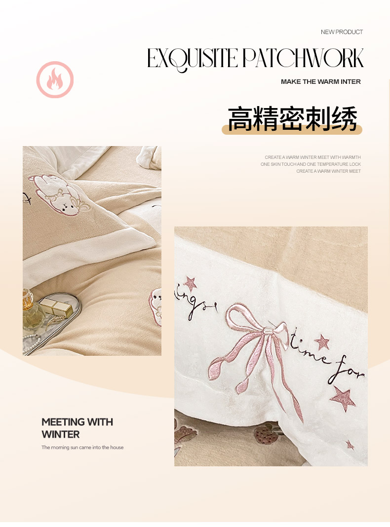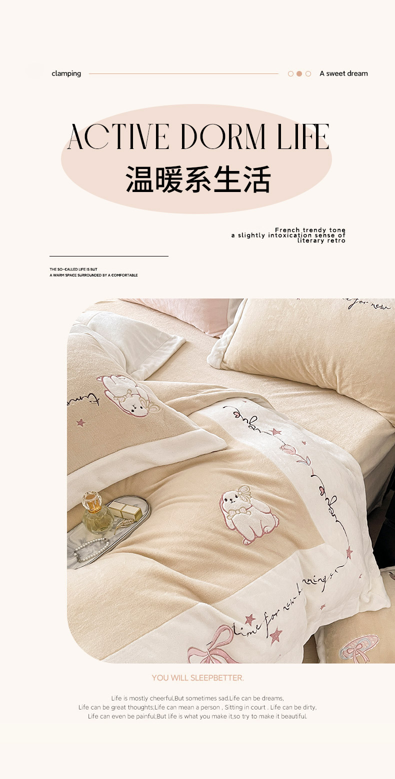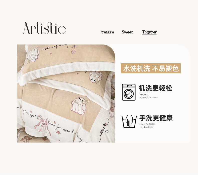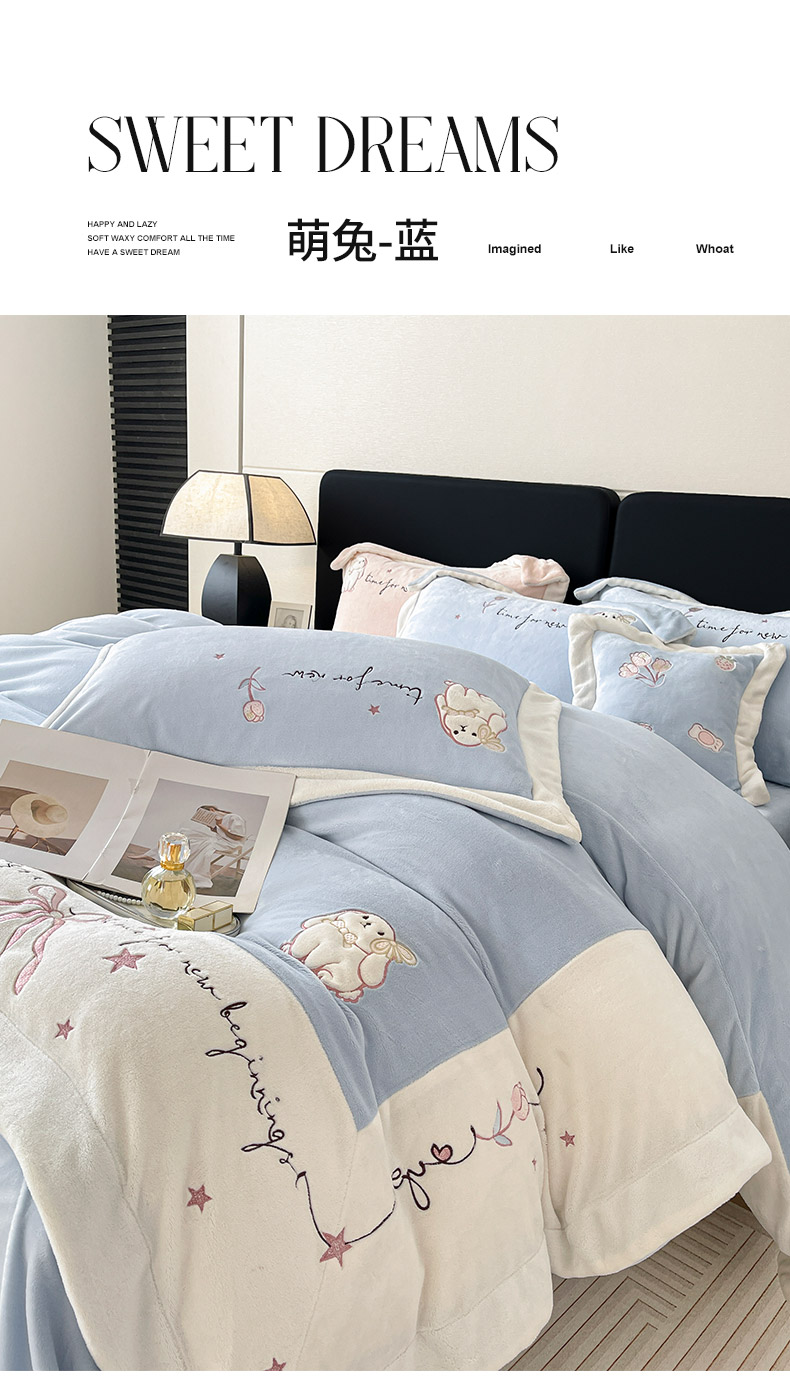商品名称: 2025冬季爆款A类加厚牛奶绒四件套保暖双面加绒珊瑚绒重工刺绣被套床单卡通床上用品 萌兔-咖