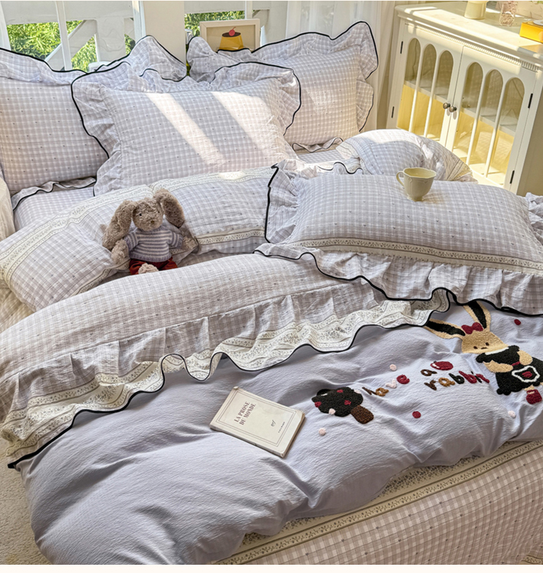 麋兔 2025新款双层纱毛巾绣花边四件套 苹果免
