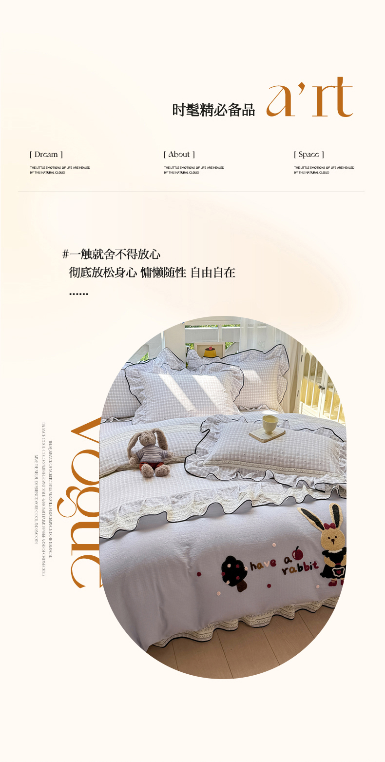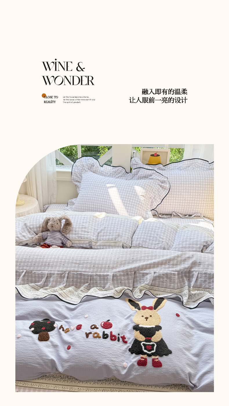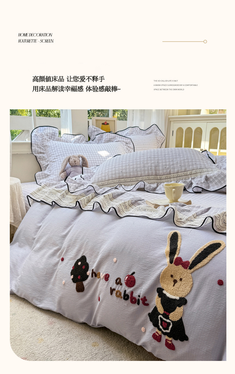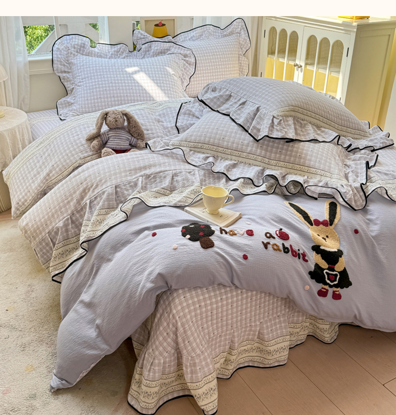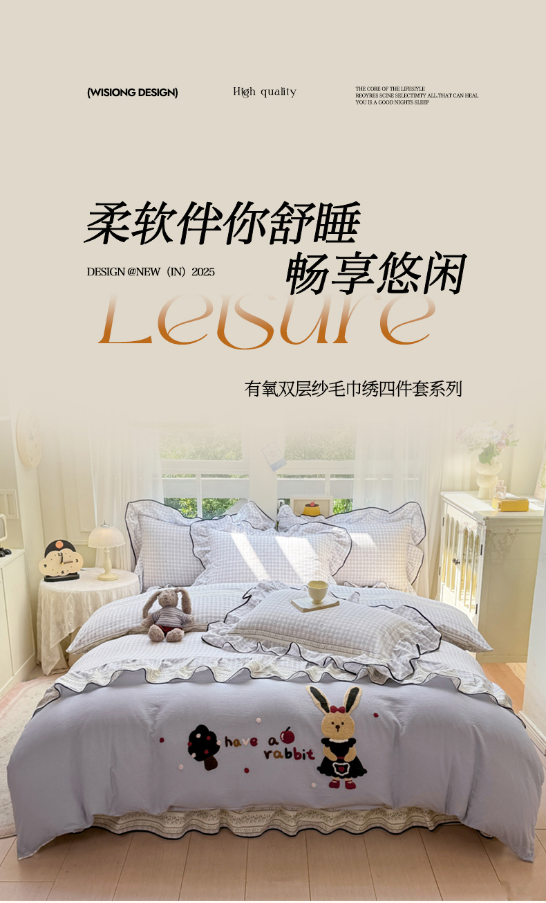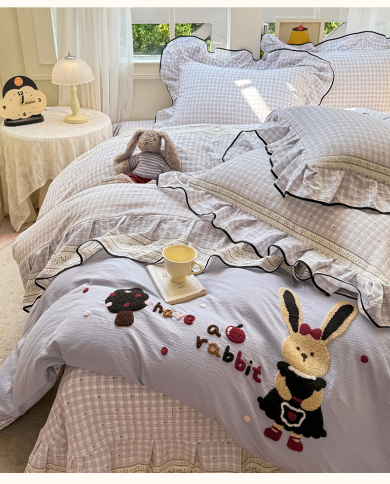 (总)麋兔 2025新款双层纱毛巾绣花边四件套,巴克兔,恐龙,熊熊小队,旺财,苹果免,欢乐公主
