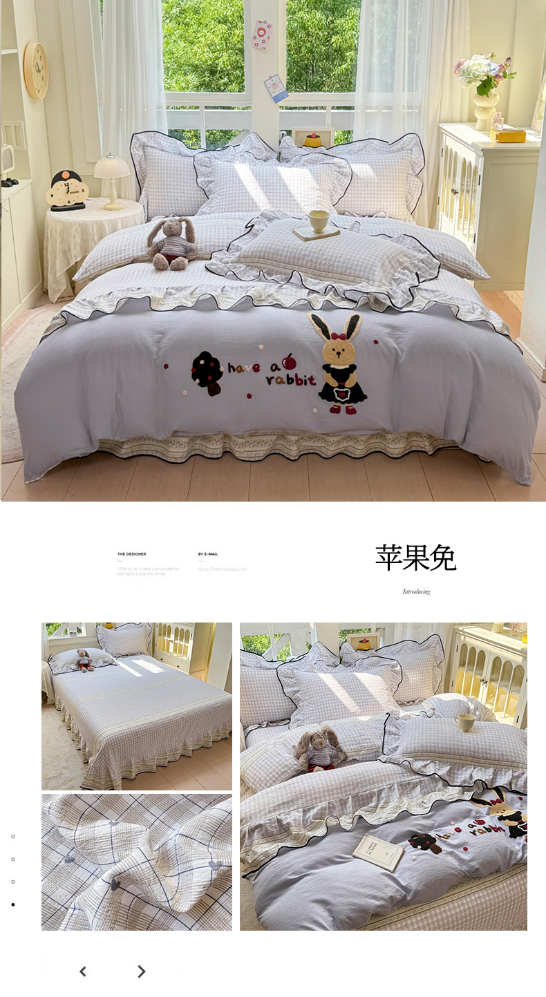 商品名称:麋兔 2025新款双层纱毛巾绣花边四件套 苹果免