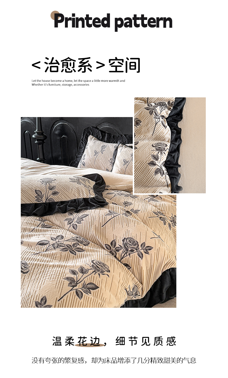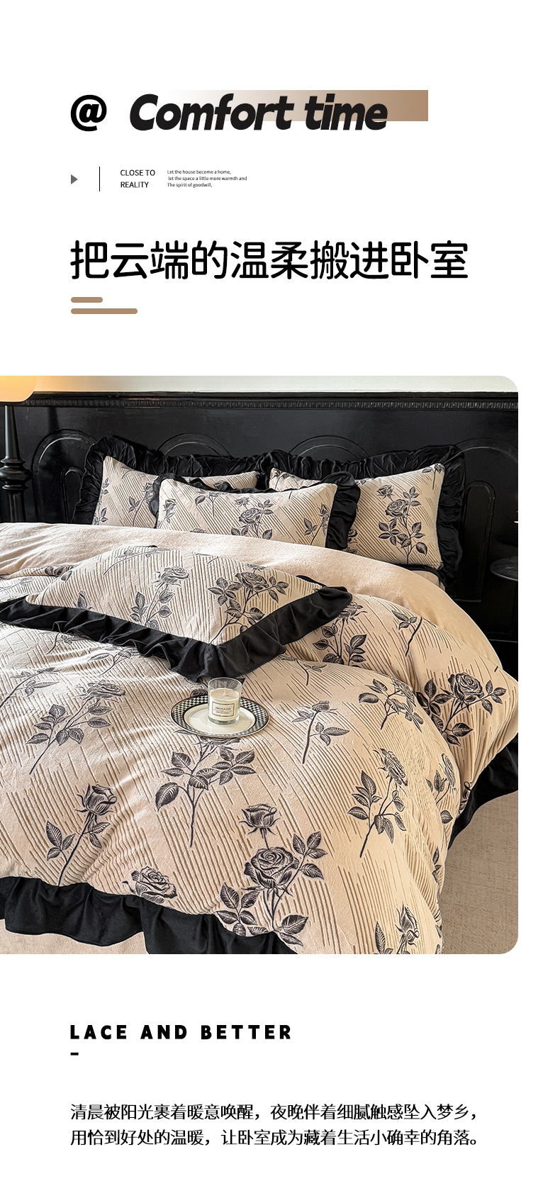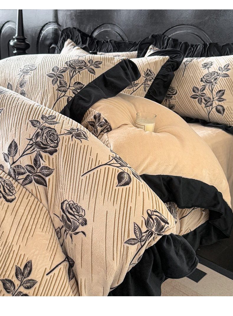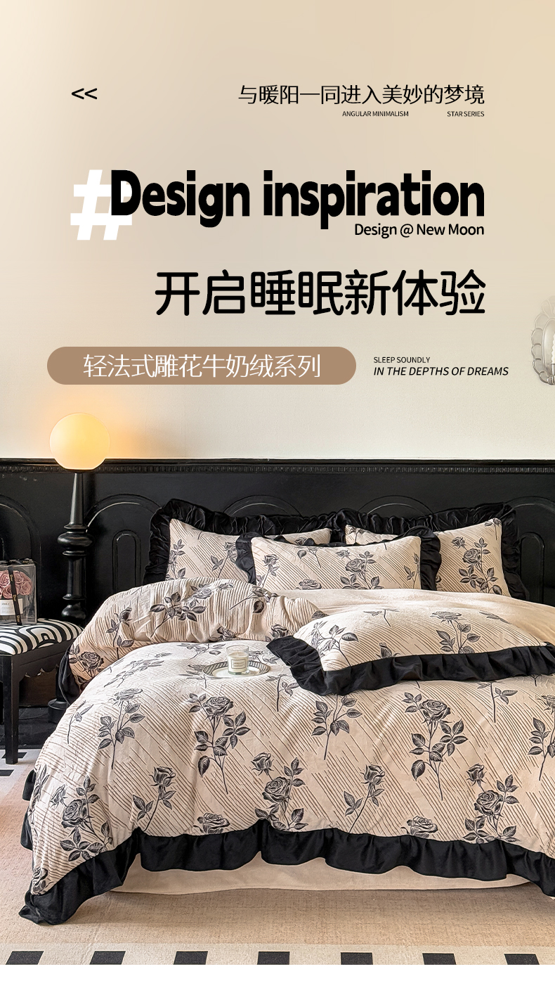 商品名称:宅家居 2025新款热卖热款轻法式复古赫本风绒高克重浮雕花牛奶绒四件套烂花韩版黑色花边三件套 壹枝玫瑰