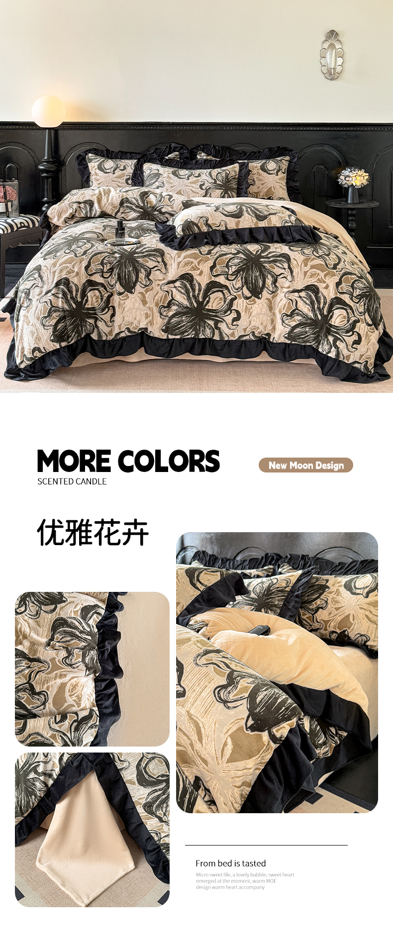 (总)宅家居 2025新款热卖热款轻法式复古赫本风绒高克重浮雕花牛奶绒四件套烂花韩版黑色花边三件套,丛林迷影,蝶之花语,花恋密语,叶语悠然,蝶舞恋曲,花岸澜庭,壹枝玫瑰,夜半花香,优雅花卉
