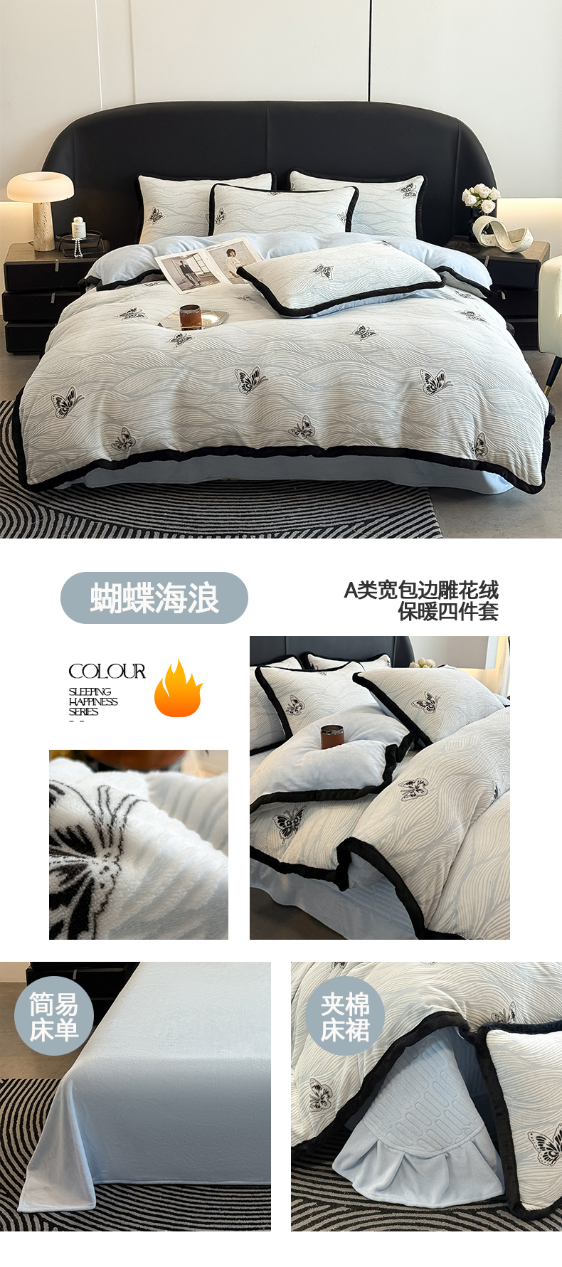 当前位置: 91家纺网 > 商品网购 > 床品套件 > 四件套 > 其它四件套 > 懒猫家纺 2025新款宽包边雕花绒四件套 蝴蝶海浪