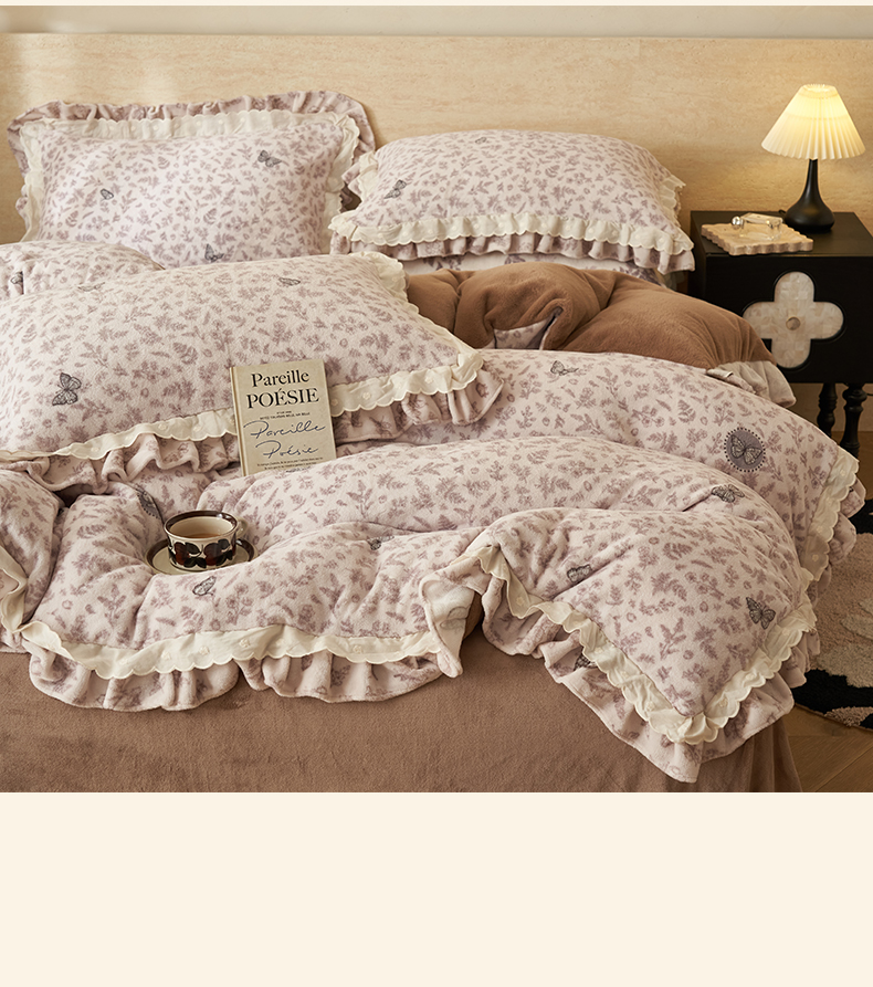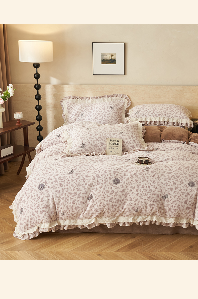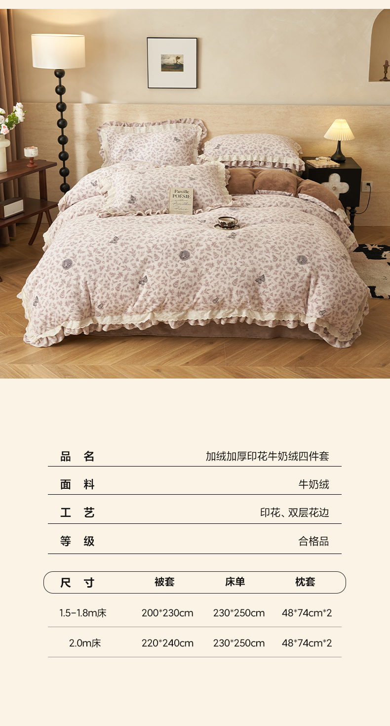 商品名称:(总)晨曦家纺 2025新款加绒加厚230克少女风双层花边牛奶绒印花四件套