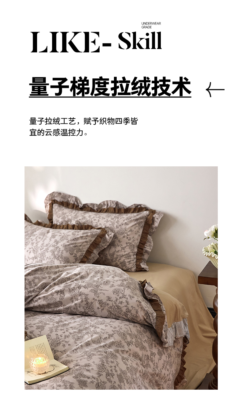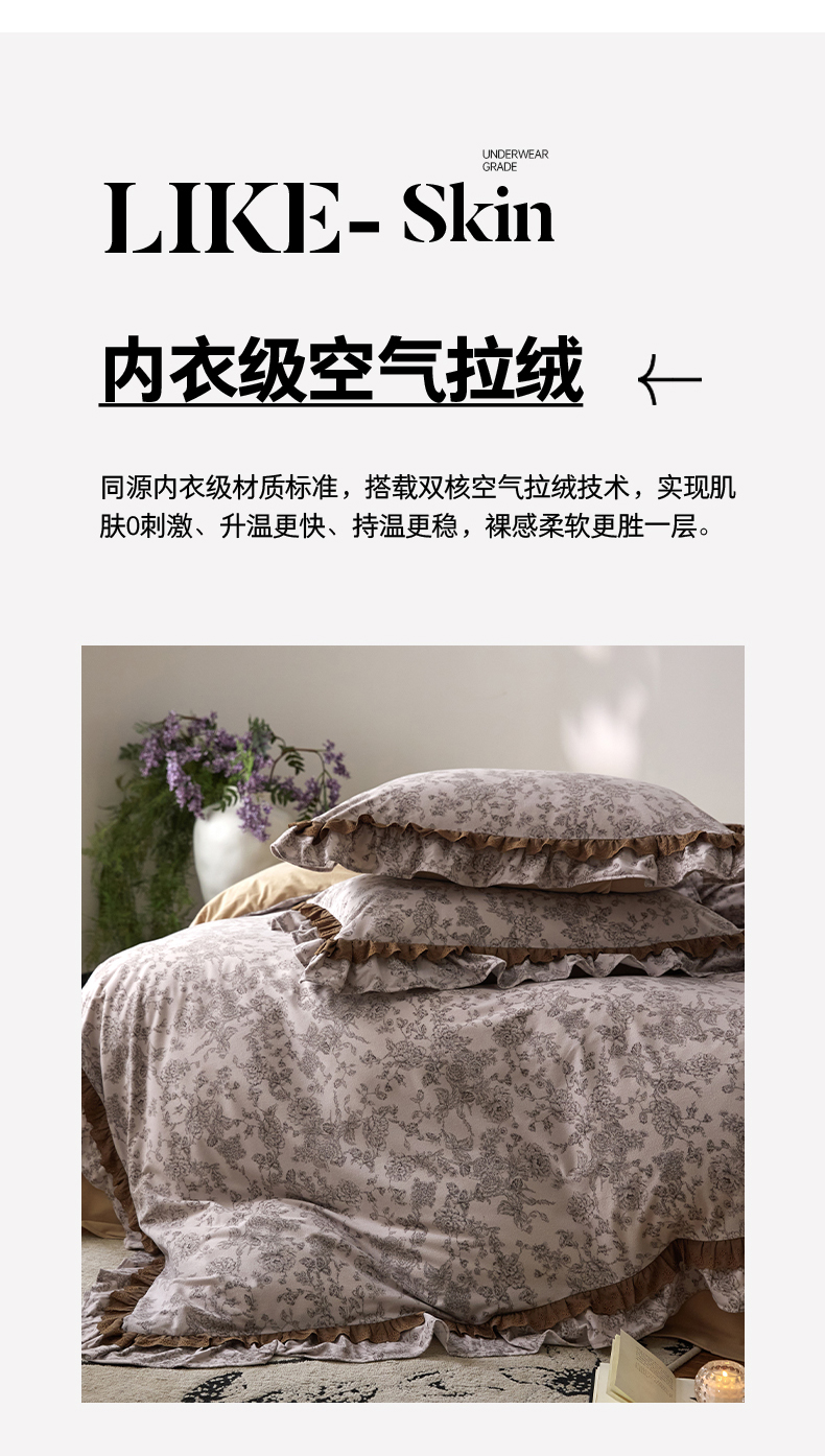 商品名称:金奇达家纺 2025新款A类保暖羽零™空气拉绒加厚法式荷叶边四件套热肤膜【森屿集】(会员减50元) 热肤膜【森屿集】系列,标准号全网控价(折后券后)不低于228元 绿屿浮光