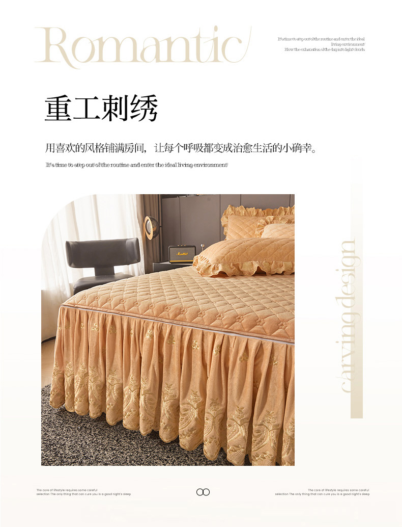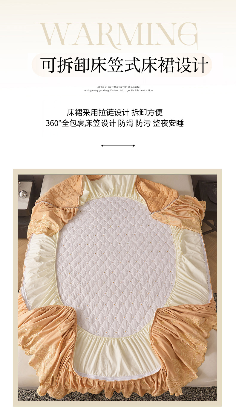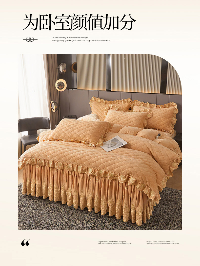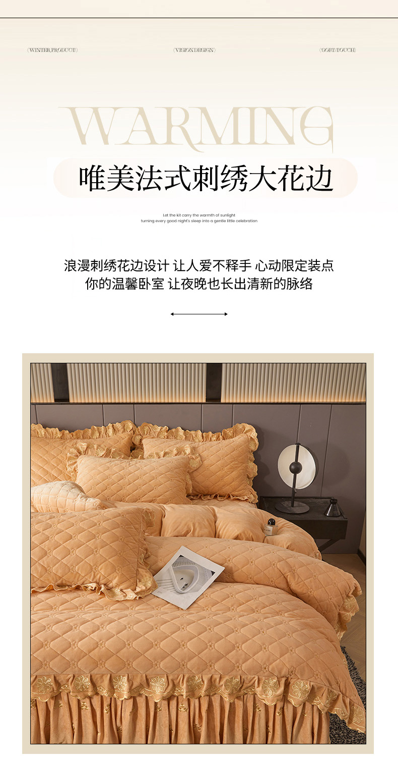 当前位置: 91家纺网 > 商品网购 > 床品套件 > 四件套 > 其它四件套 > 罗艺轩 2025新款婴儿绒加厚保暖床裙式四件套-心语 心语-香槟金