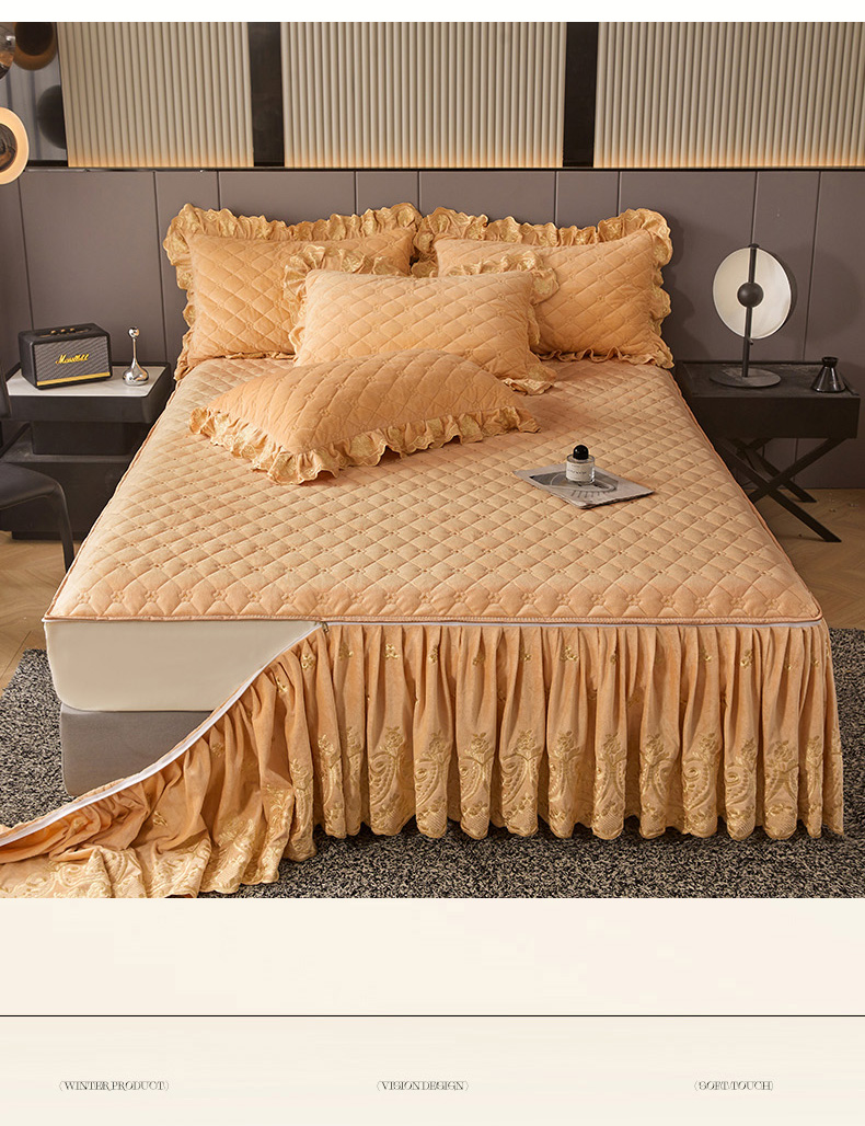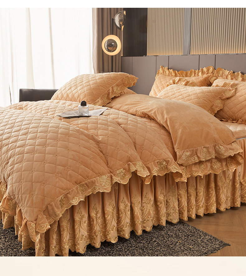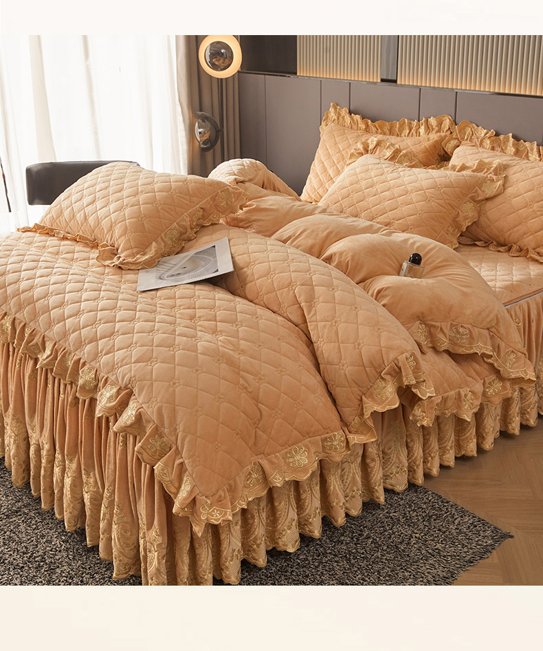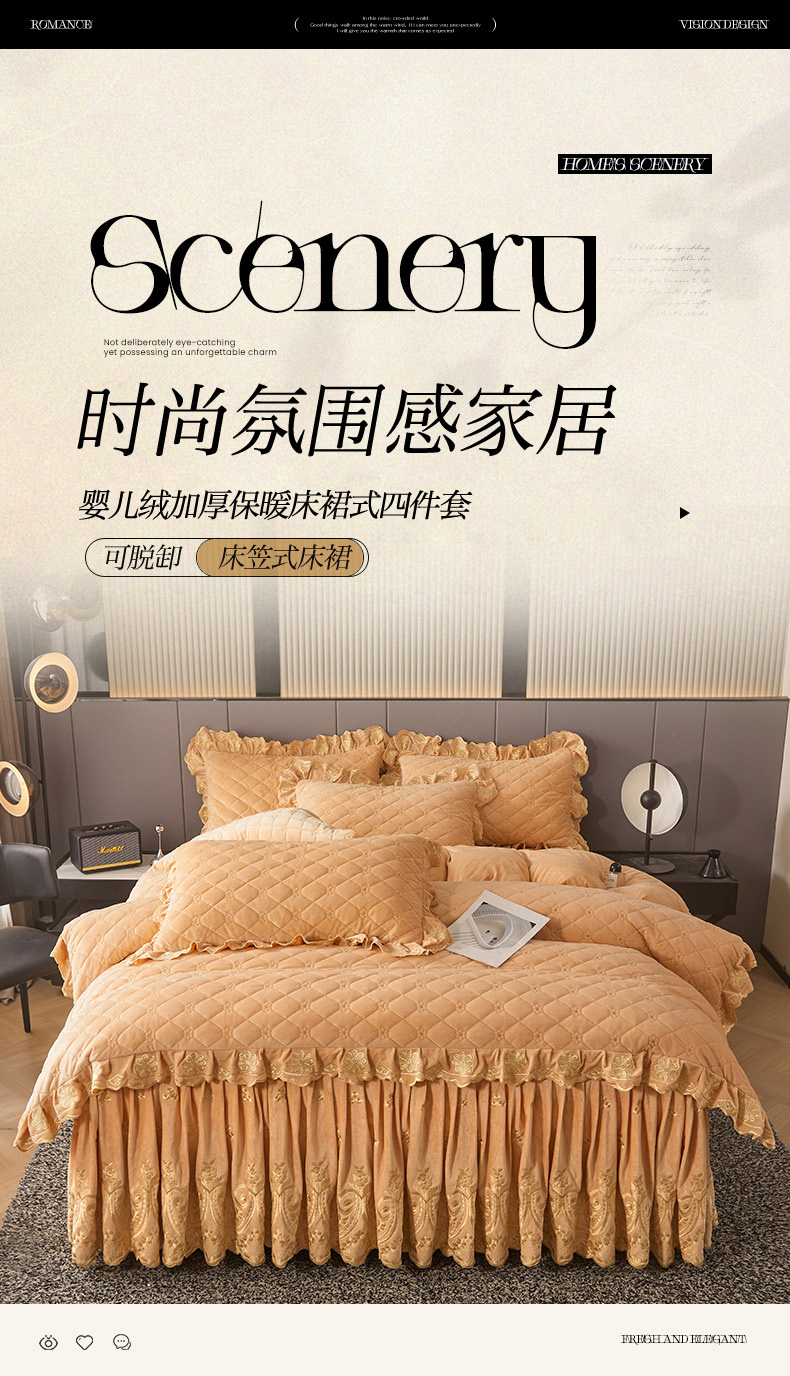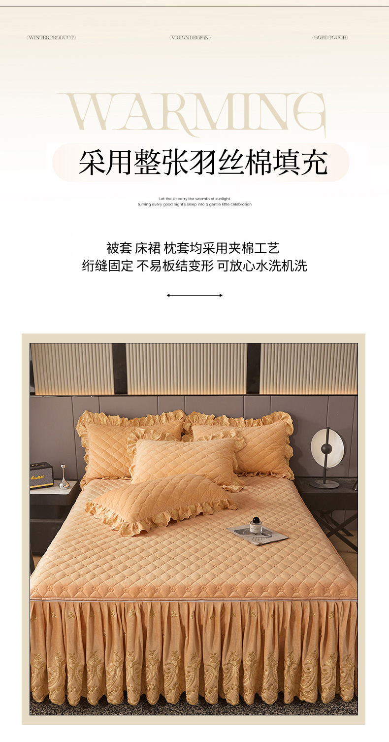 当前位置: 91家纺网 > 商品网购 > 床品套件 > 四件套 > 其它四件套 > 罗艺轩 2025新款婴儿绒加厚保暖床裙式四件套-心语 心语-香槟金