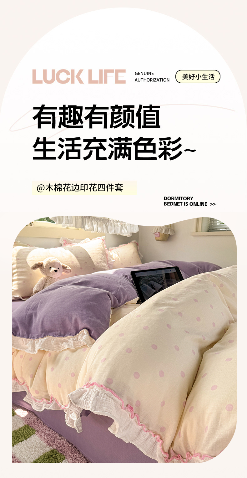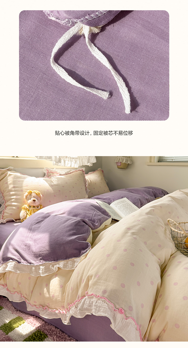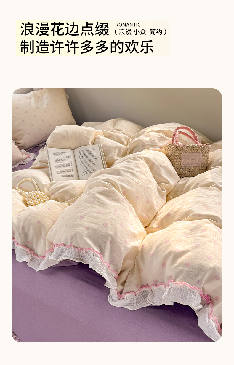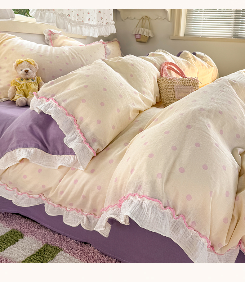 当前位置: 91家纺网 > 商品网购 > 床品套件 > 四件套 > 其它四件套 > 繁花家居 2025新款高弹线云感木棉多层纱花边超软四件套 波点-粉