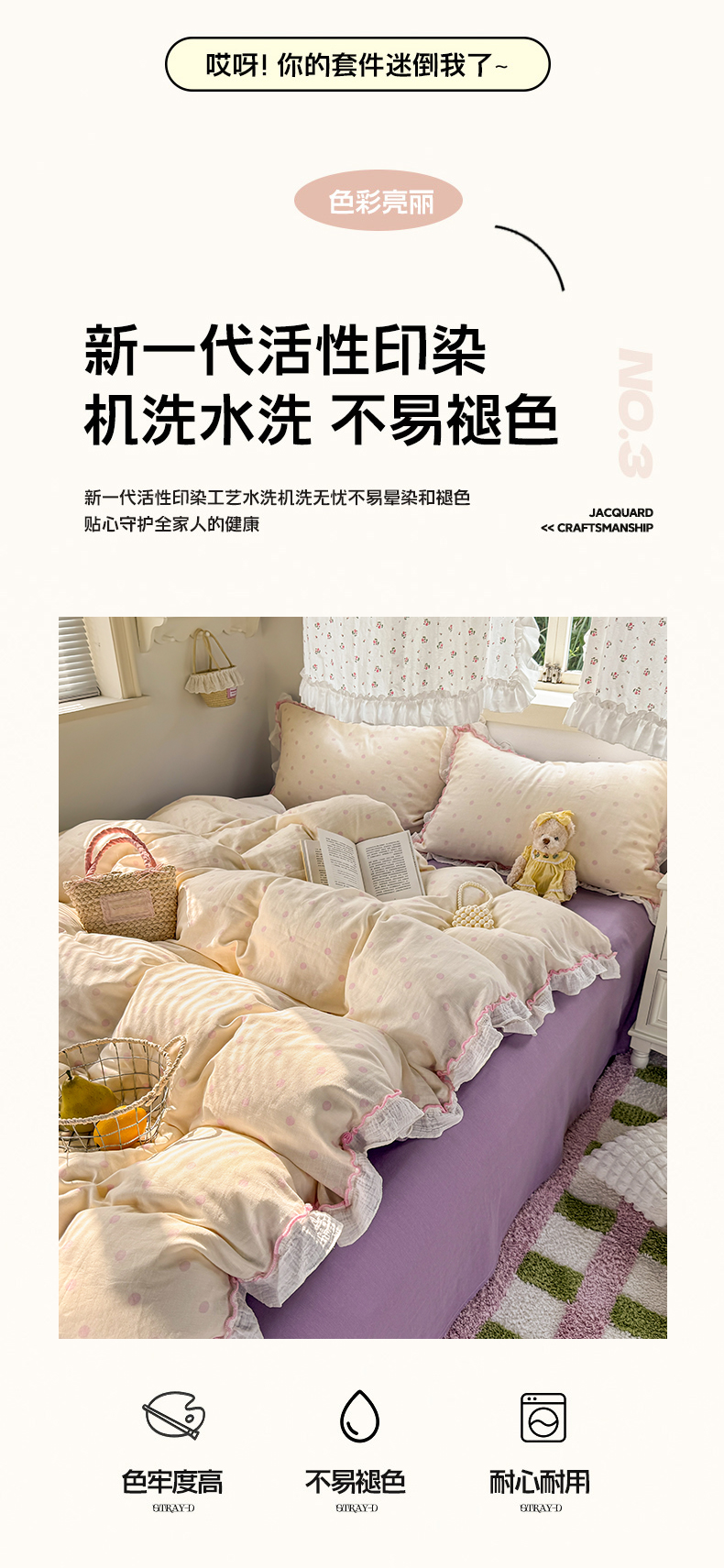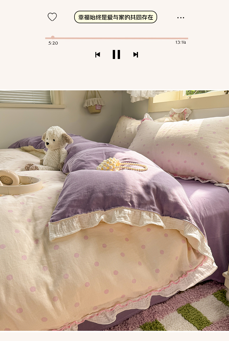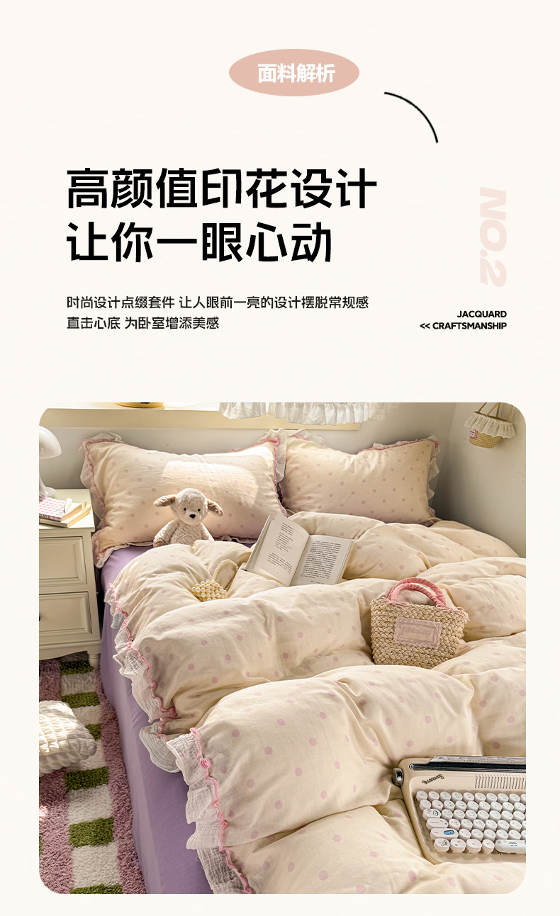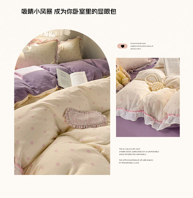 当前位置: 91家纺网 > 商品网购 > 床品套件 > 四件套 > 其它四件套 > 繁花家居 2025新款高弹线云感木棉多层纱花边超软四件套 波点-粉