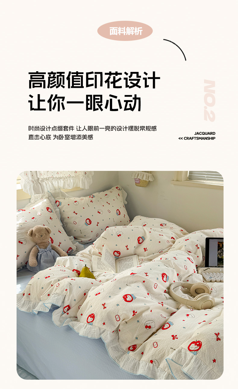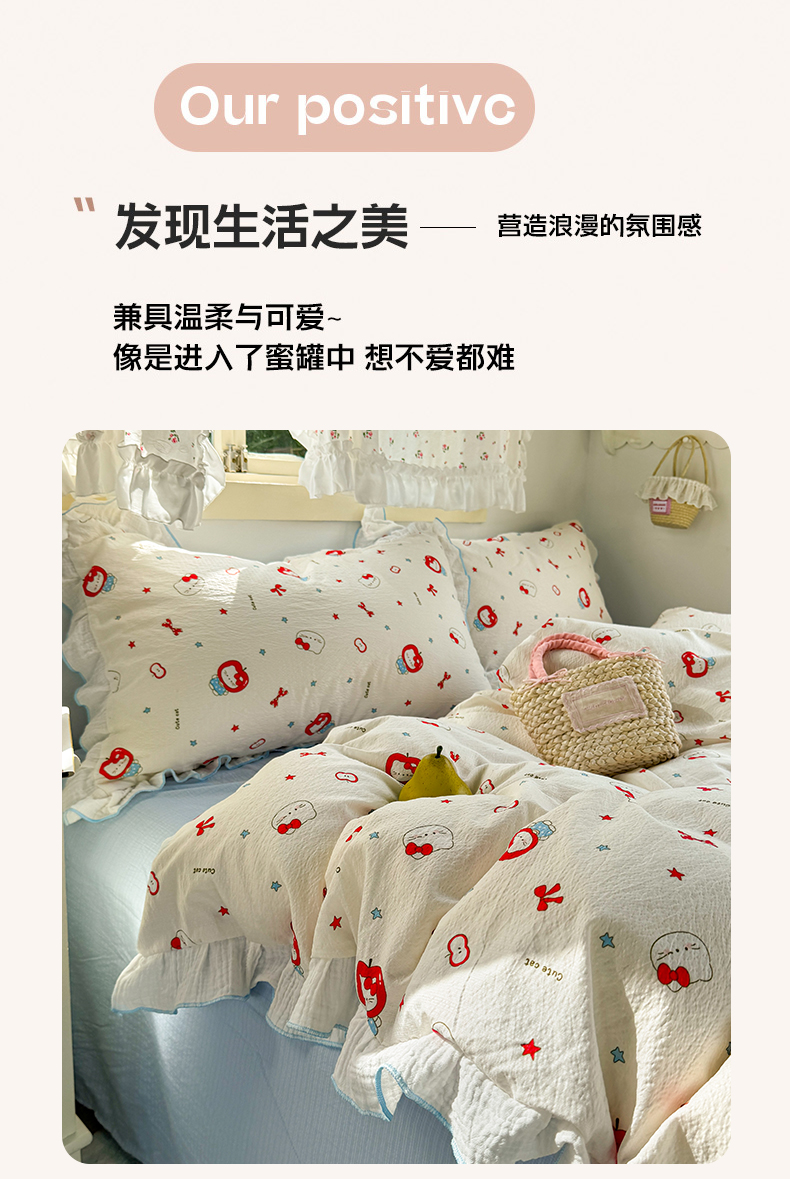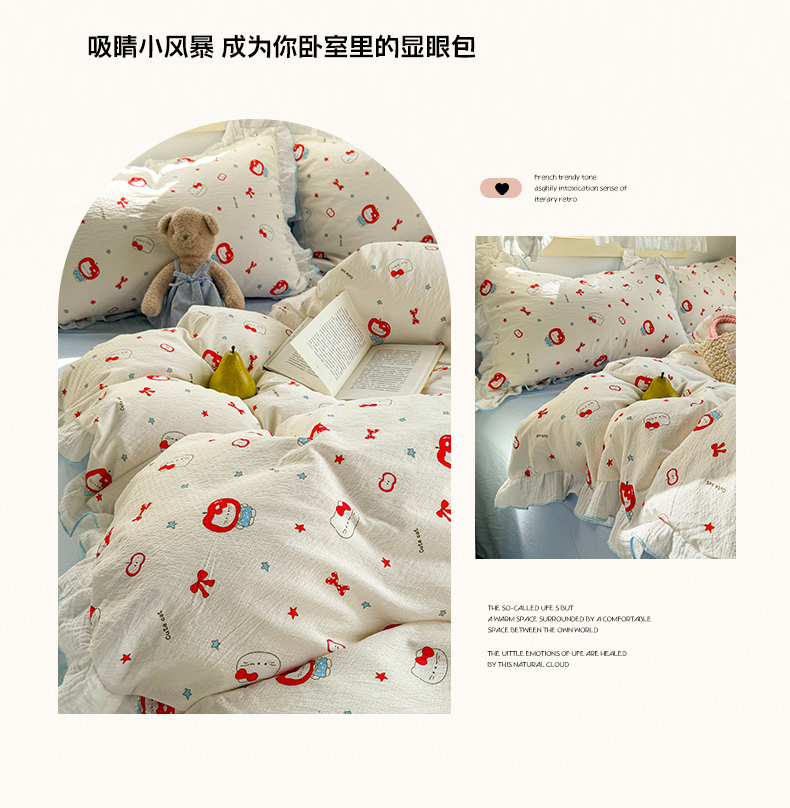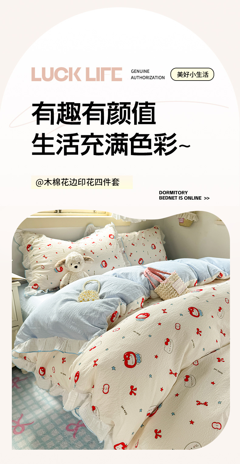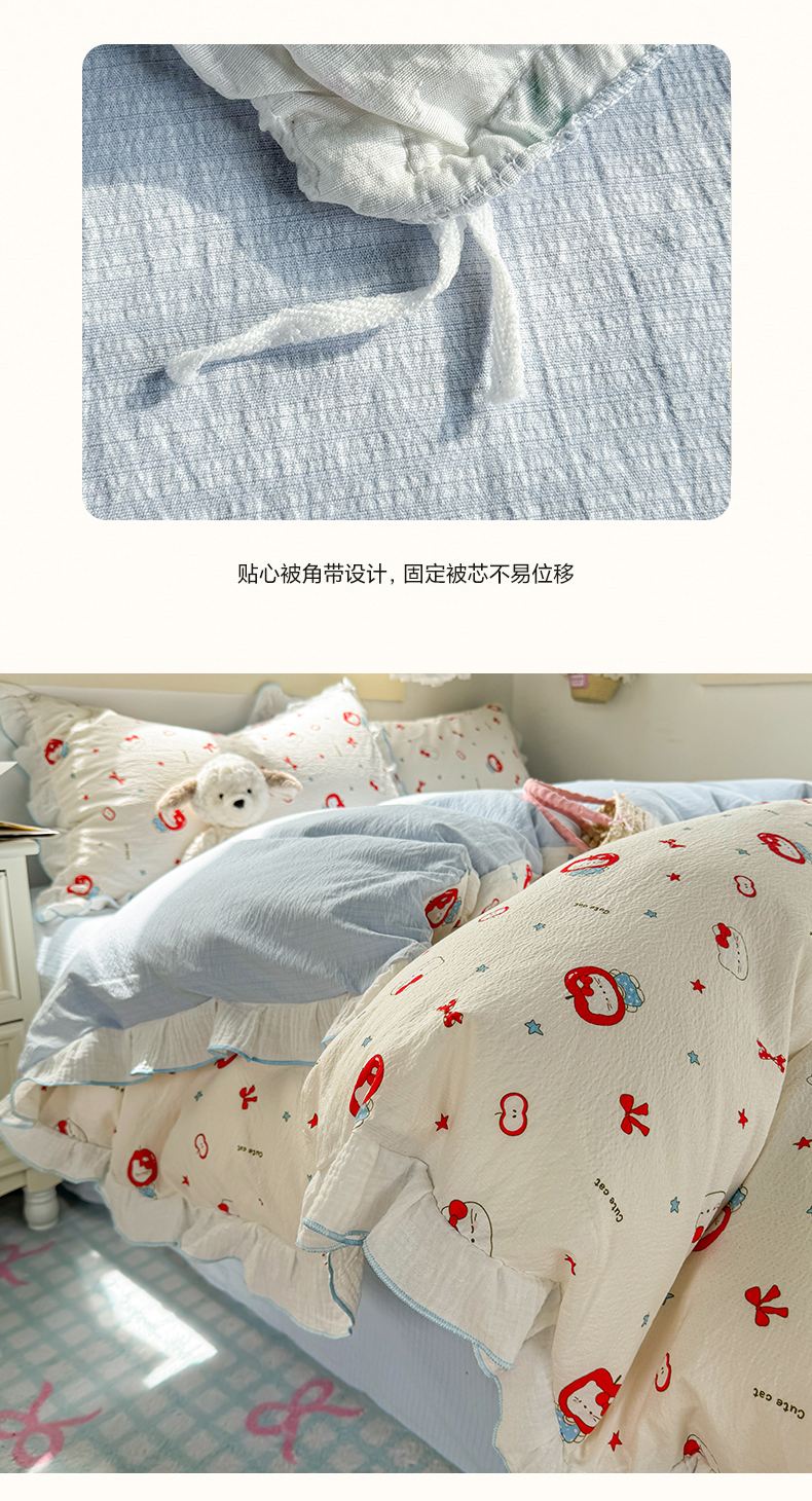 当前位置: 91家纺网 > 商品网购 > 床品套件 > 四件套 > 其它四件套 > 繁花家居 2025新款高弹线云感木棉多层纱花边超软四件套 小猫苹果