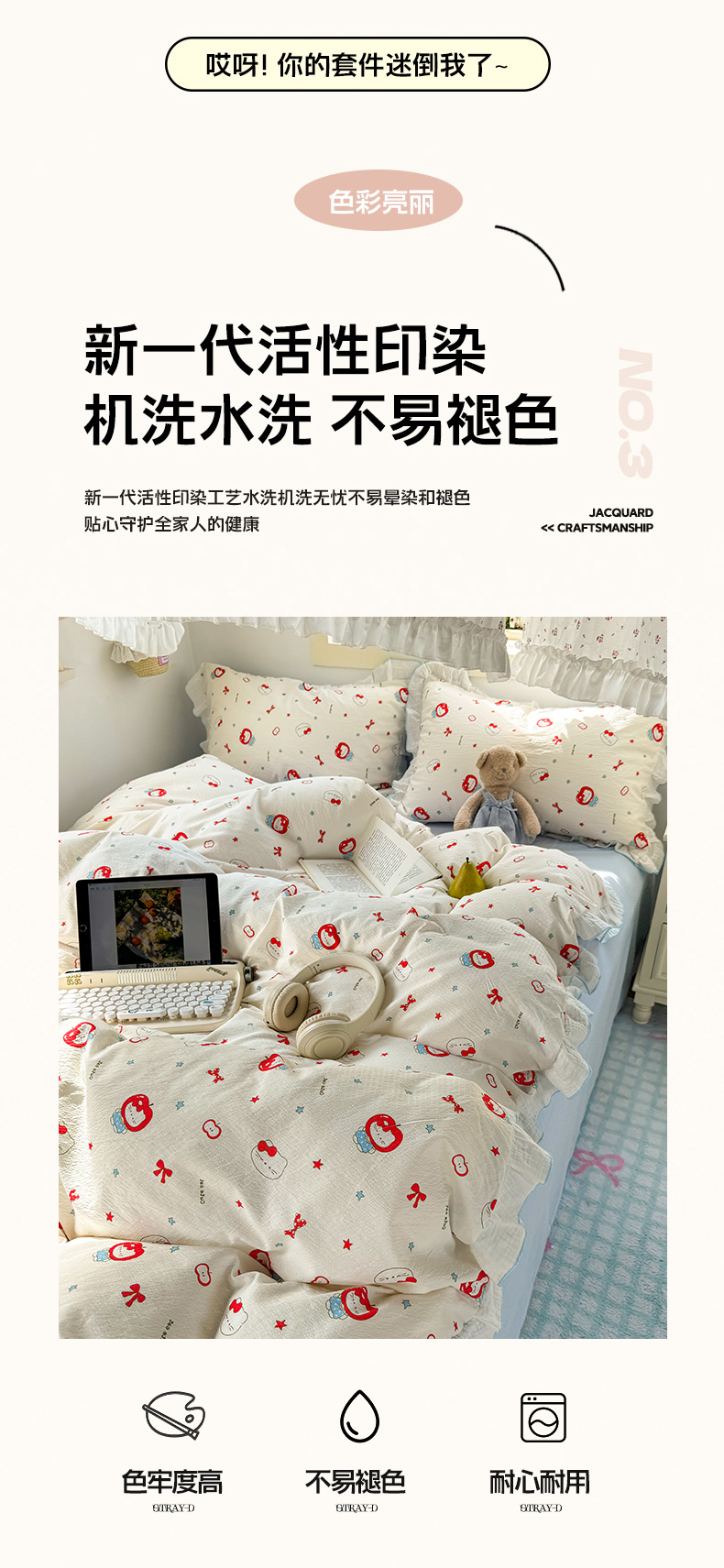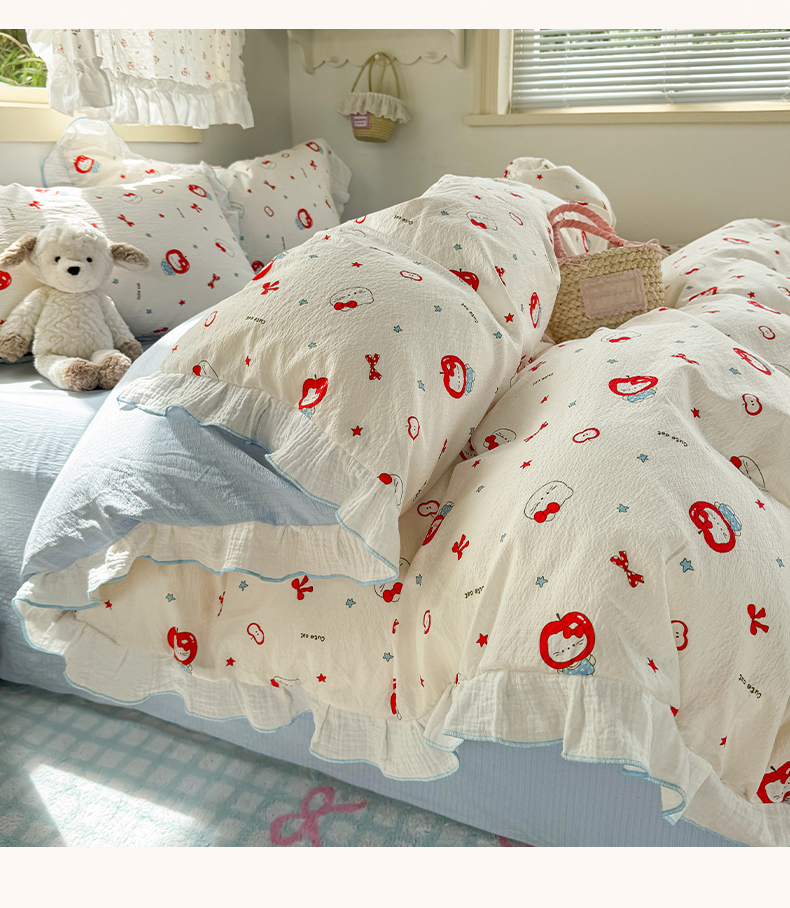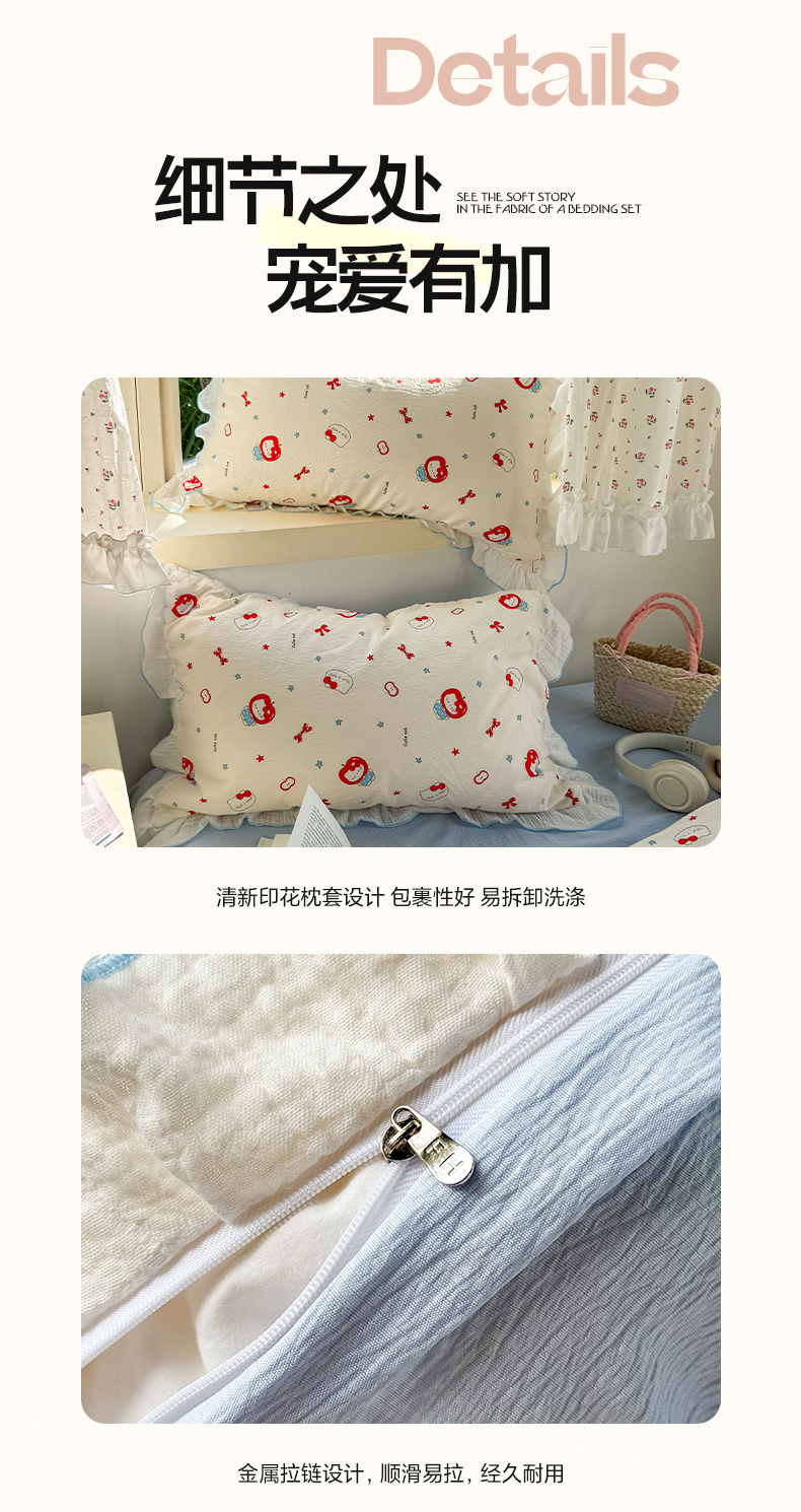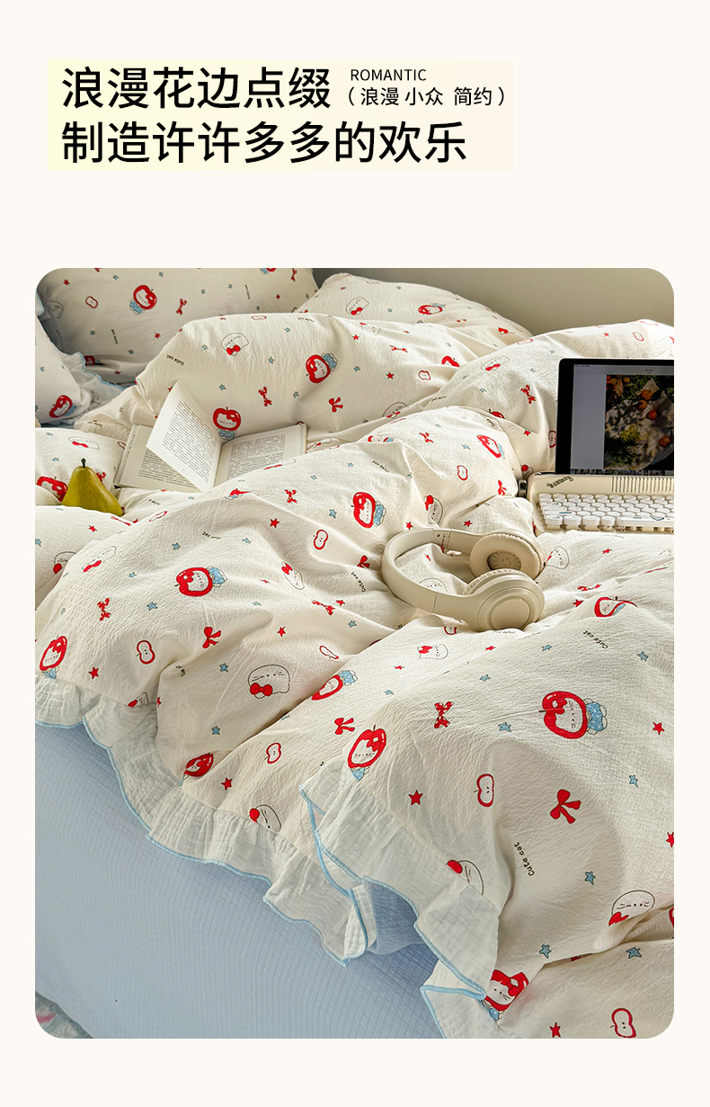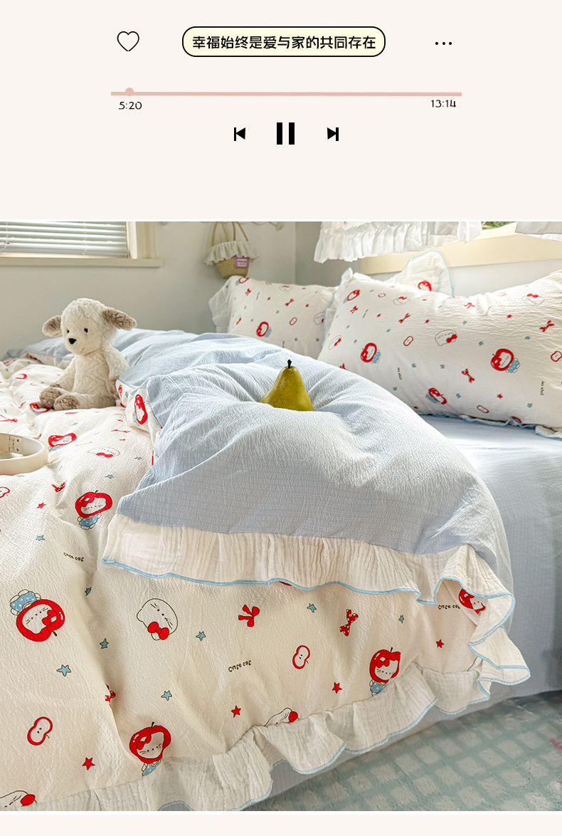 当前位置: 91家纺网 > 商品网购 > 床品套件 > 四件套 > 其它四件套 > 繁花家居 2025新款高弹线云感木棉多层纱花边超软四件套 小猫苹果