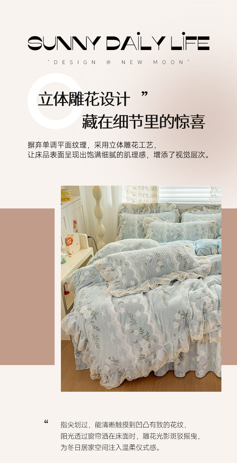 当前位置: 91家纺网 > 商品网购 > 床品套件 > 四件套 > 牛奶绒四件套 > 家之硕家纺 2025新款立体雕花可拆洗牛奶绒床裙四件套 田园生活