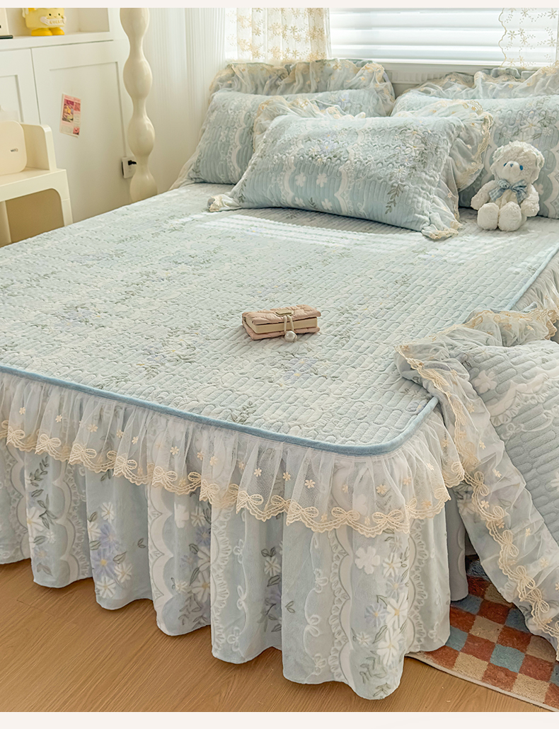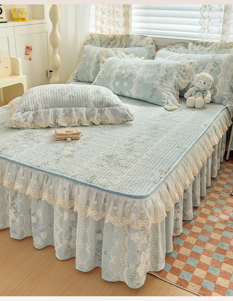 (总)家之硕家纺 2025新款立体雕花可拆洗牛奶绒单床裙系列,爱莎粉,安妮绿,彩虹糖-浅蓝,花韵,秘密花园,田园生活