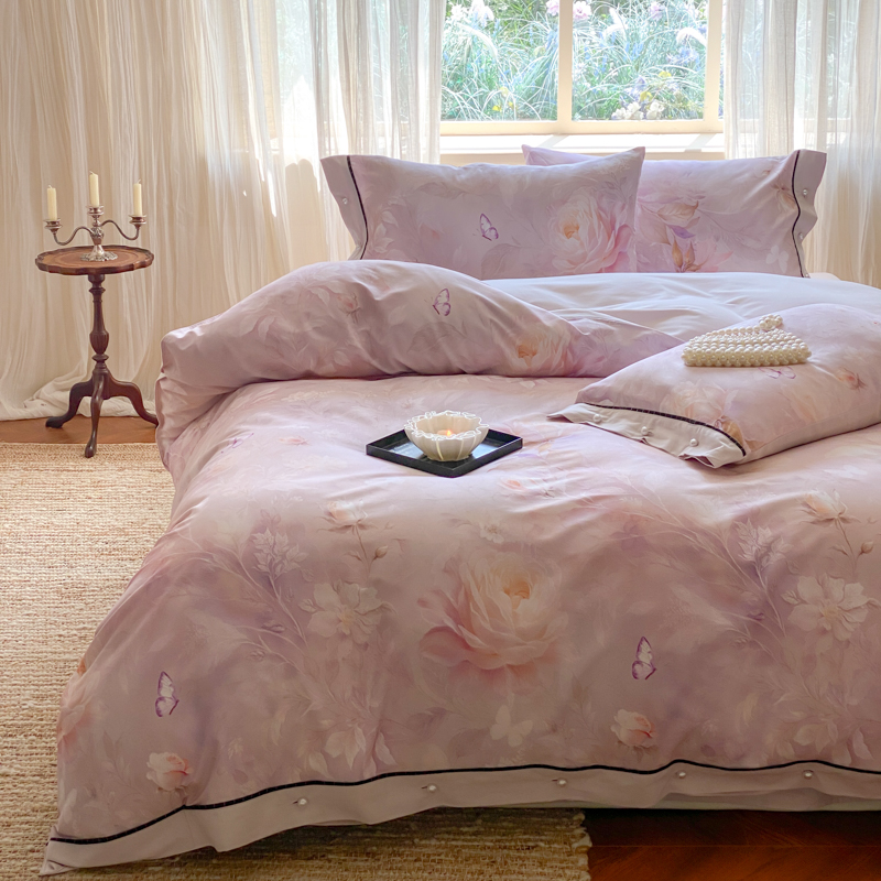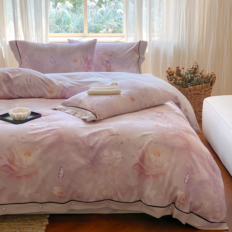 薏思家纺 2025新款全棉100支数码印花生态磨毛轻奢款四件套-珍珠纽扣系列 紫纱春日