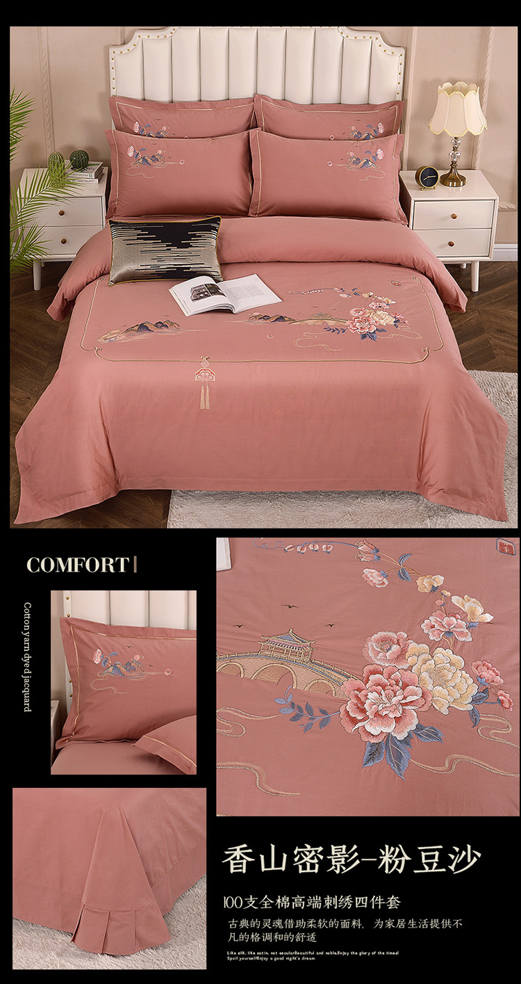 (总)浩情国际2026新款100S长绒棉高端刺绣四件套,花之曼-大红,花之曼-豆沙,花之曼-粉玉,花之曼-灰豆绿,花之曼-孔雀绿,花之曼-兰灰,花之曼-驼色,花之曼-紫豆沙