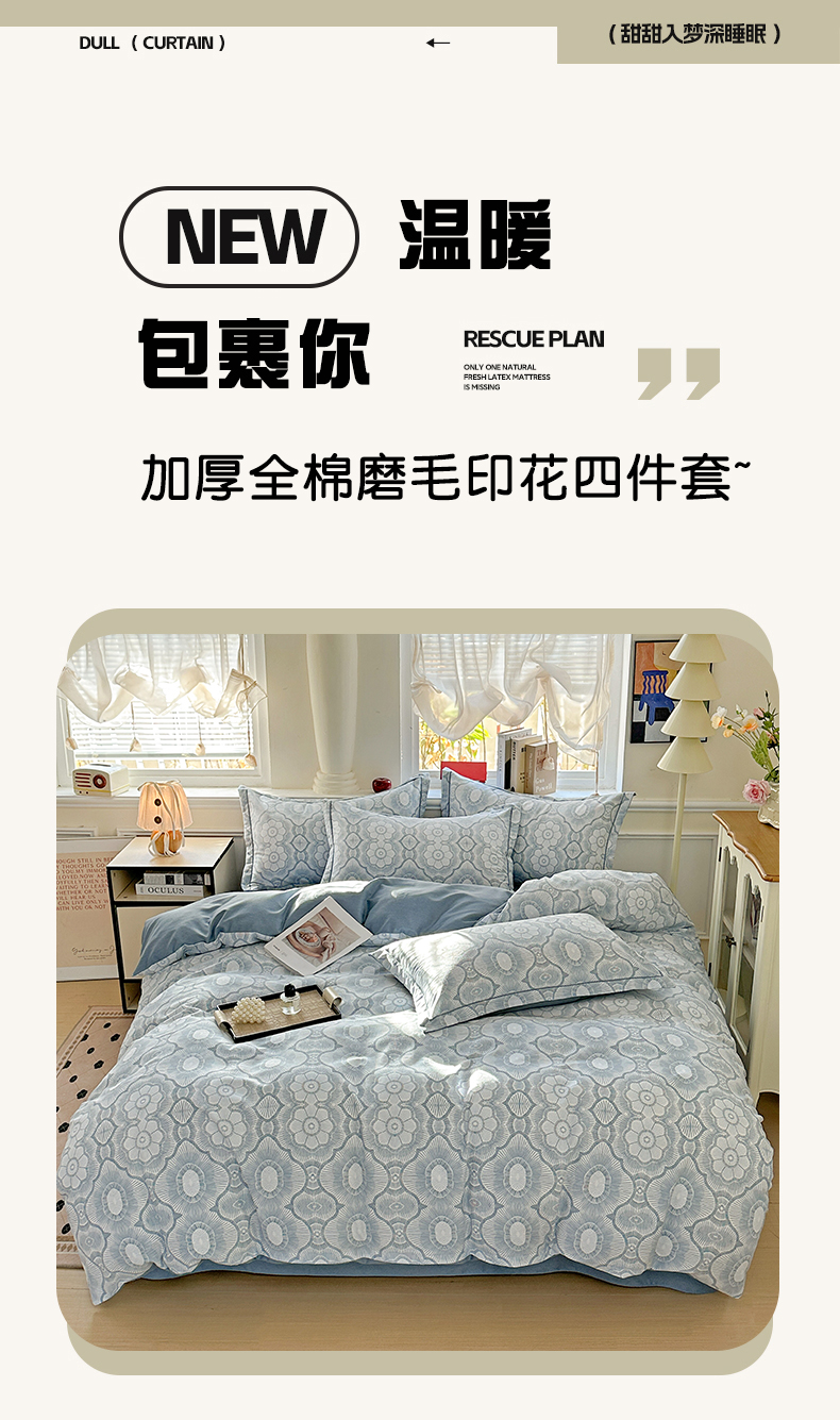 (总)曲之慕 2026新款全棉纯棉加厚喷气磨毛印花四件套,浅花悠悠,林见兔,波西米亚,花舞悠然,卡尼亚,克莱尔,米莱,米莱-兰,米莱-紫,向阳花开,南瓜屋,爱意浓,吾安心,登威熊,芬迪,花恬,花意,空间,晚秋,幽羽,费洛斯,浅香,秋叶,啬园,汀兰,云梦泽,艾格拉,蓝汐,蓝漾,萝莉,暖漾,绮梦,青枝语,秋韵,柔晖,絮语,紫韵,爱意花间,花蕊粉,四叶草,幽梦玉