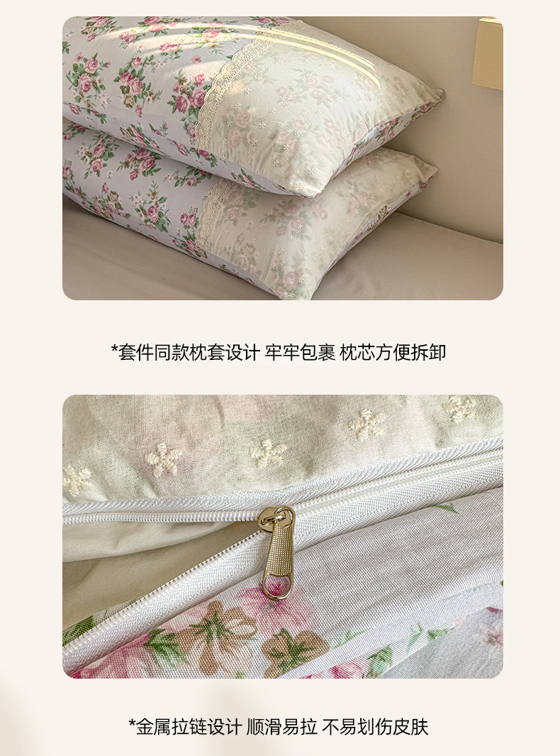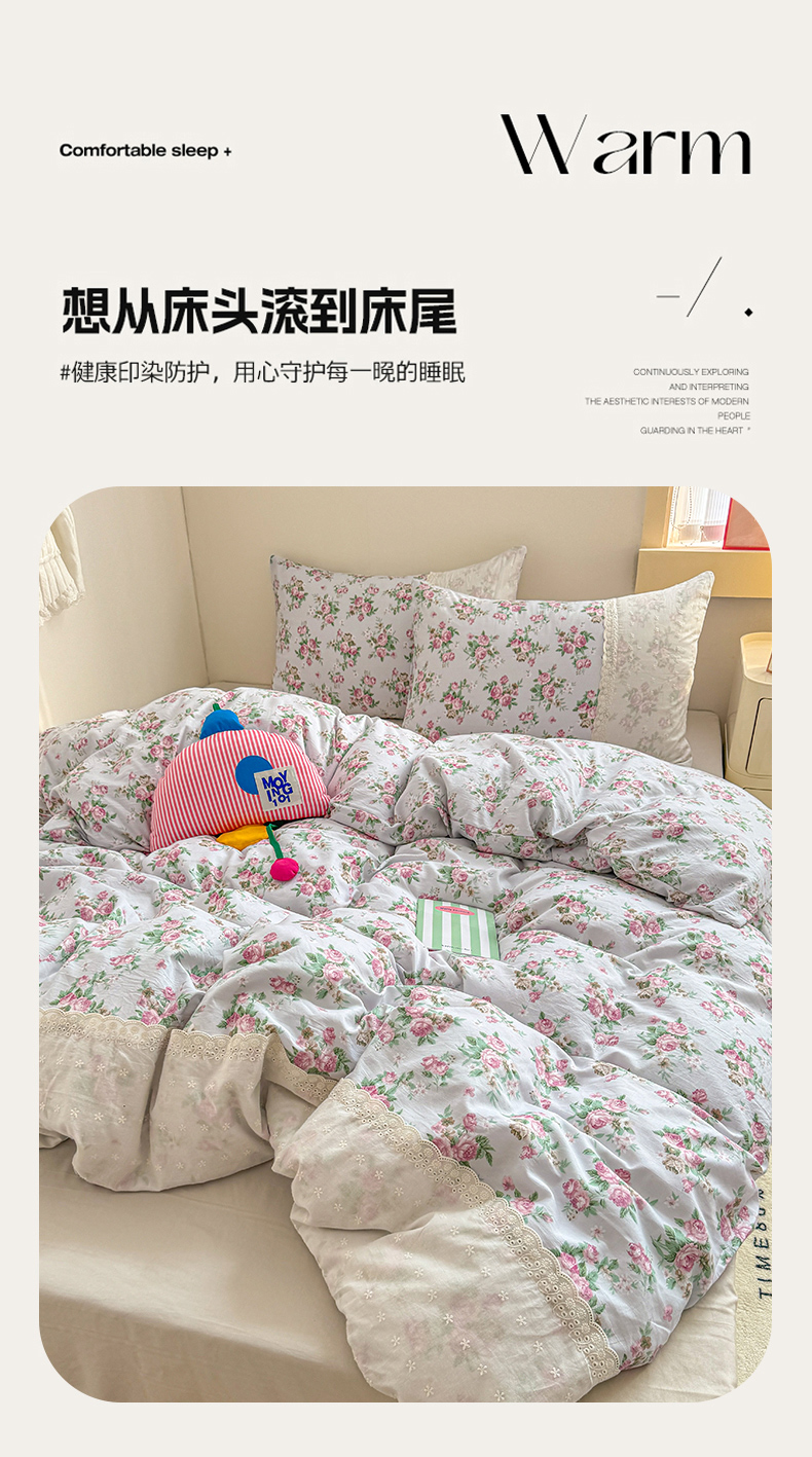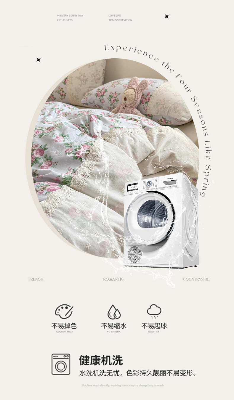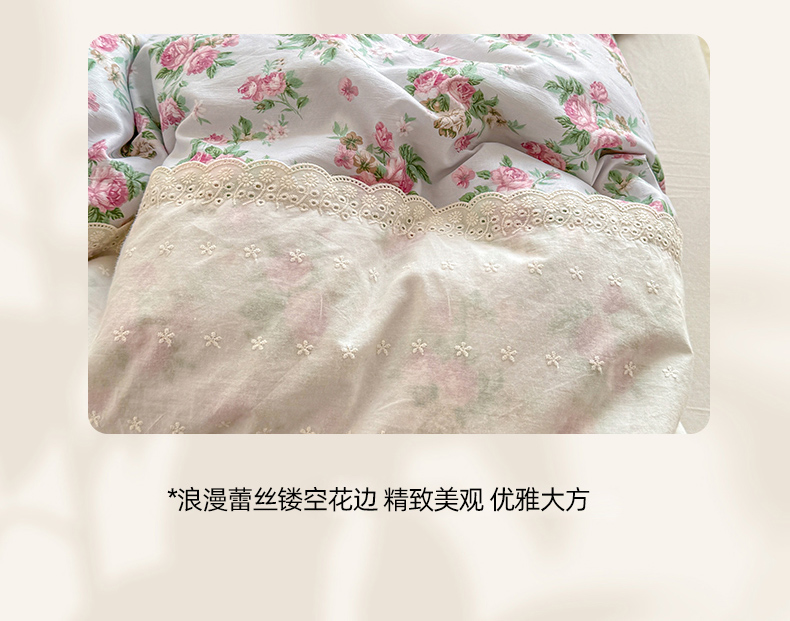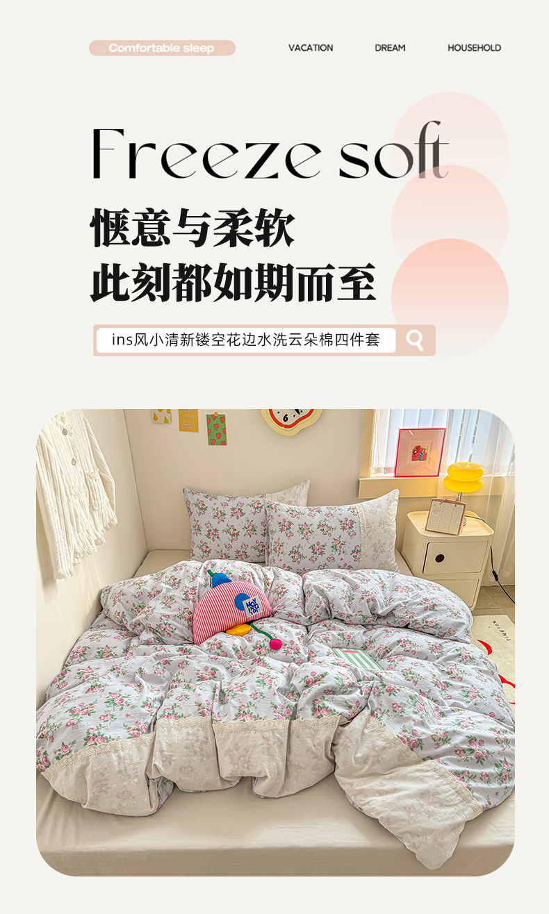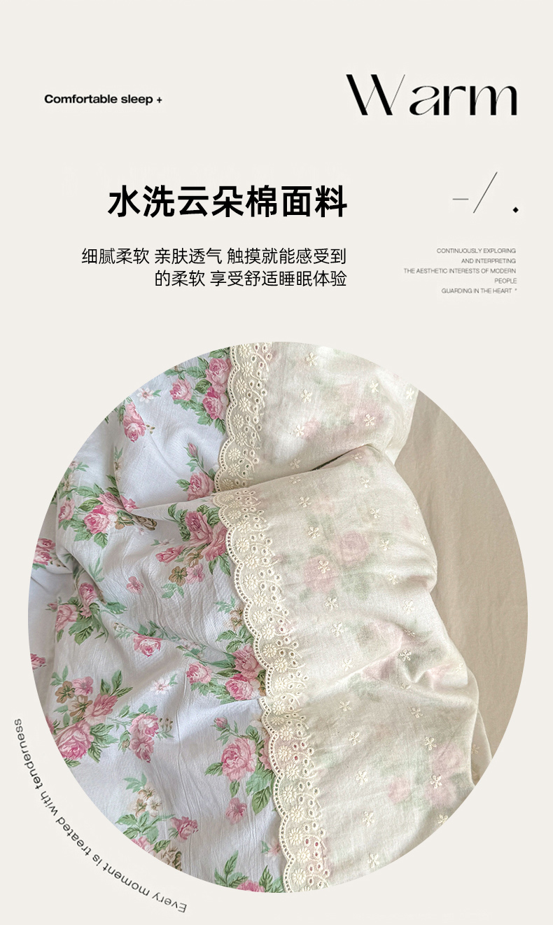 当前位置: 91家纺网 > 商品网购 > 床品套件 > 四件套 > 水洗棉四件套 > 温眠家纺 2025新款ins风小清新镂空花边水洗云朵棉四件套-风格二 春之语
