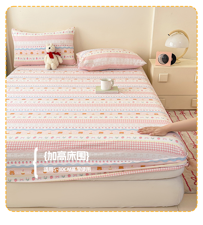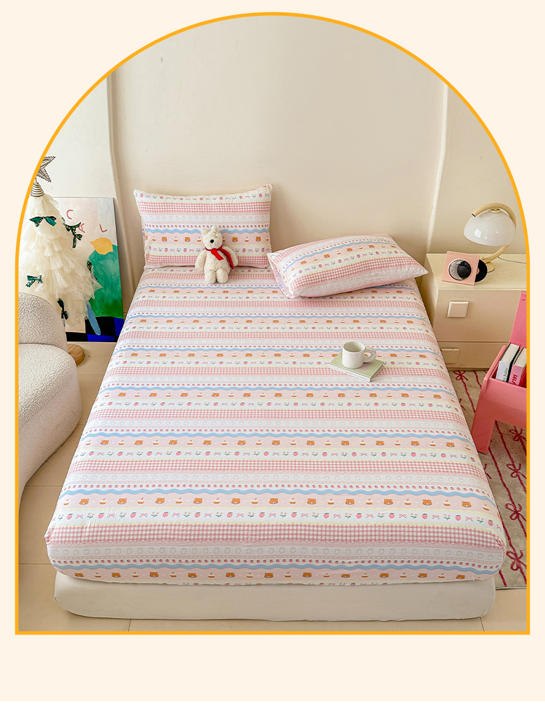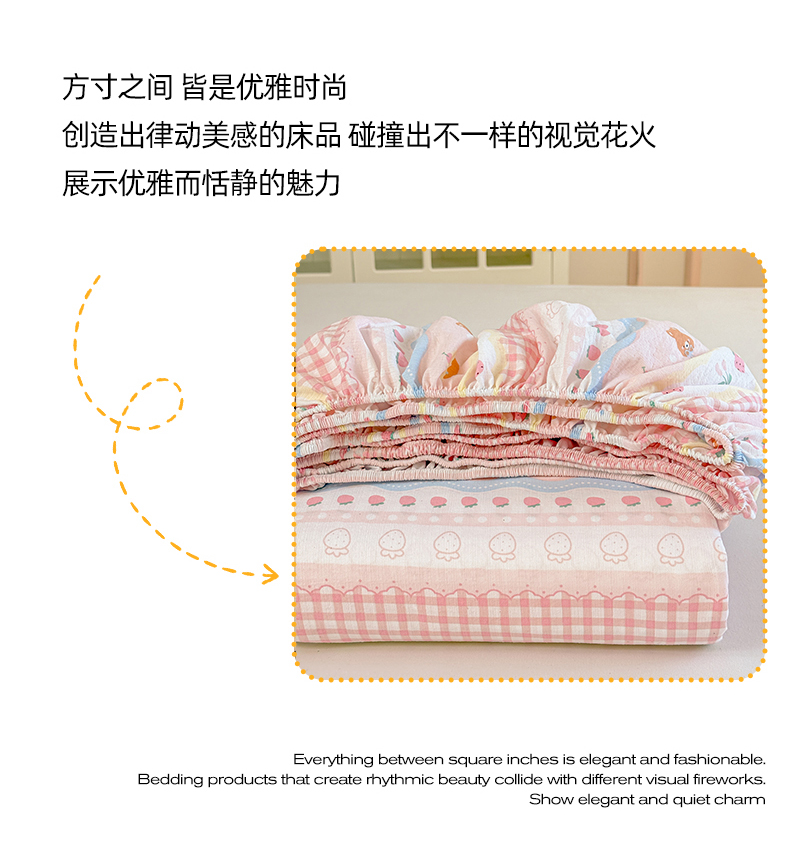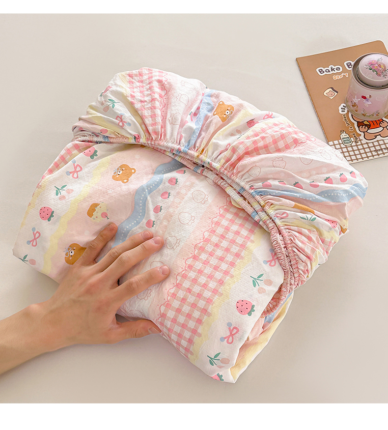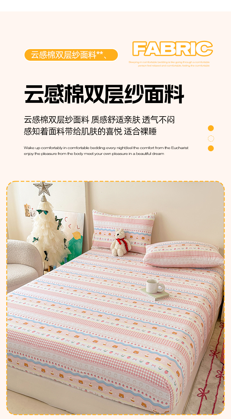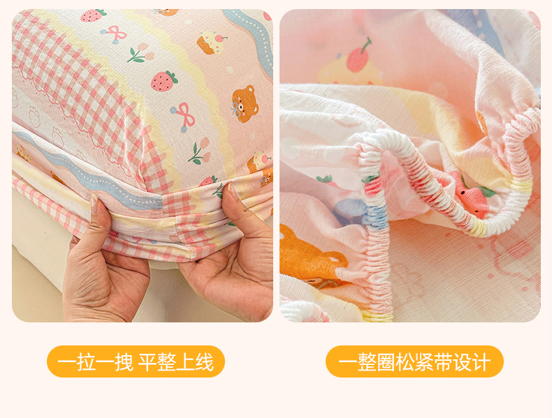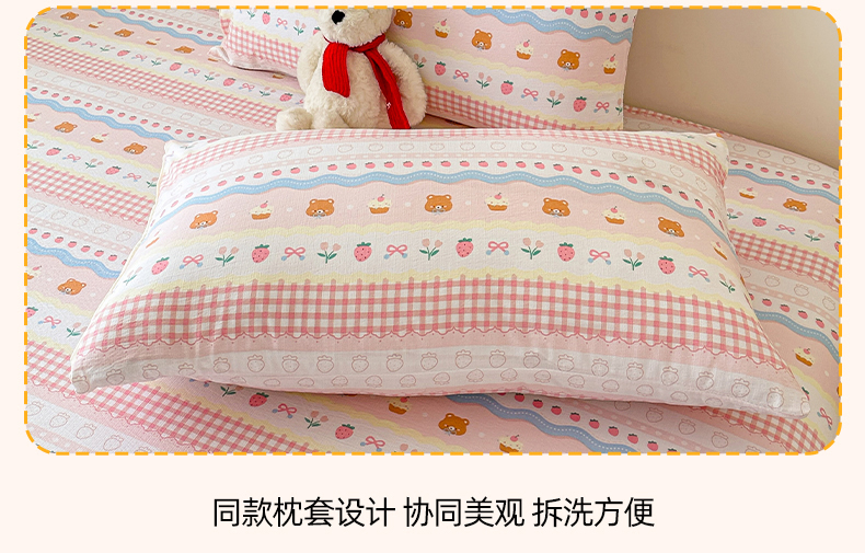 • 91家纺网 家纺一手货源 找家纺 温眠家纺 2025春夏新款云感棉双层纱床笠单床笠枕套三件套场景二 草莓蛋糕