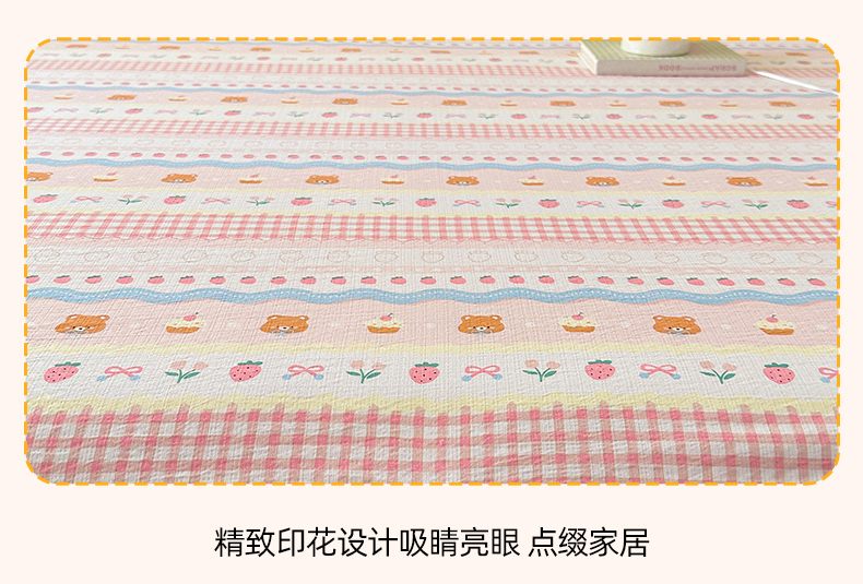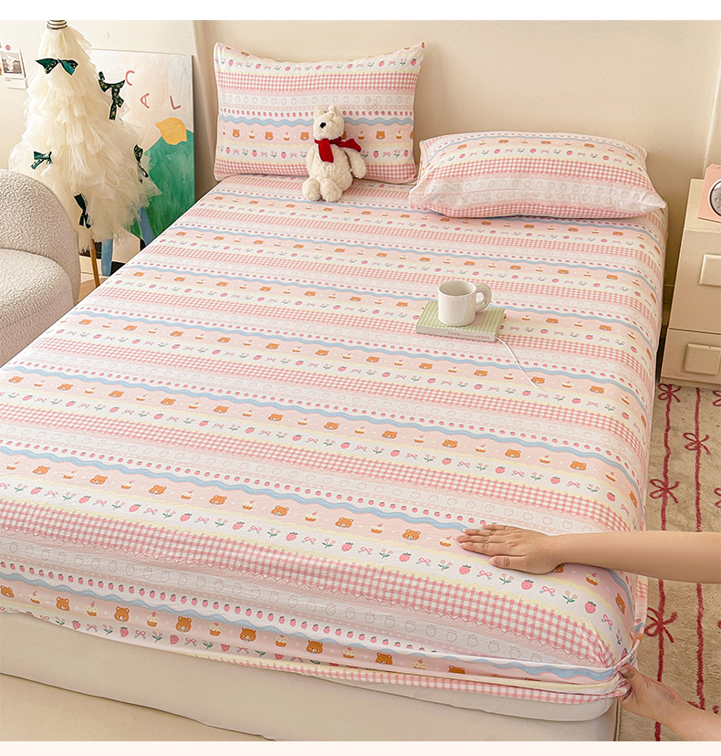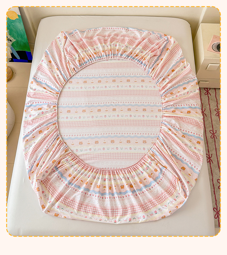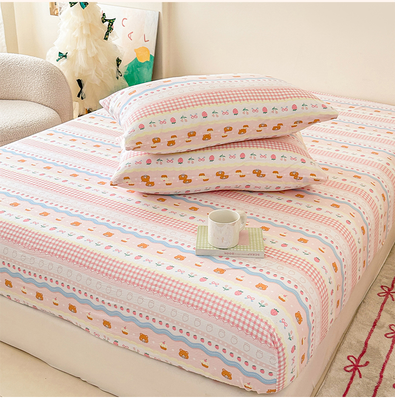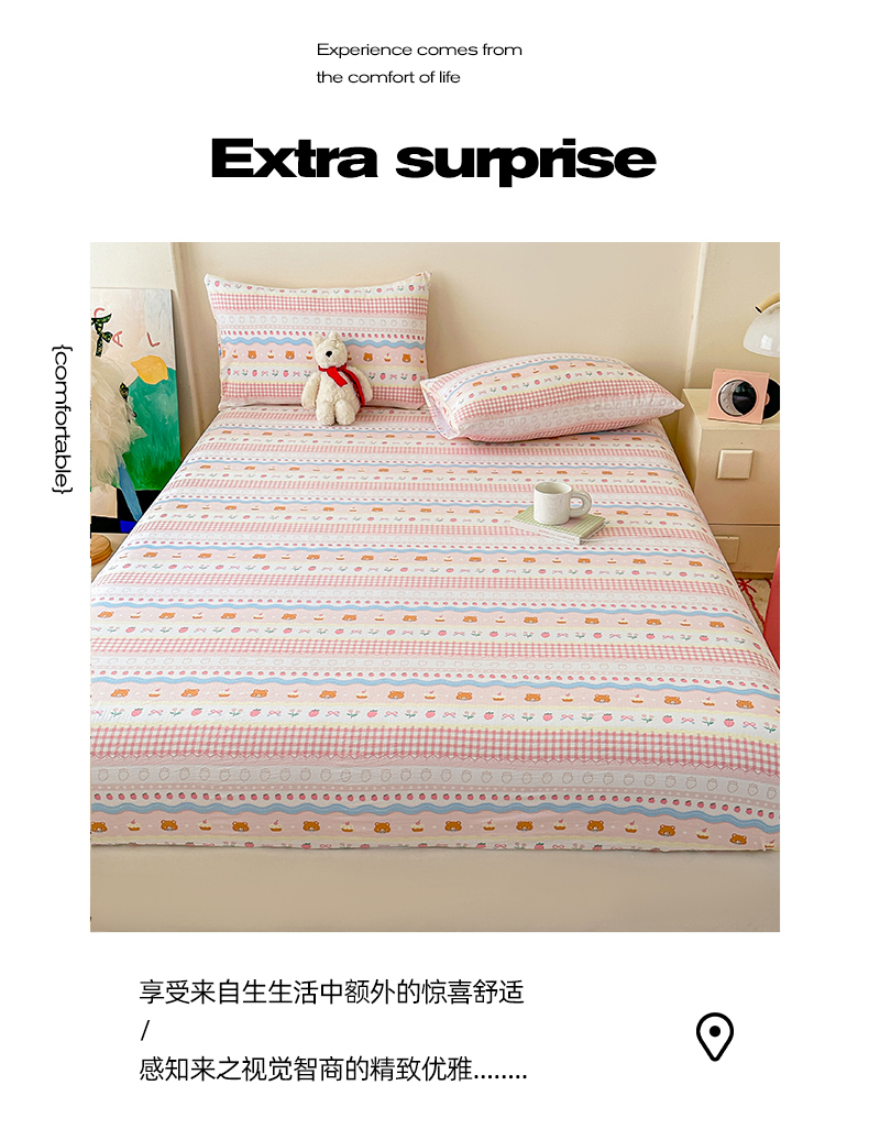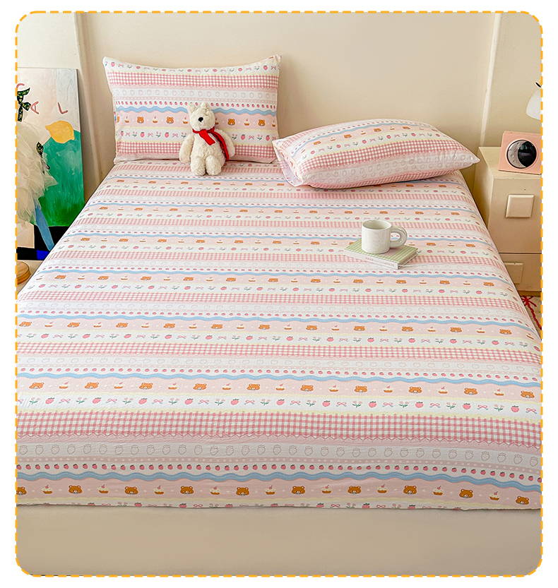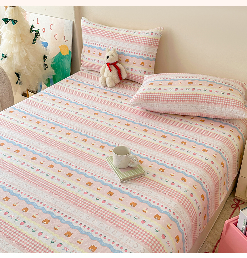 • 91家纺网 家纺一手货源 找家纺 温眠家纺 2025春夏新款云感棉双层纱床笠单床笠枕套三件套场景二 草莓蛋糕