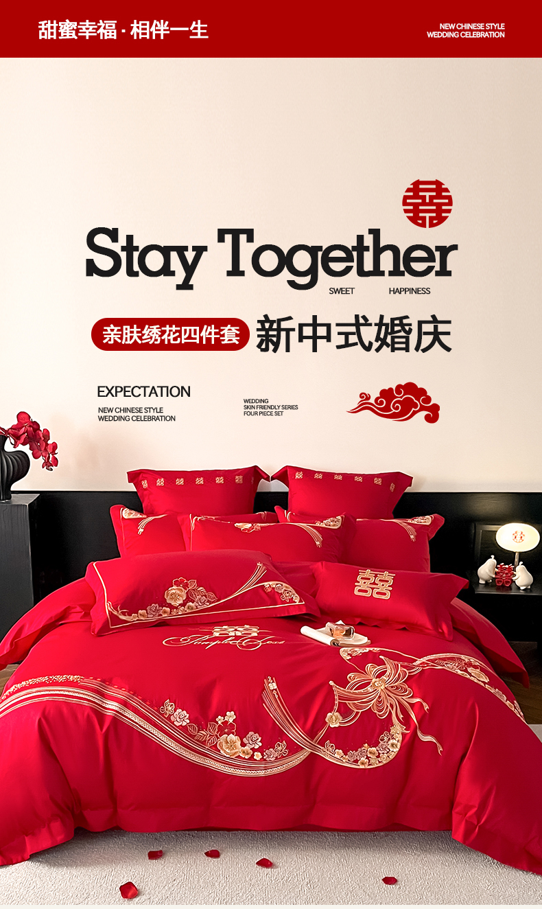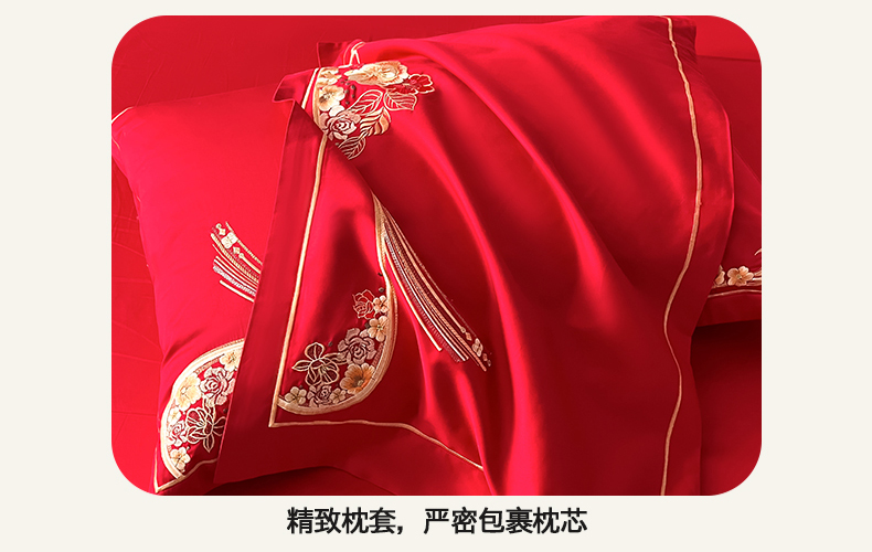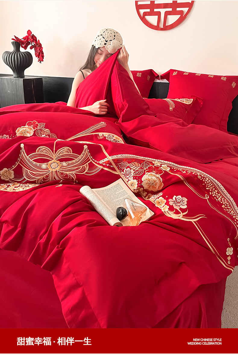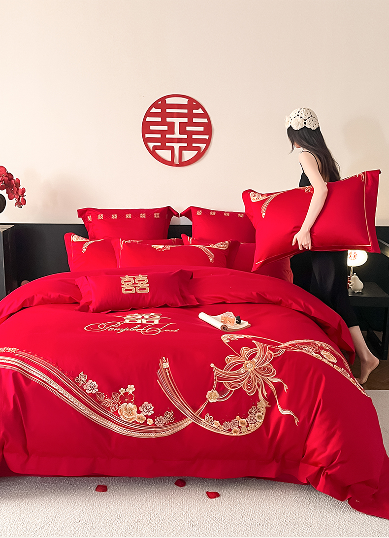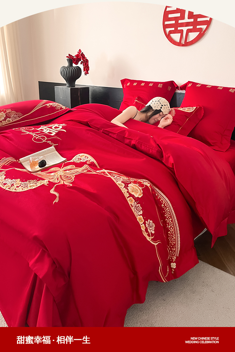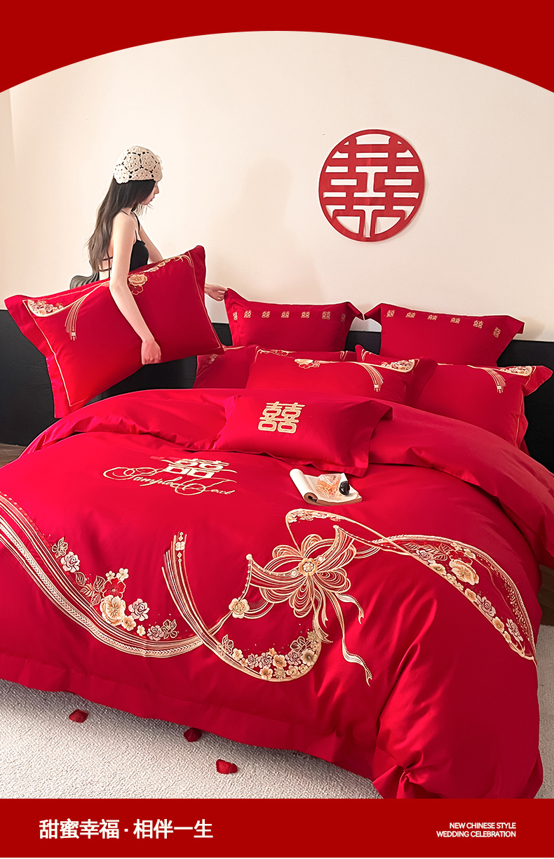 当前位置: 91家纺网 > 商品网购 > 床品套件 > 四件套 > 婚庆四件套 > 置顶家纺 2026新款新中式亲肤婚庆绣花四件套 大喜日子-大红