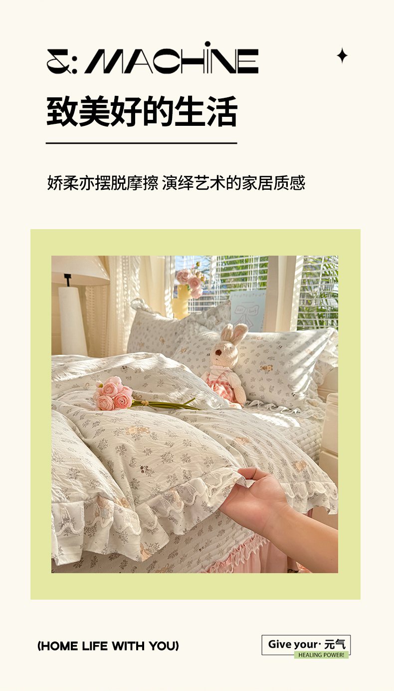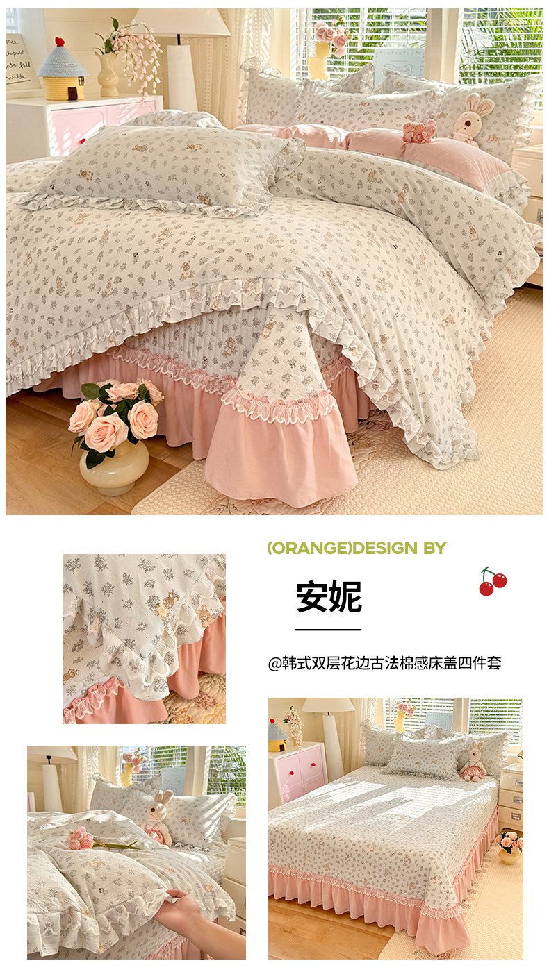 当前位置: 91家纺网 > 商品网购 > 床品套件 > 四件套 > 其它四件套 > 韩约家纺 2026新款韩式双层花边古法棉感床盖四件套 安妮