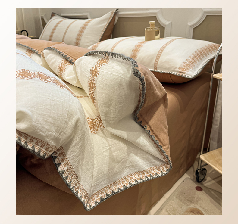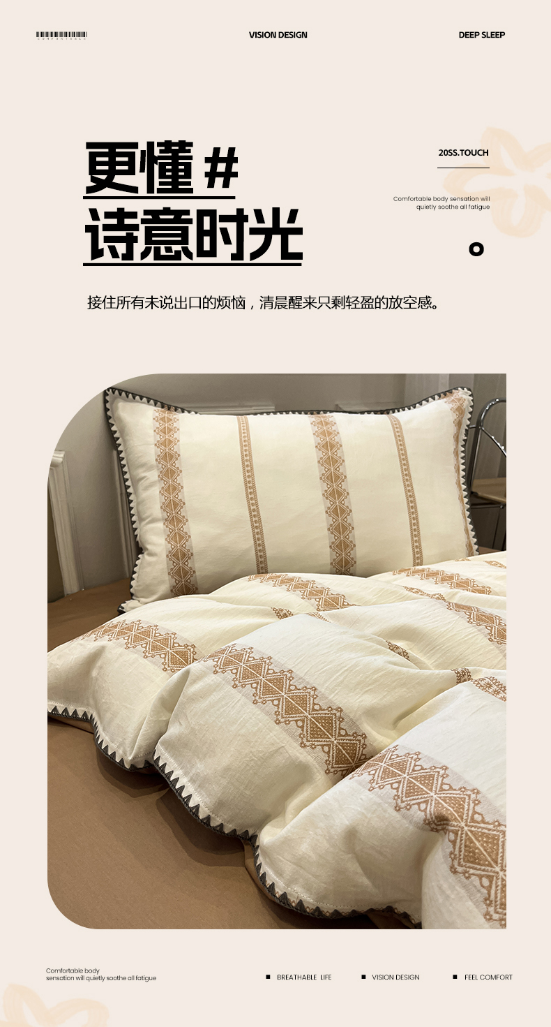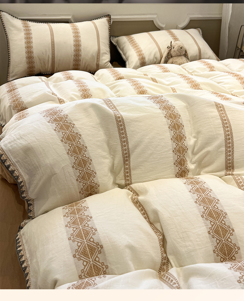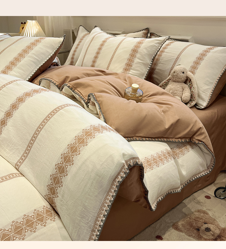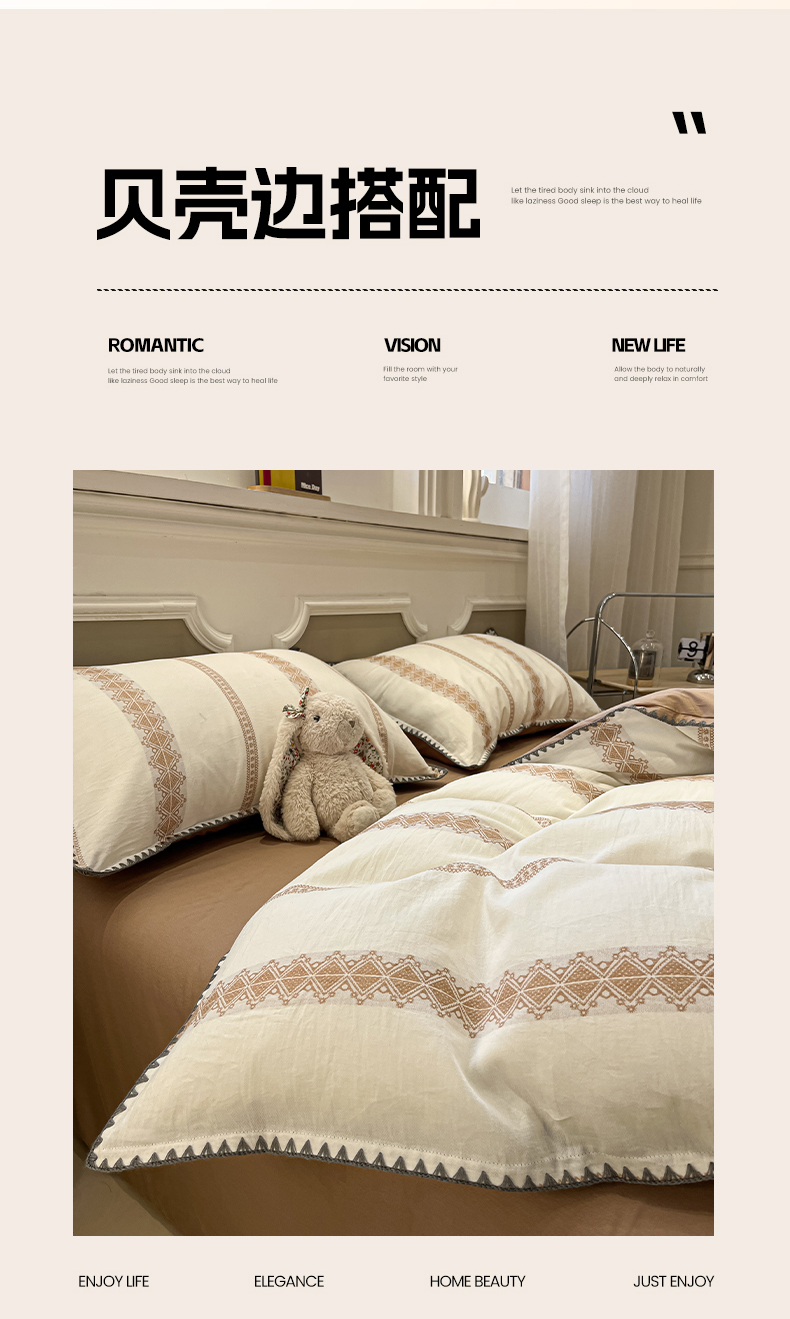 当前位置: 91家纺网 > 商品网购 > 床品套件 > 四件套 > 全棉普通四件套 > 莱茵家居 2026新款A类全棉纯棉色织大提花贝壳边四件套-序语松间系列 松间-棕