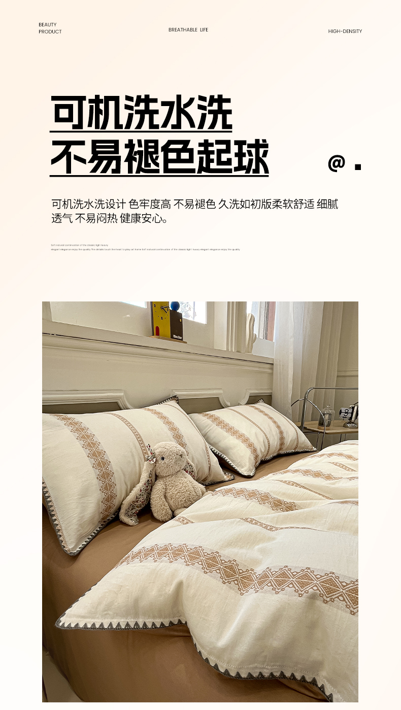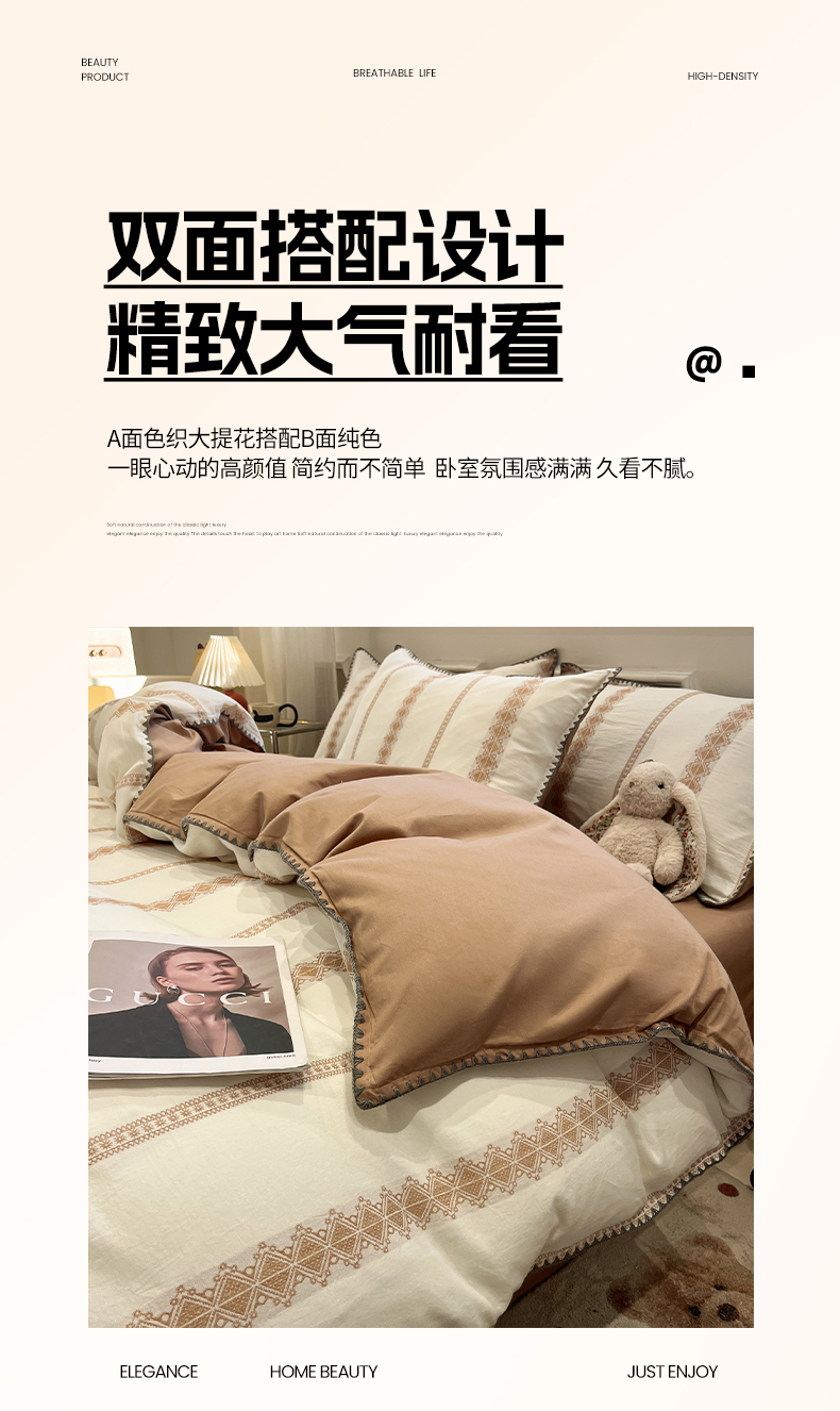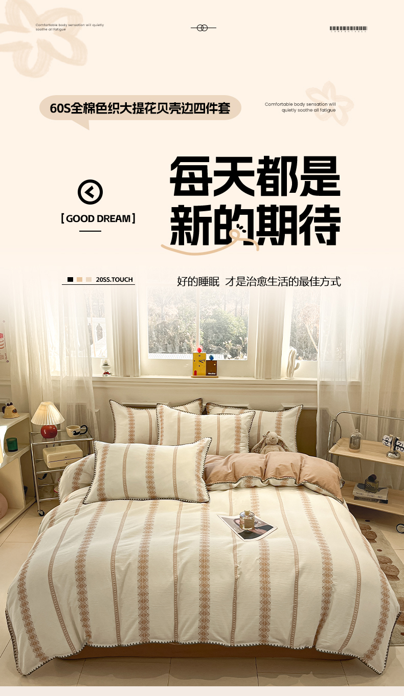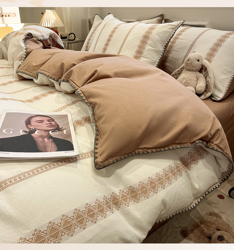 当前位置: 91家纺网 > 商品网购 > 床品套件 > 四件套 > 全棉普通四件套 > 莱茵家居 2026新款A类全棉纯棉色织大提花贝壳边四件套-序语松间系列 松间-棕