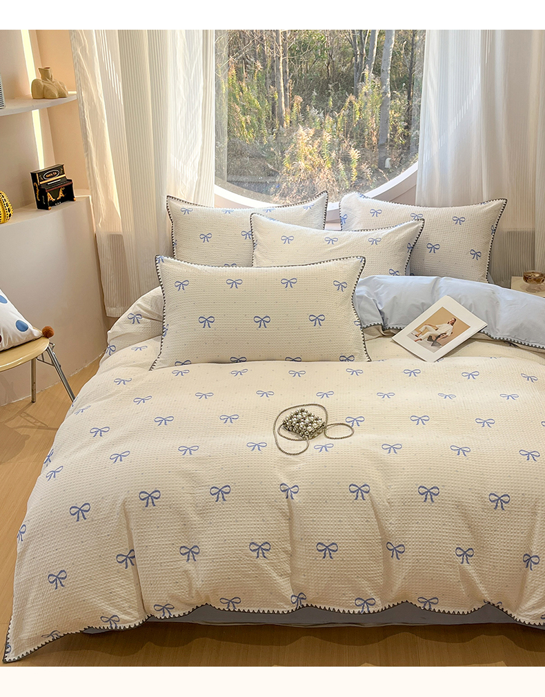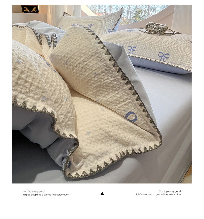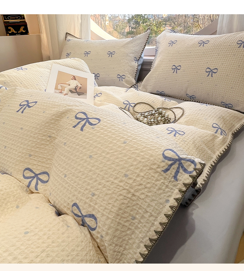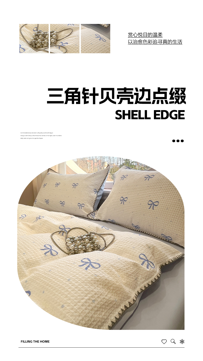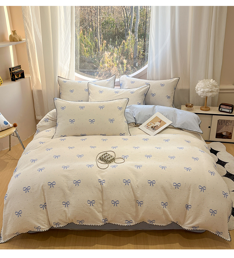 当前位置: 91家纺网 > 商品网购 > 床品套件 > 四件套 > 全棉普通四件套 > 莱茵家居 2026新款A类全棉华夫格印花贝壳边套件-华夫系列 华夫-蓝铃
