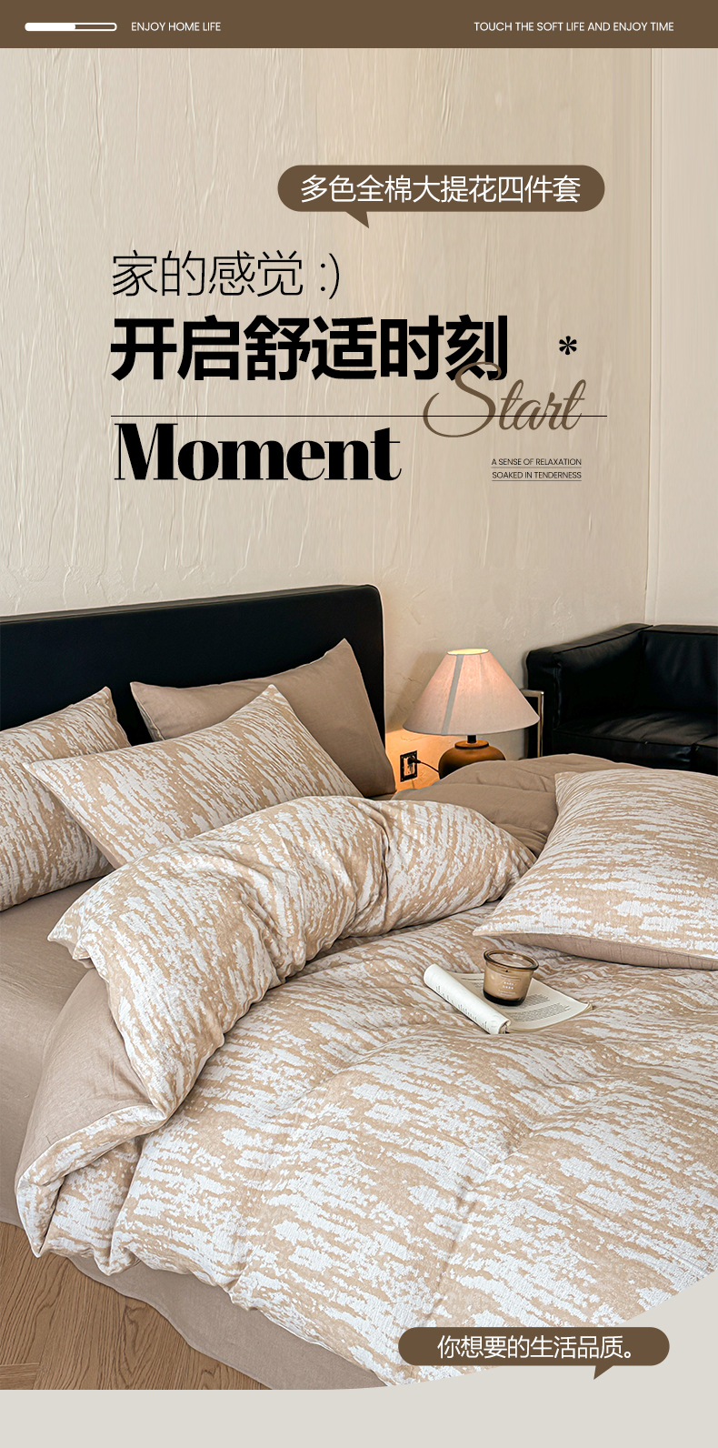 商品名称:莱茵家居 2026新款A类60支全棉纯棉复古侘寂风色织提花四件套-墨隙系列 墨隙-卡其