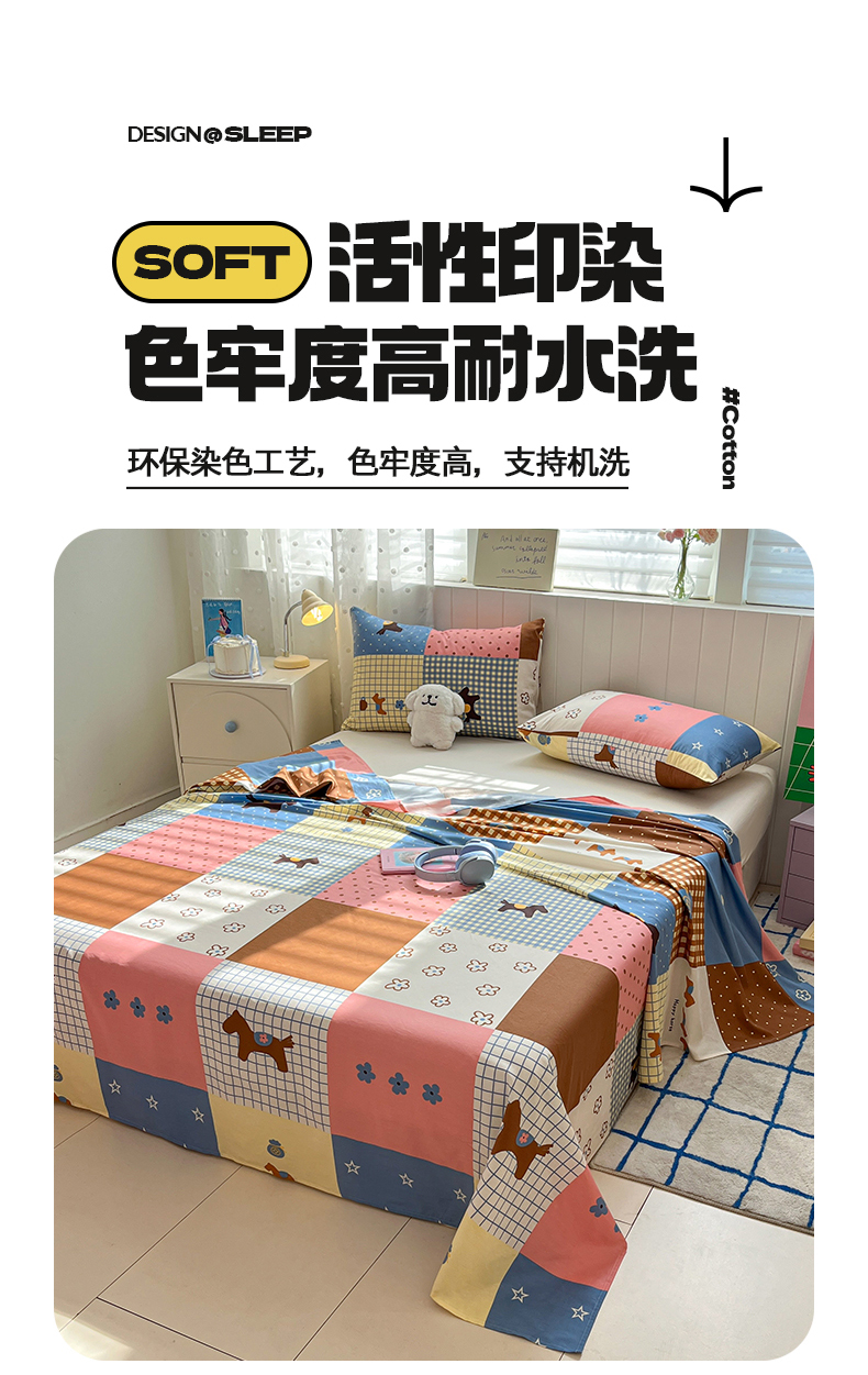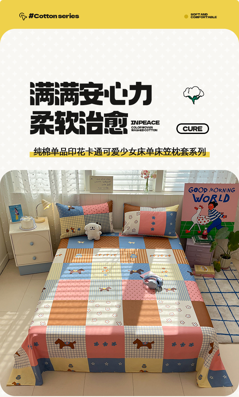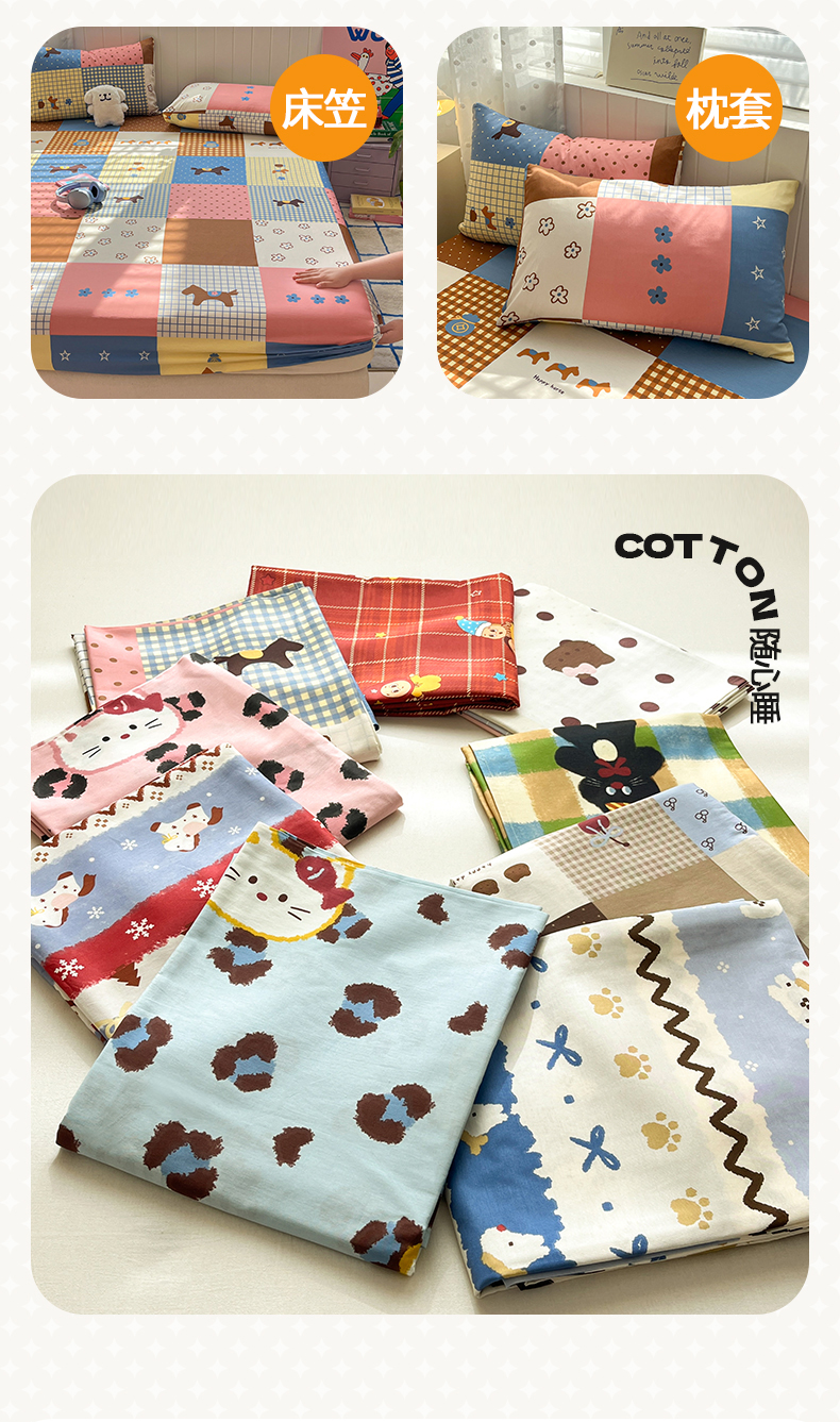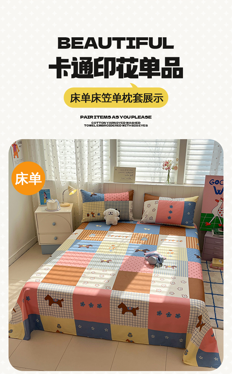 • 91家纺网 家纺一手货源 找家纺 桃子家居 2026新款纯棉全棉单品印花卡通可爱少女床单床笠枕套系列 棉单品-彩格小马
