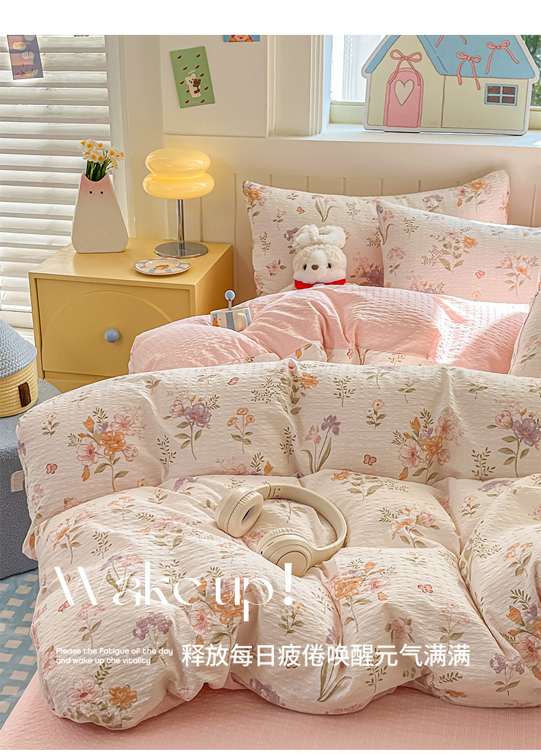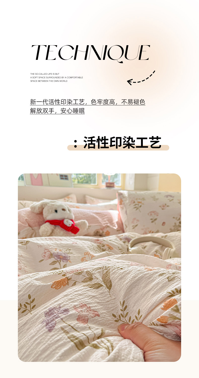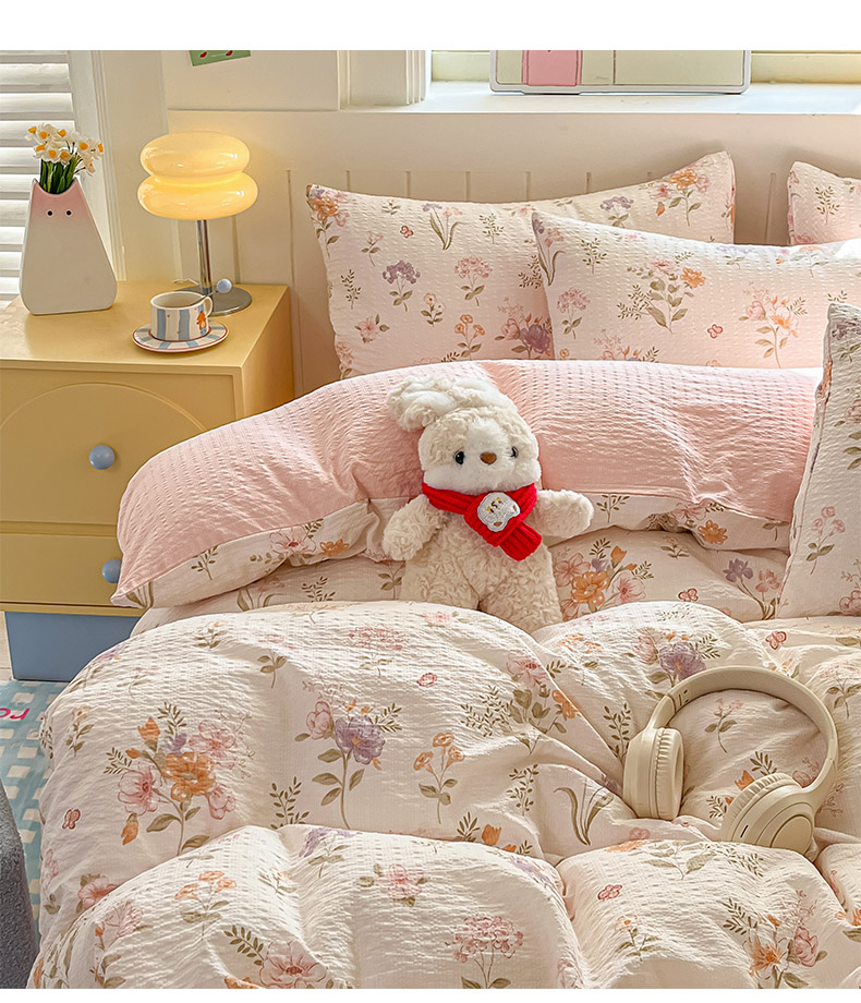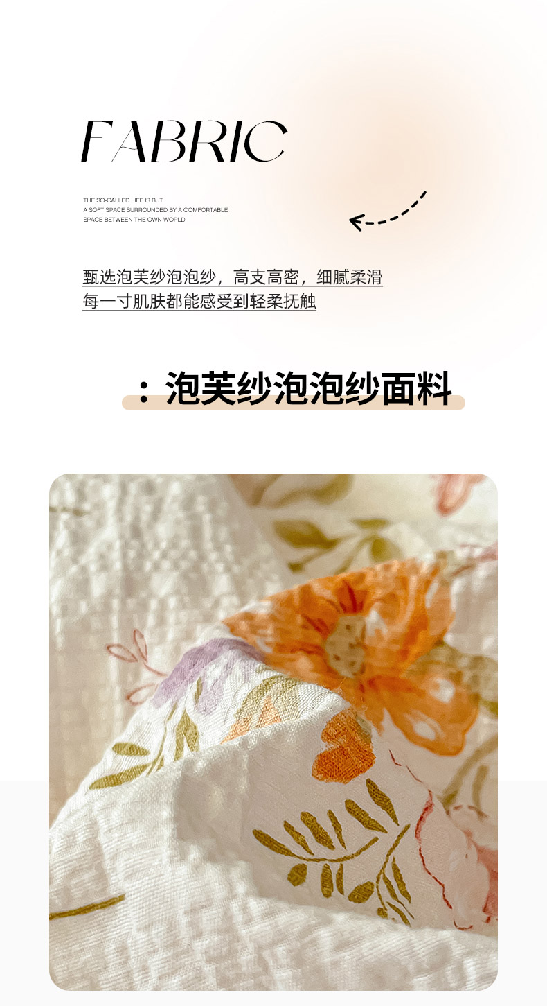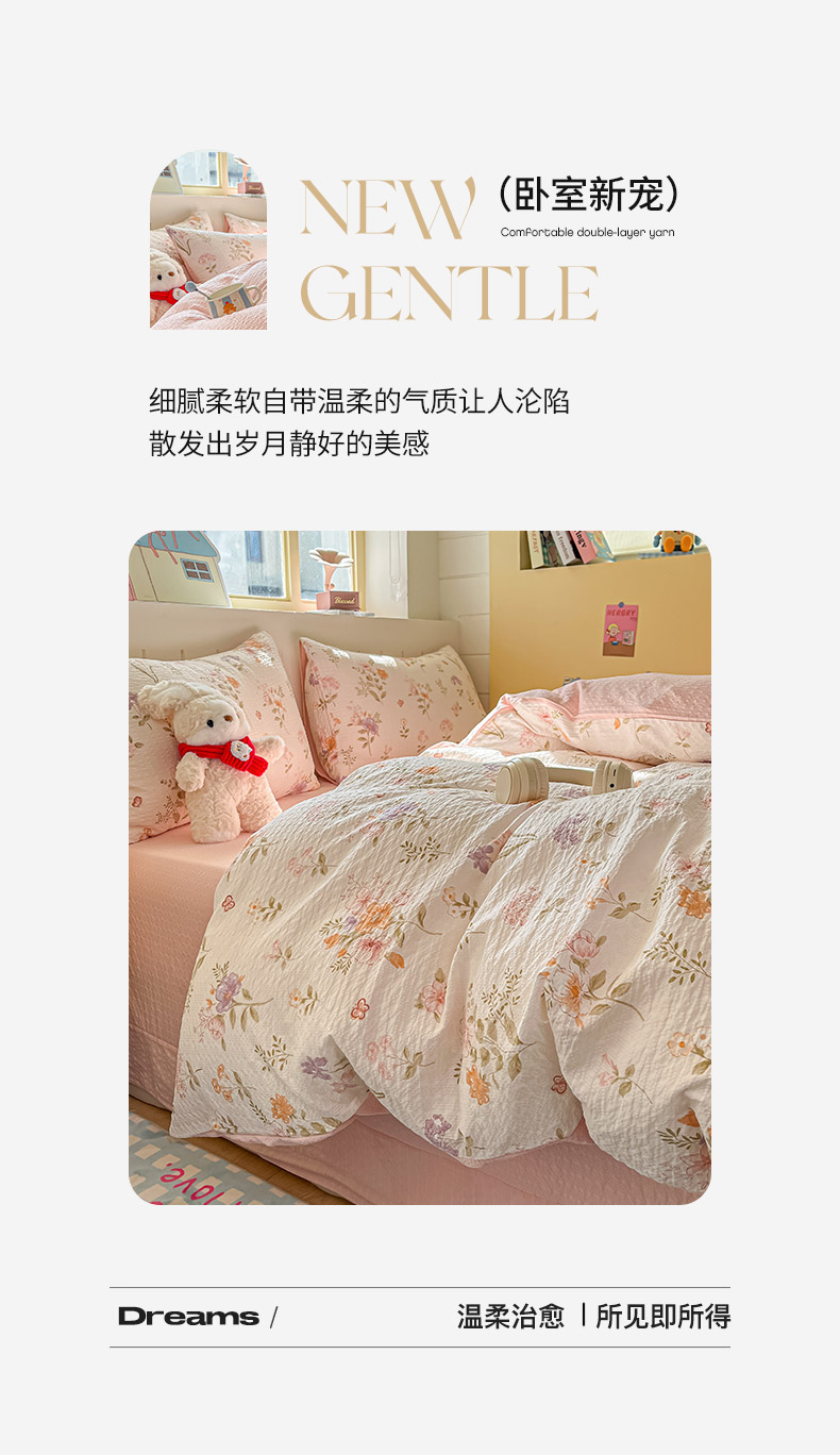 当前位置: 91家纺网 > 商品网购 > 床品套件 > 四件套 > 其它四件套 > 金梦拉家纺 2026新款A类高品质高克重超柔泡芙纱泡泡纱小清新四件套 海棠听风