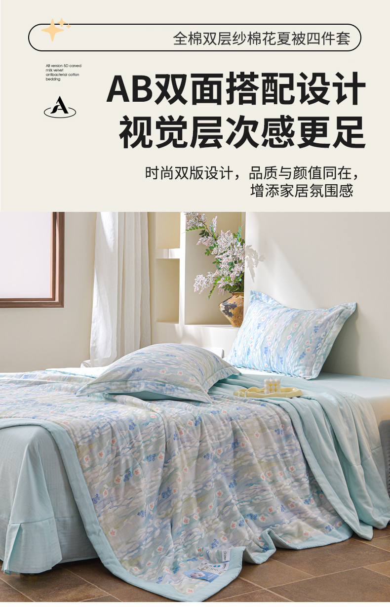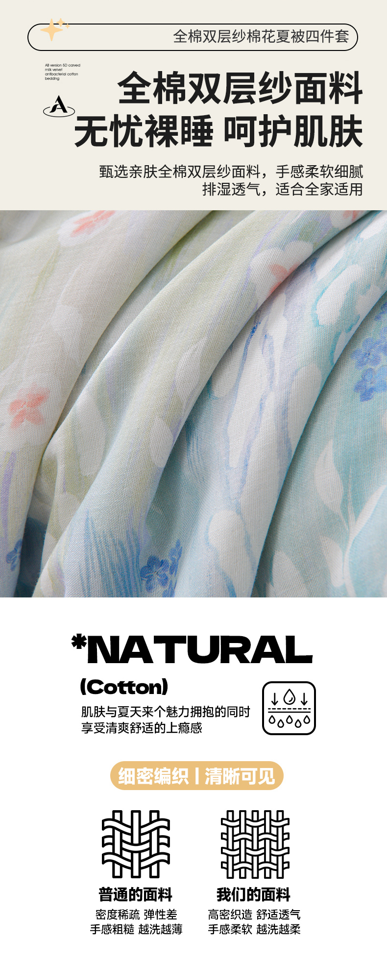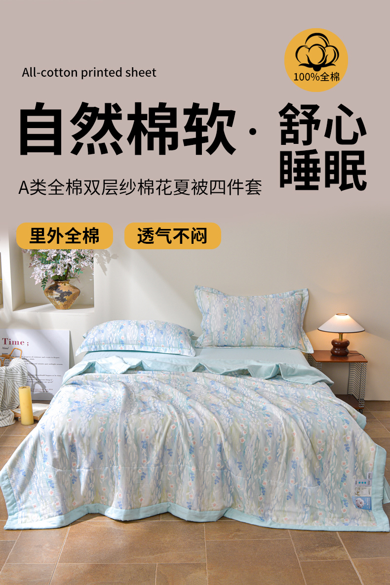 • 91家纺网 家纺一手货源 找家纺 金昱纺 2026新款A类全棉双层纱新疆棉花夏被四件套(带检测报告,包检测,有微信+买家秀) 禾棠映月-兰