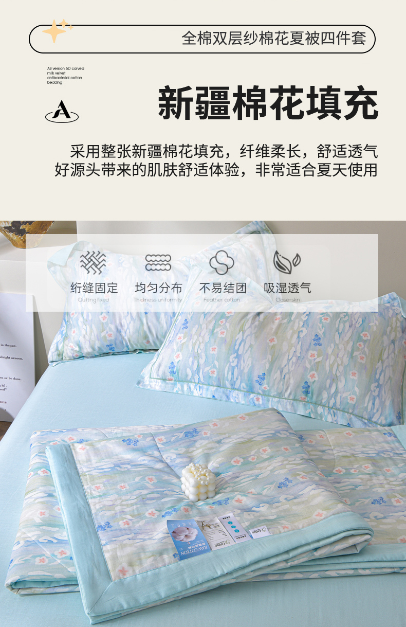 金昱纺 2026新款A类全棉双层纱新疆棉花夏被四件套(带检测报告,包检测,有微信+买家秀) 禾棠映月-兰