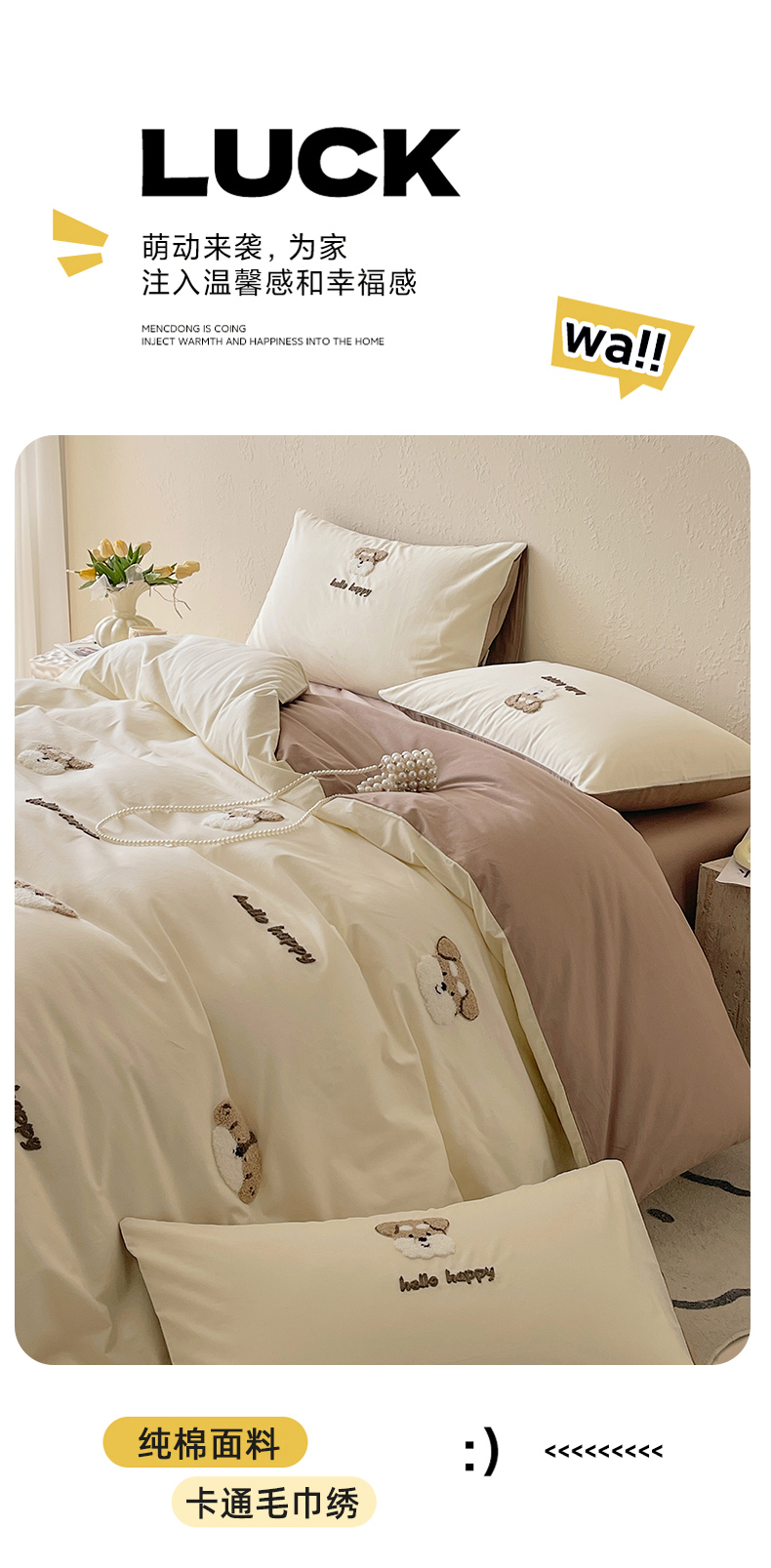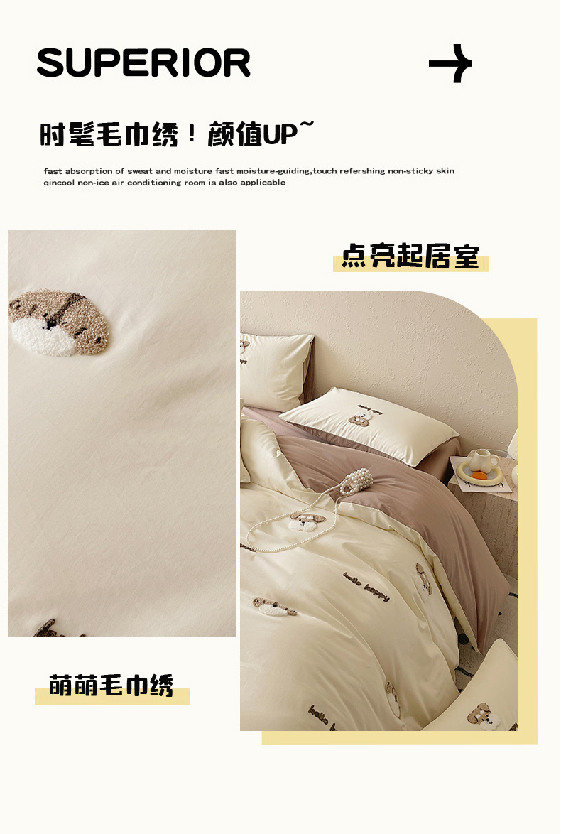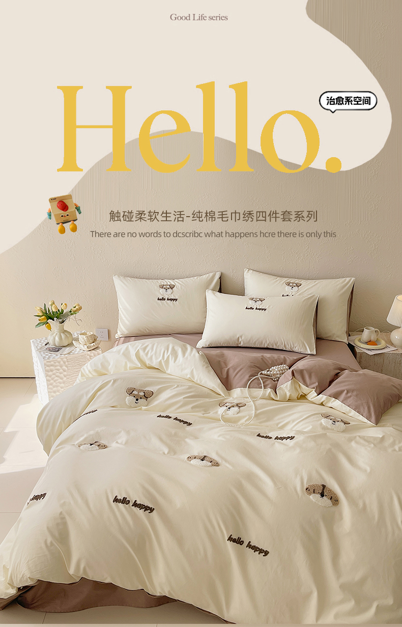 当前位置: 91家纺网 > 商品网购 > 床品套件 > 四件套 > 全棉普通四件套 > 琪格格纺织 2026新款卡通13372全棉纯棉毛巾绣四件套 hello汪星人-奶咖