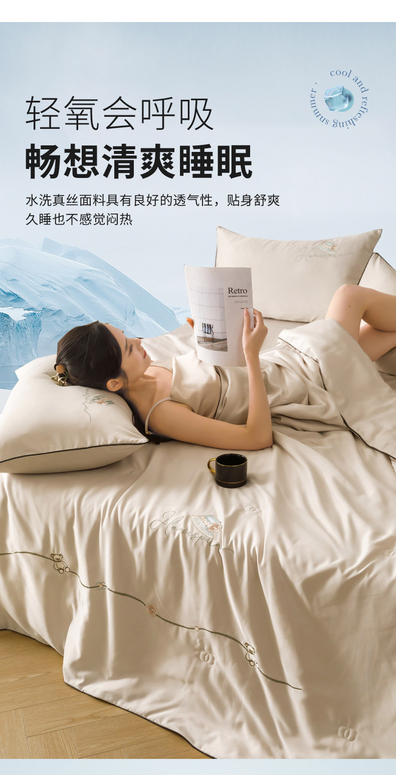 • 91家纺网 家纺一手货源 找家纺 (总)丝印良品 2026新款水洗真丝盛夏系列四件套单被套四件套,香槟深灰,宝石绿,北卡蓝,宾利蓝,粉玉香槟,高级灰,月光蓝,珍珠白