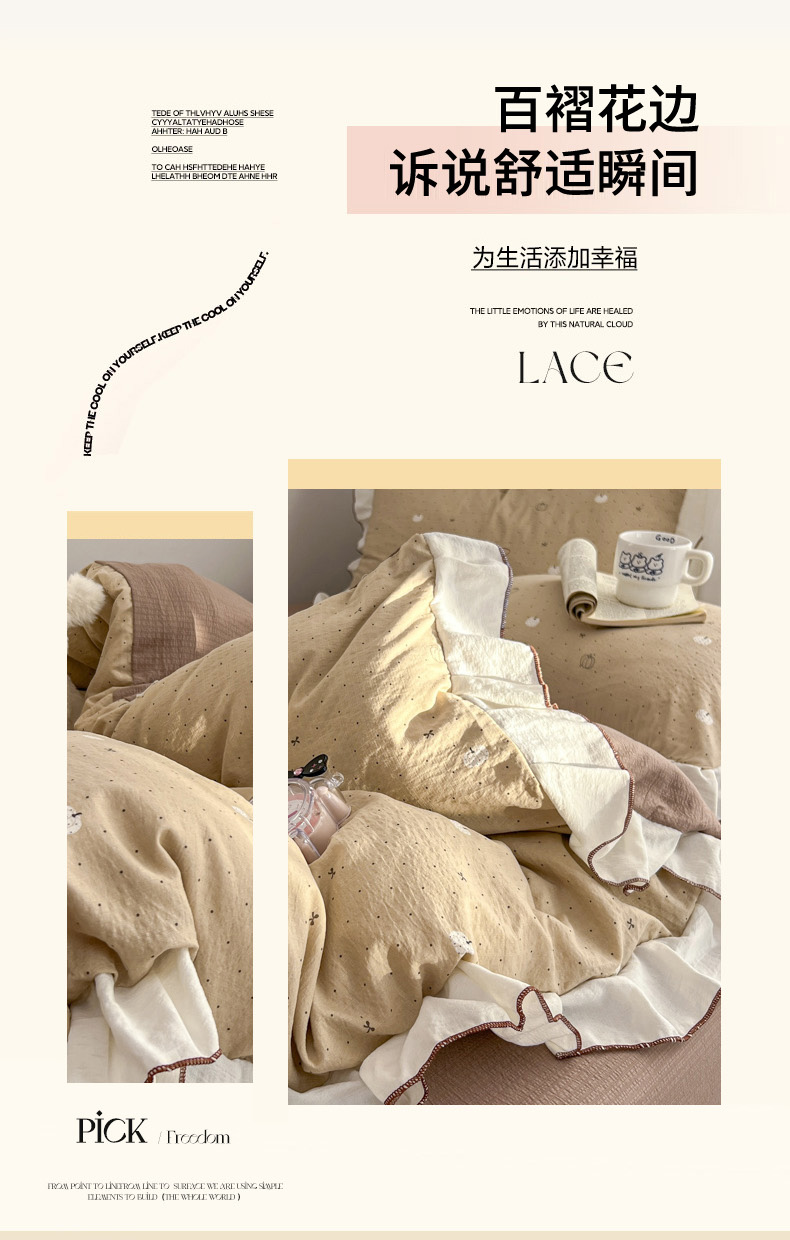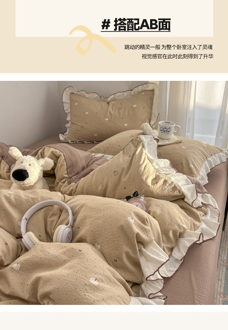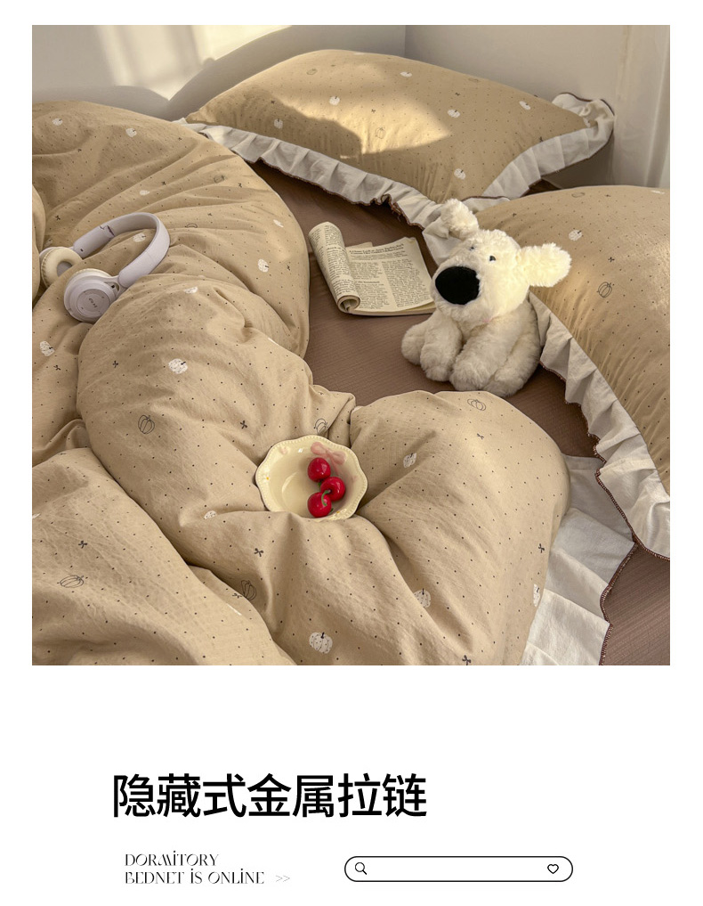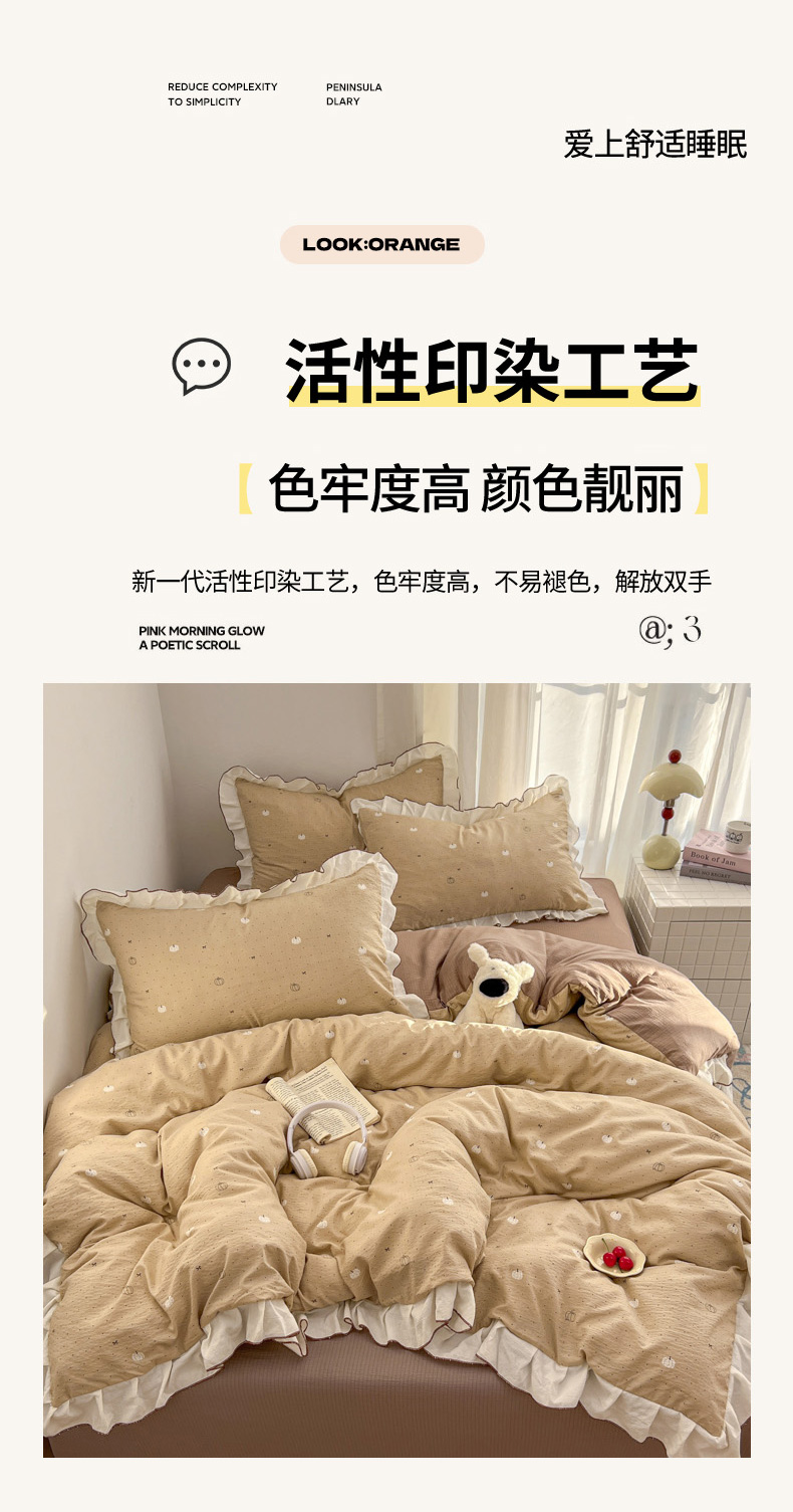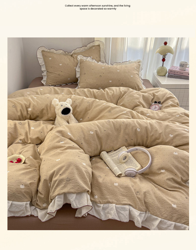 当前位置: 91家纺网 > 商品网购 > 床品套件 > 四件套 > 其它四件套 > 柒月家居 2026新款小清新木棉皱皱纱花边款四件套 南瓜贝贝