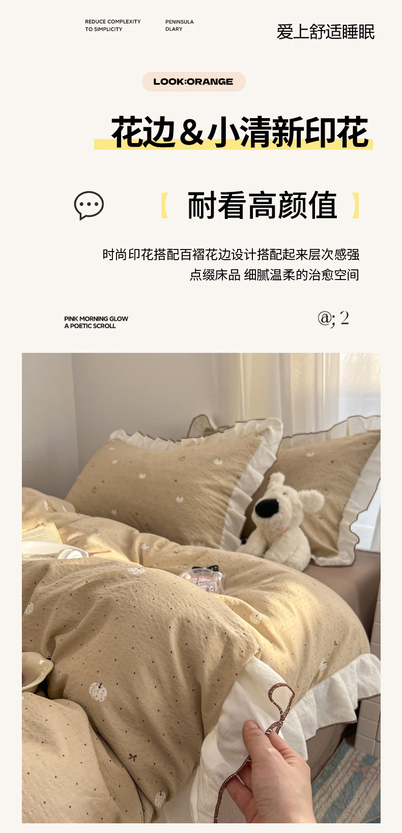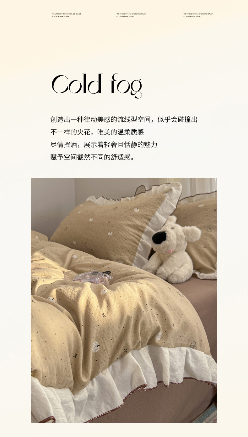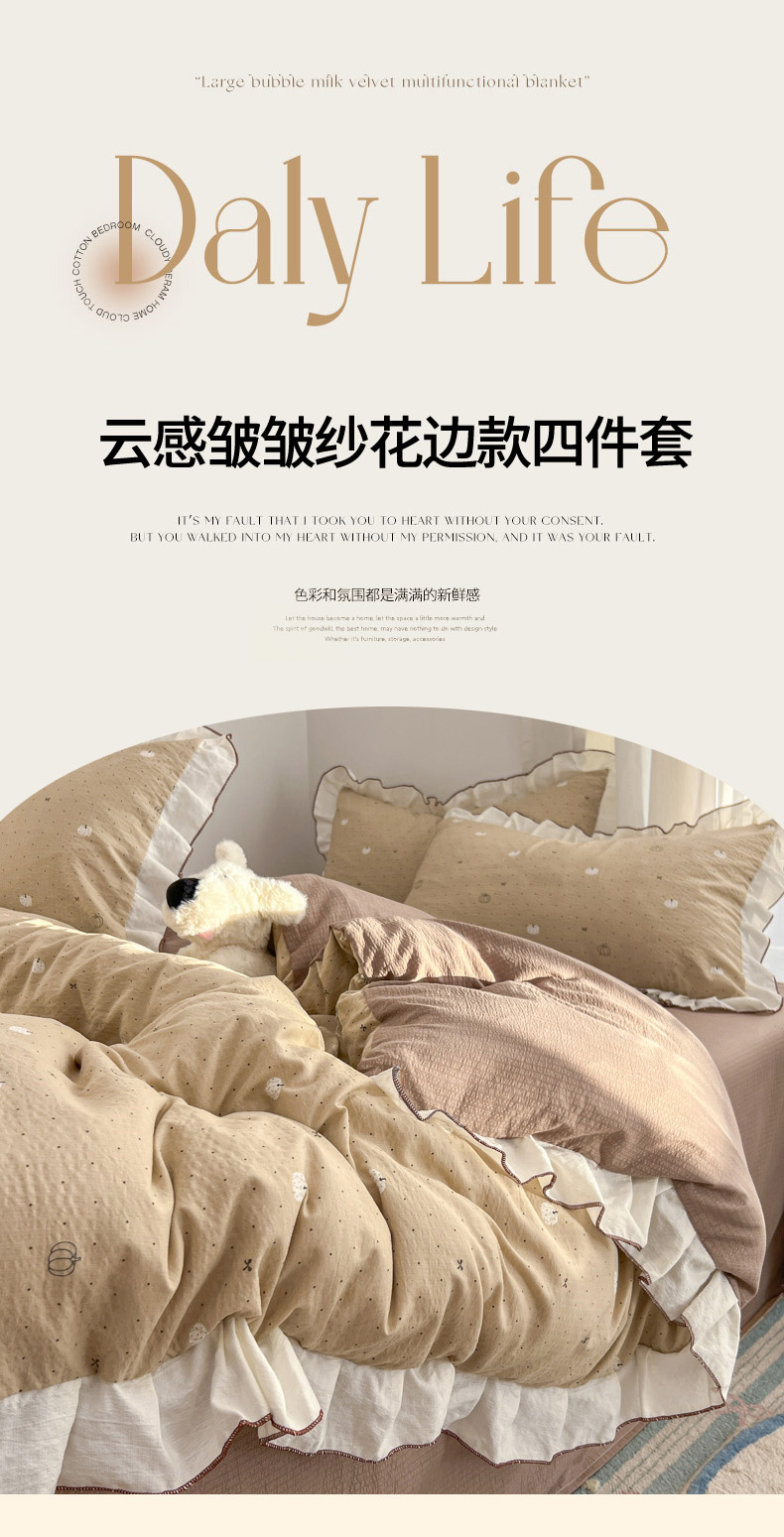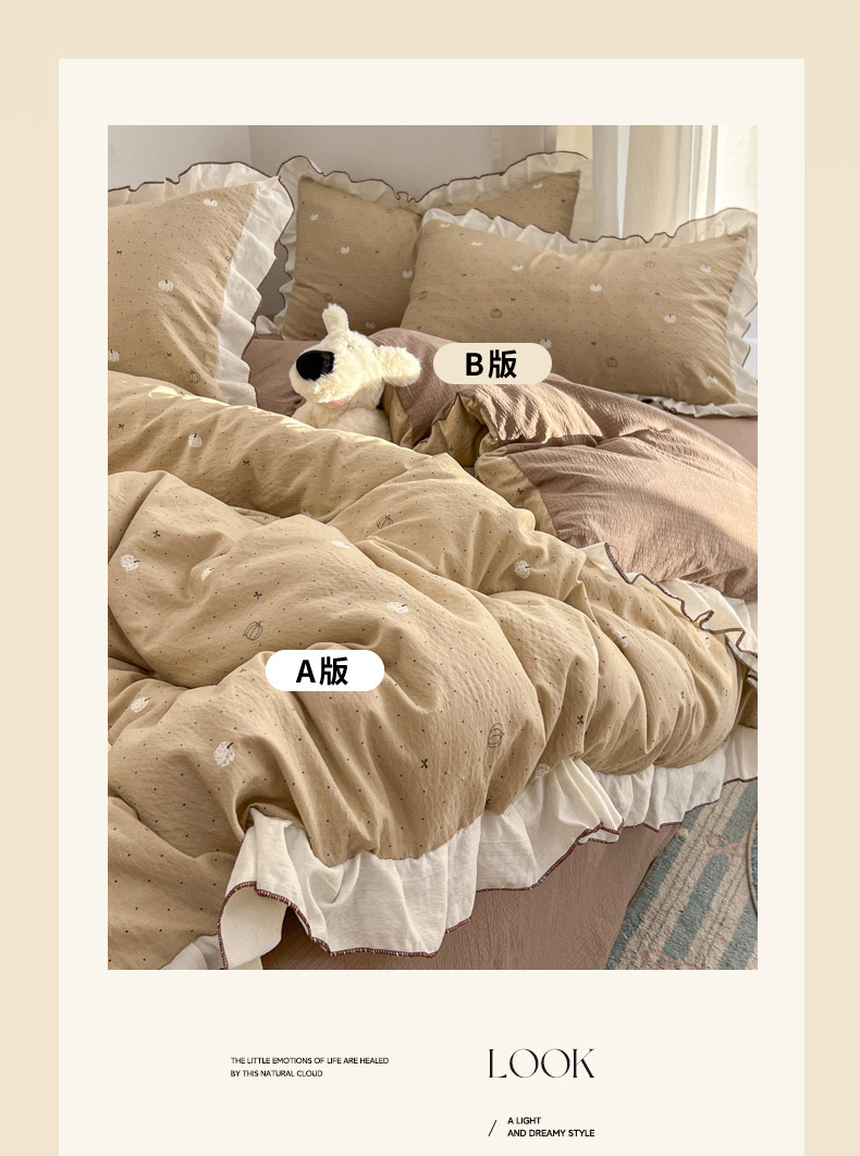 当前位置: 91家纺网 > 商品网购 > 床品套件 > 四件套 > 其它四件套 > 柒月家居 2026新款小清新木棉皱皱纱花边款四件套 南瓜贝贝