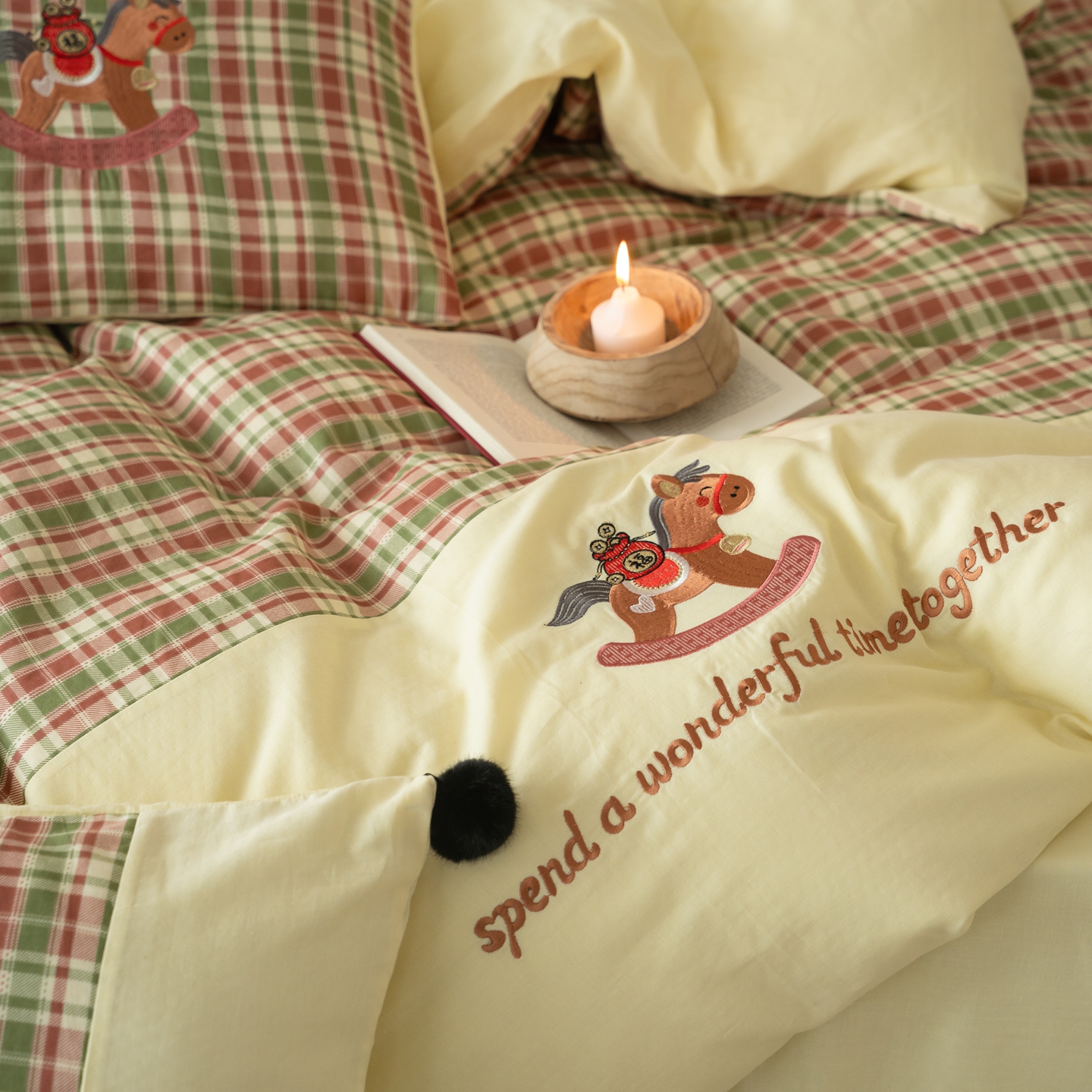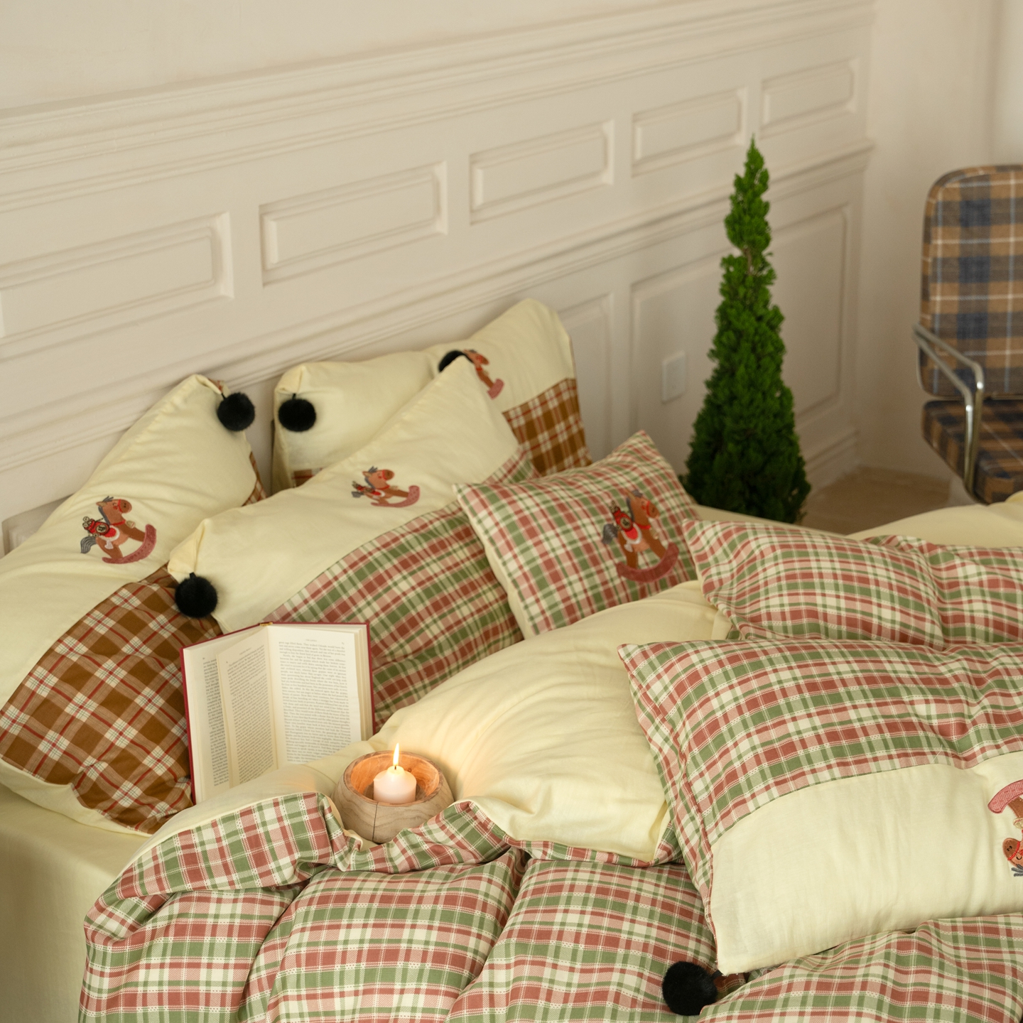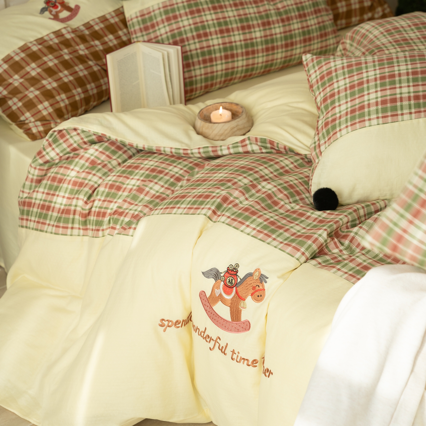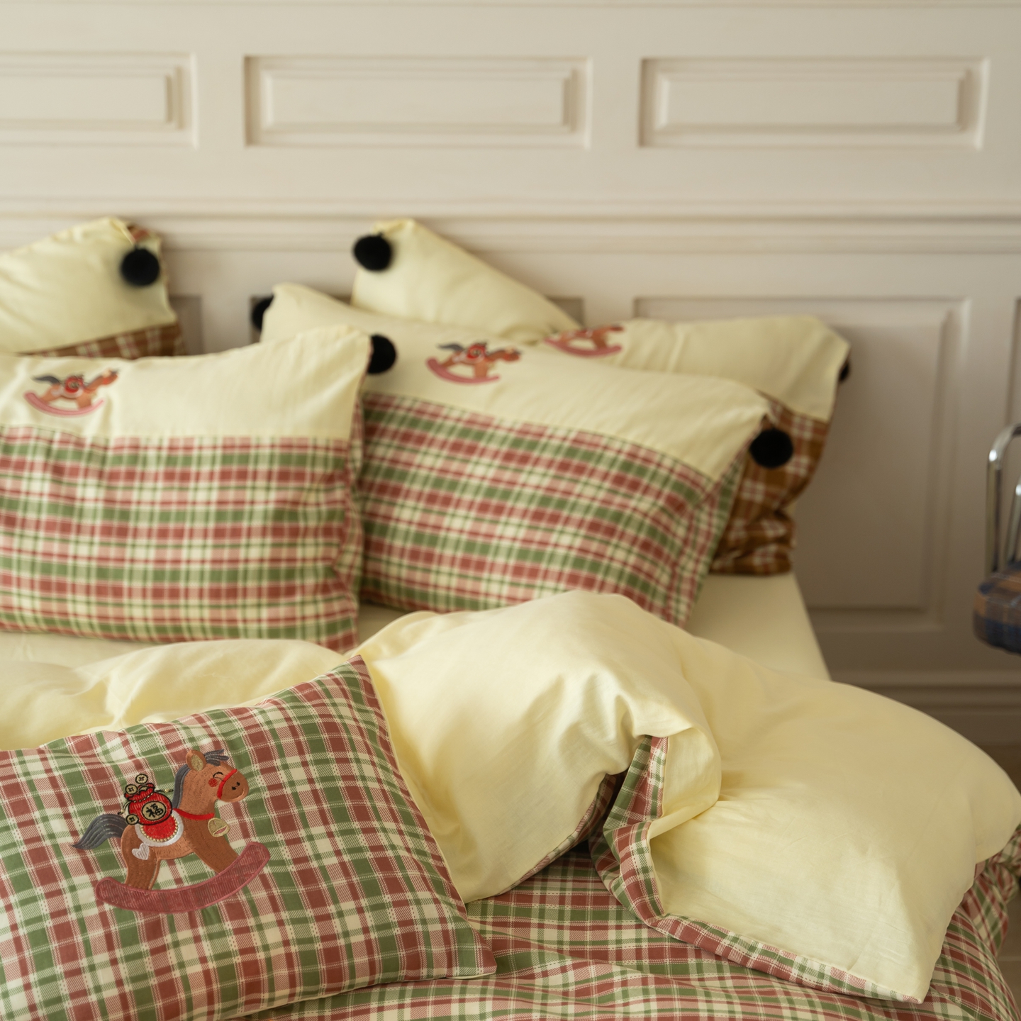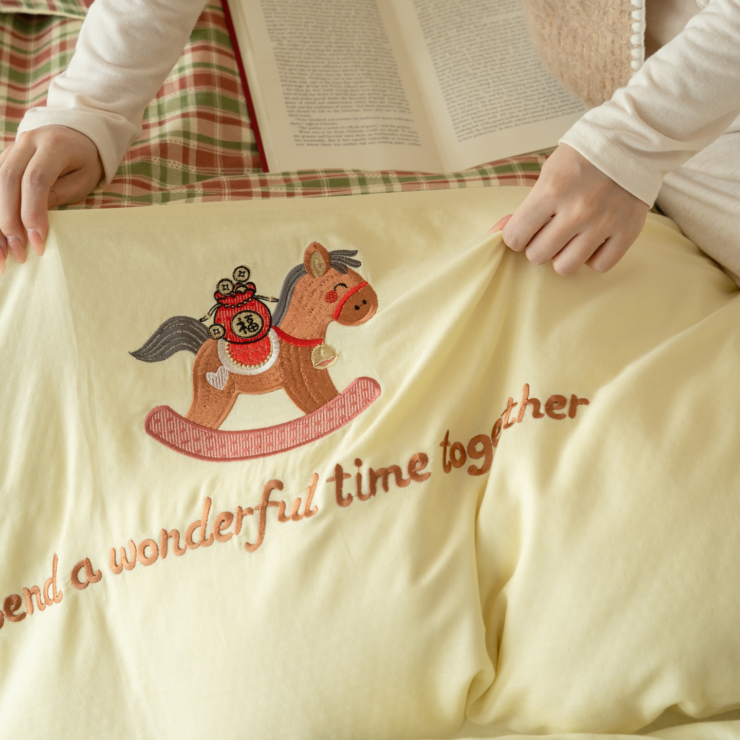 (总)优然居家纺 2026新款全棉双层纱刺绣四件套-马上有钱(控价260/328/348),马上有钱-黑格,马上有钱-黄格,马上有钱-绿格