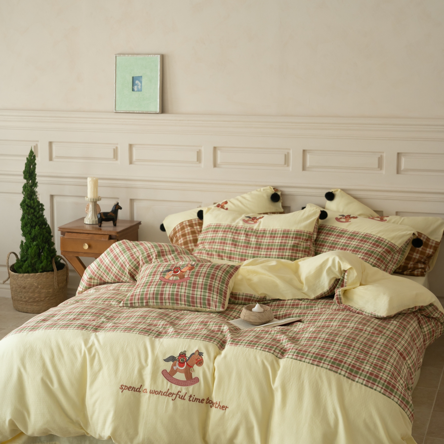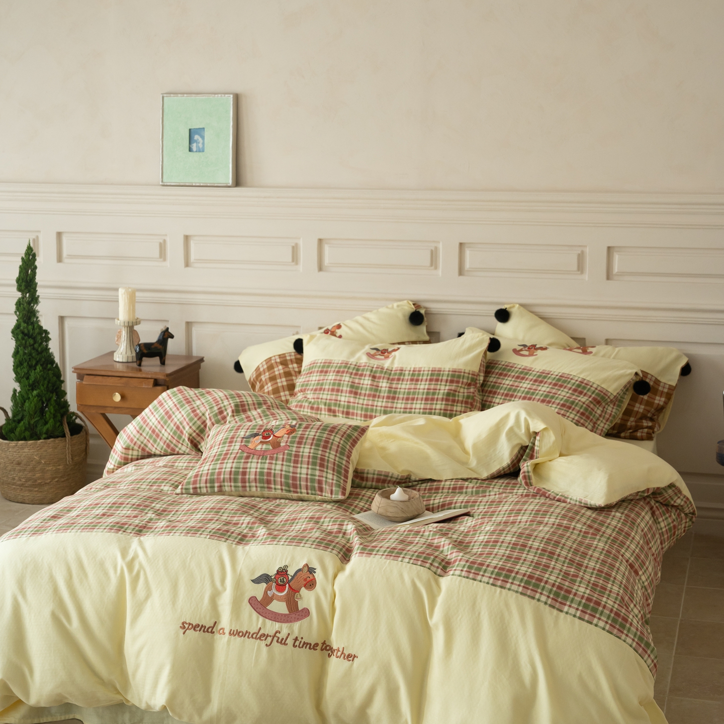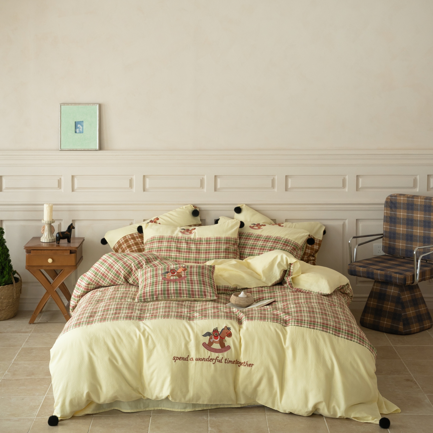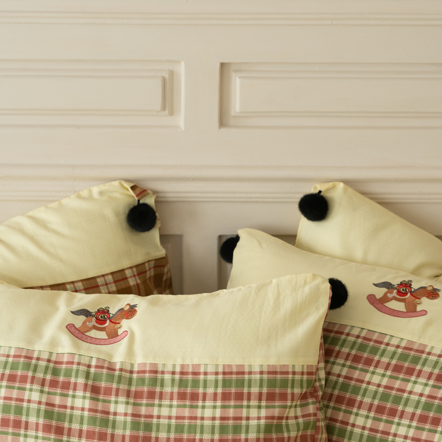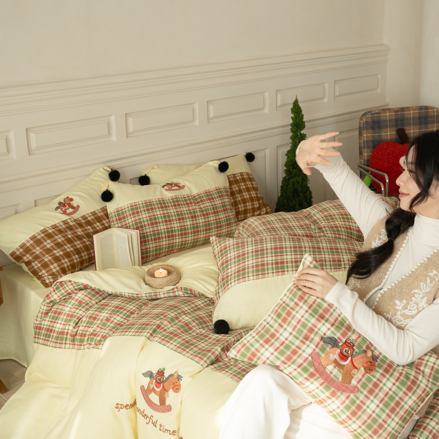 (总)优然居家纺 2026新款全棉双层纱刺绣四件套-马上有钱(控价260/328/348),马上有钱-黑格,马上有钱-黄格,马上有钱-绿格