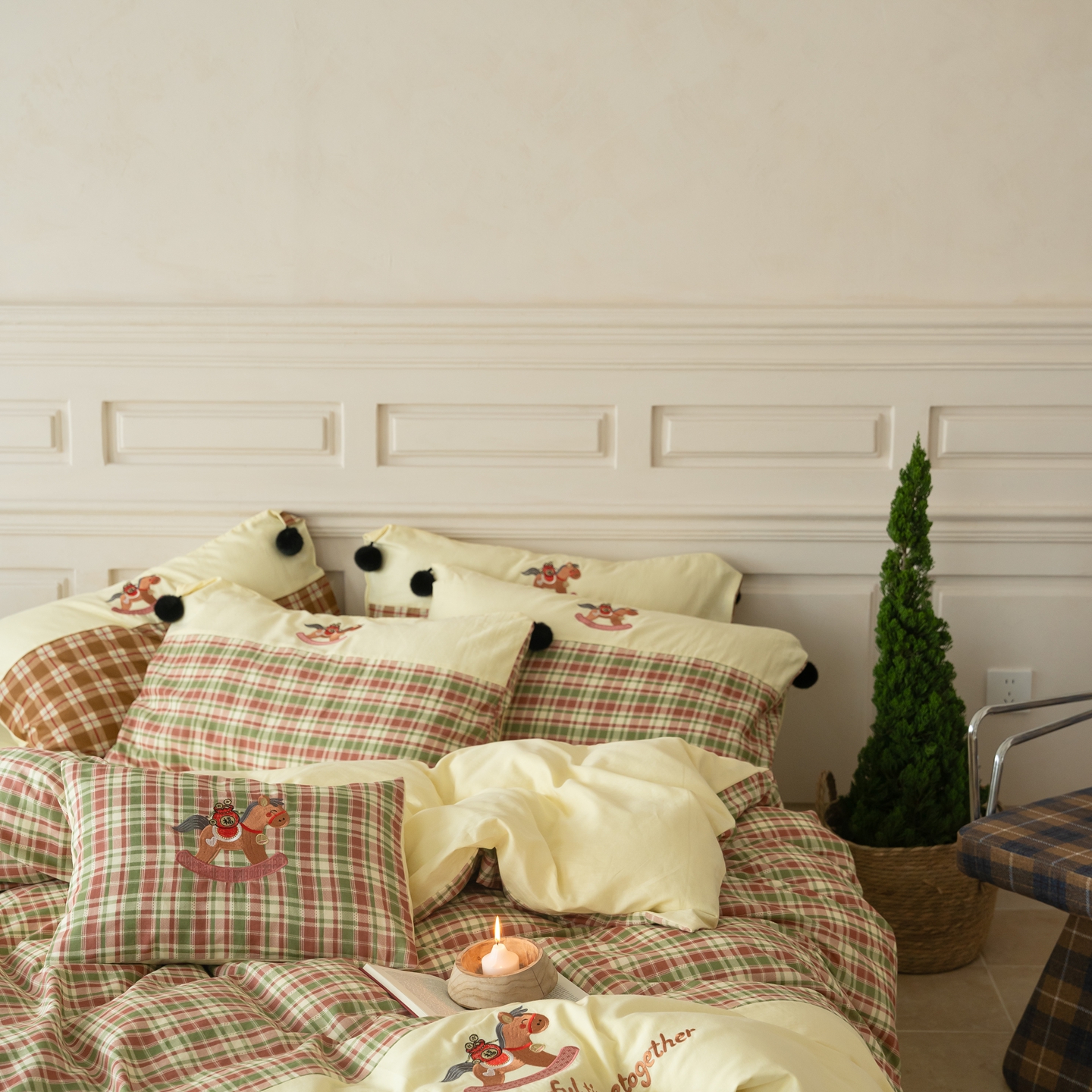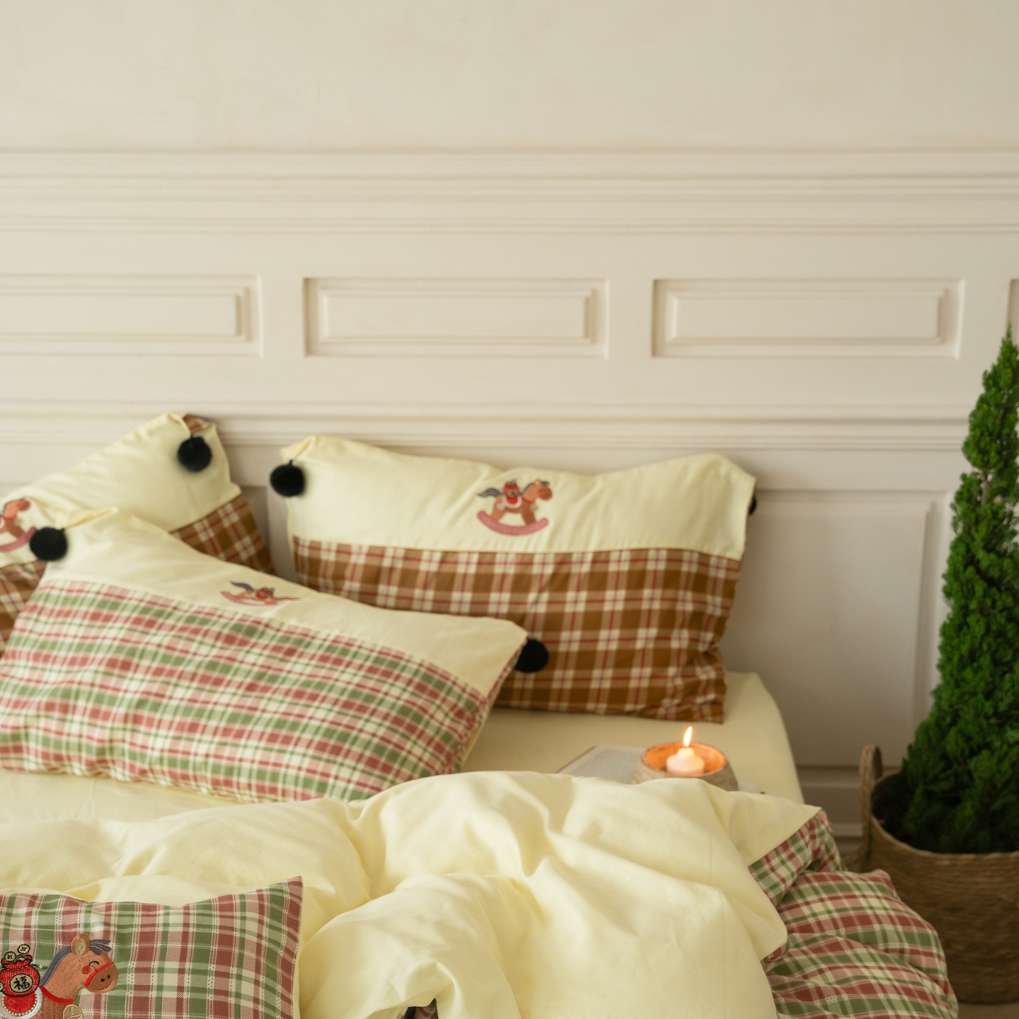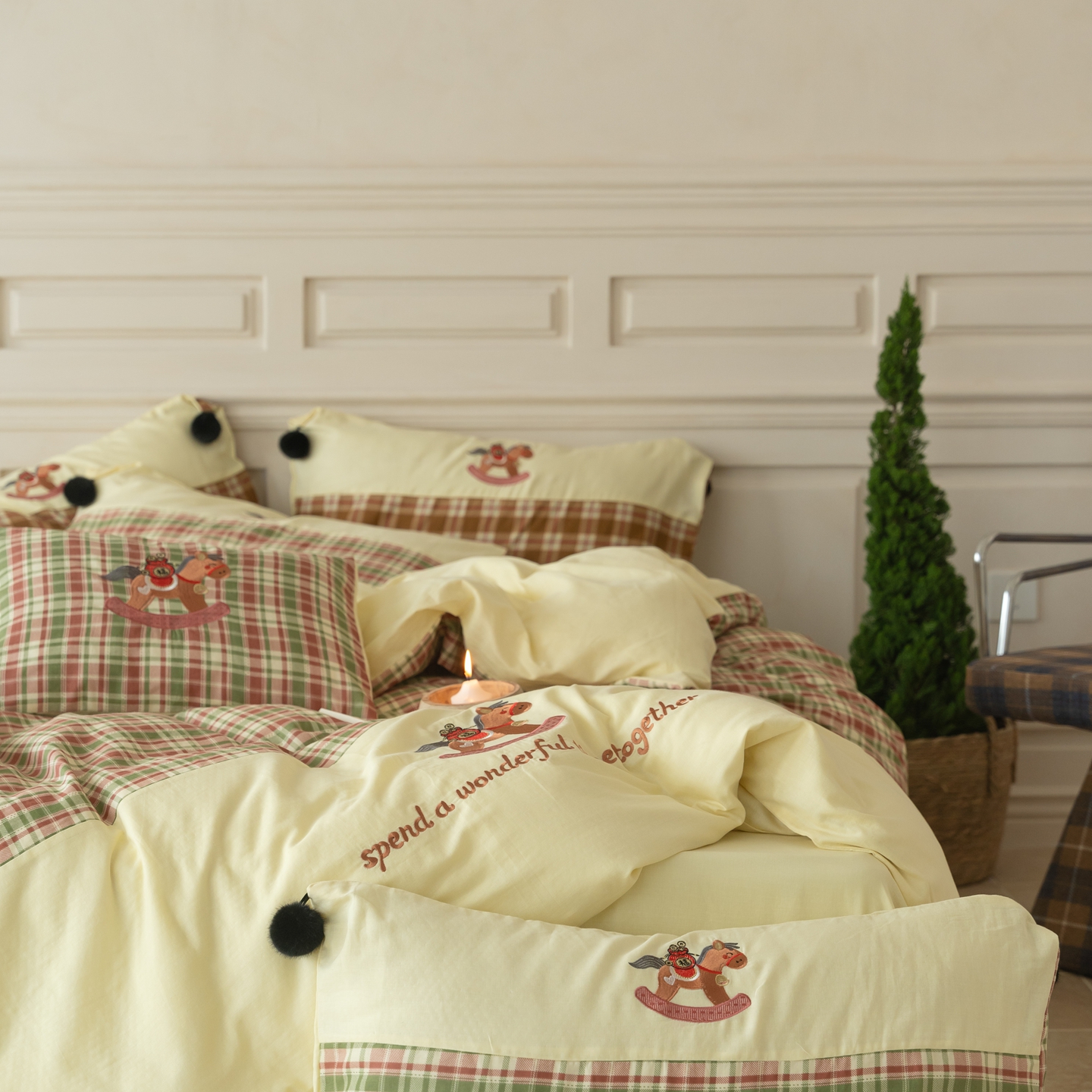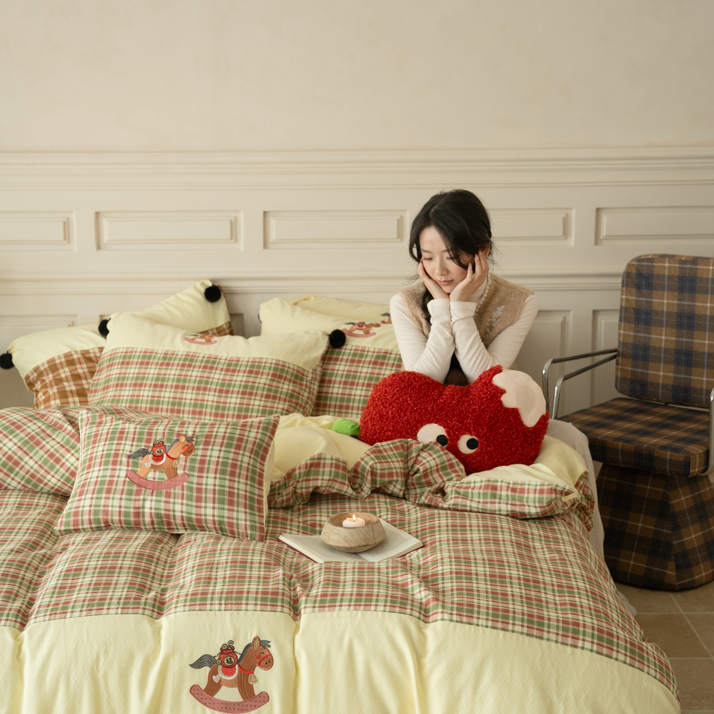 (总)优然居家纺 2026新款全棉双层纱刺绣四件套-马上有钱(控价260/328/348),马上有钱-黑格,马上有钱-黄格,马上有钱-绿格