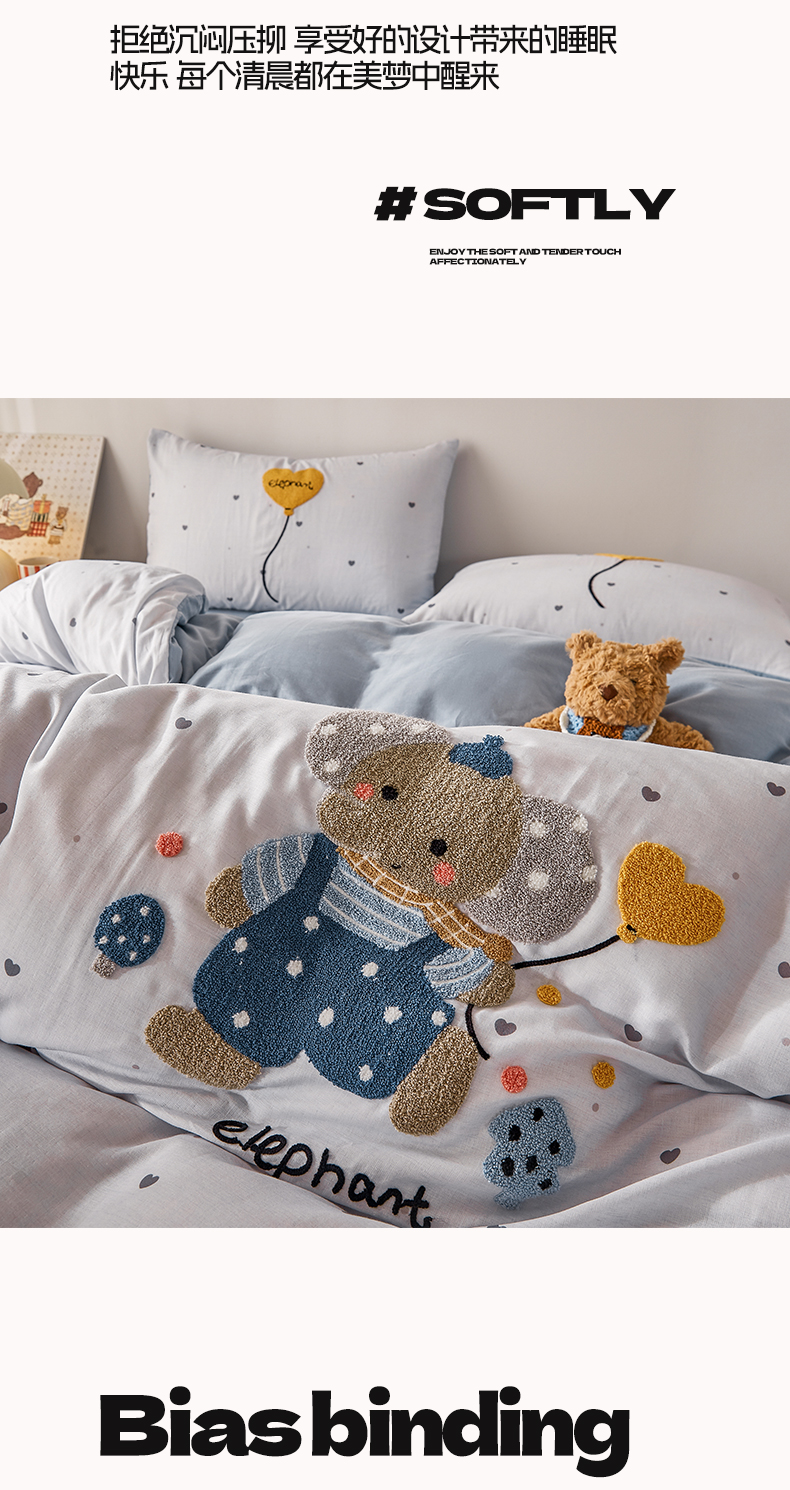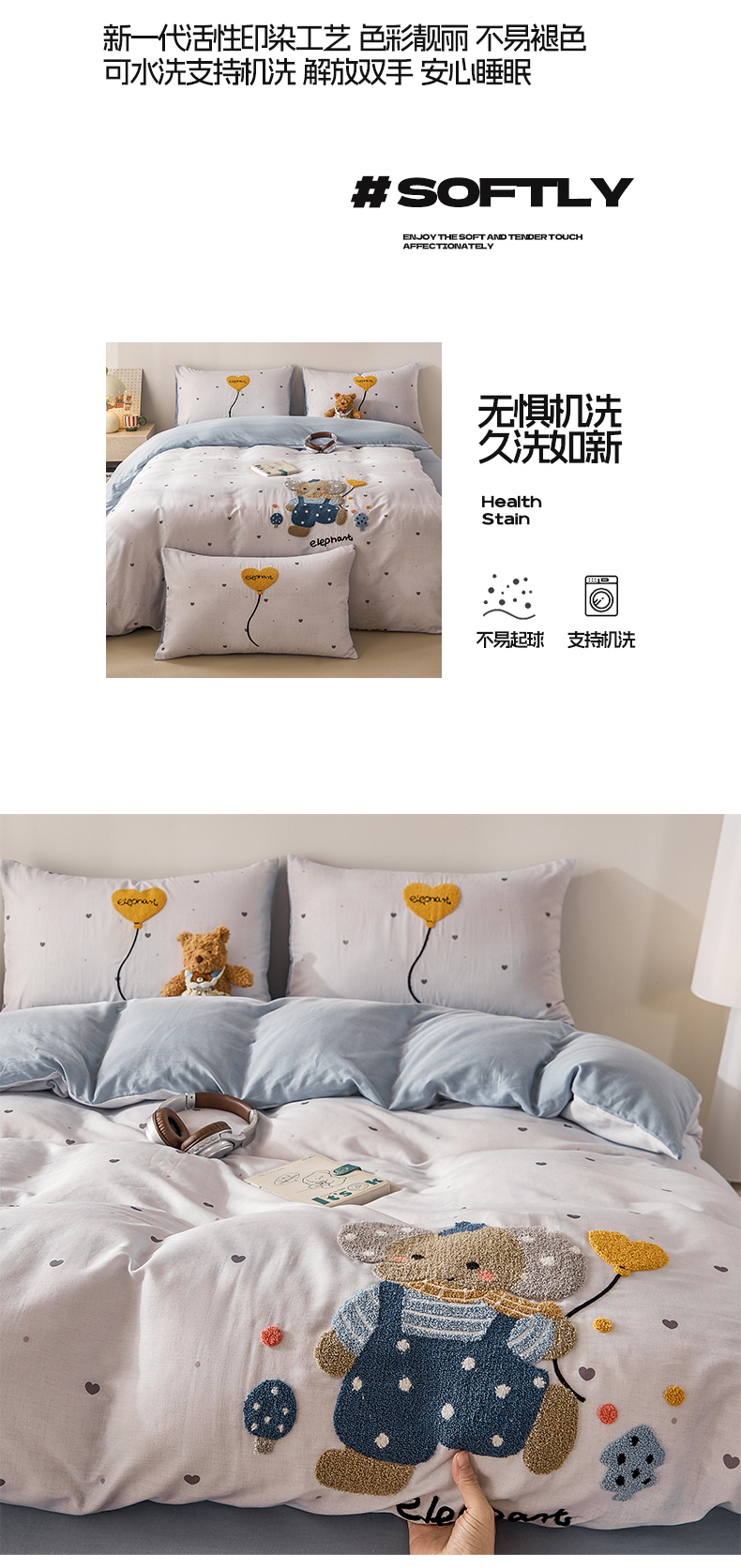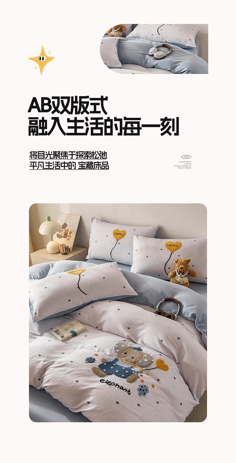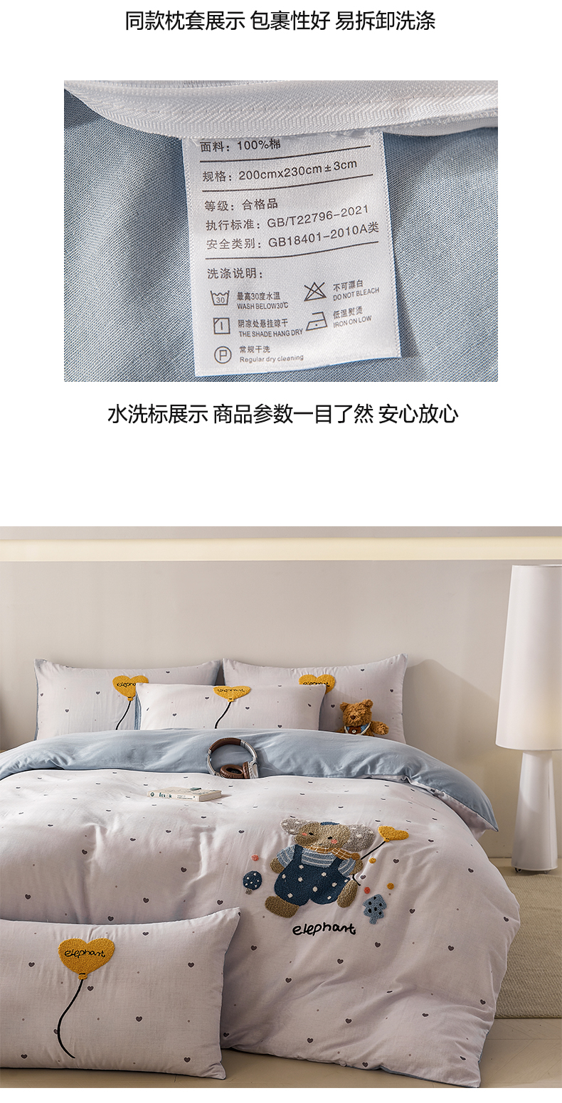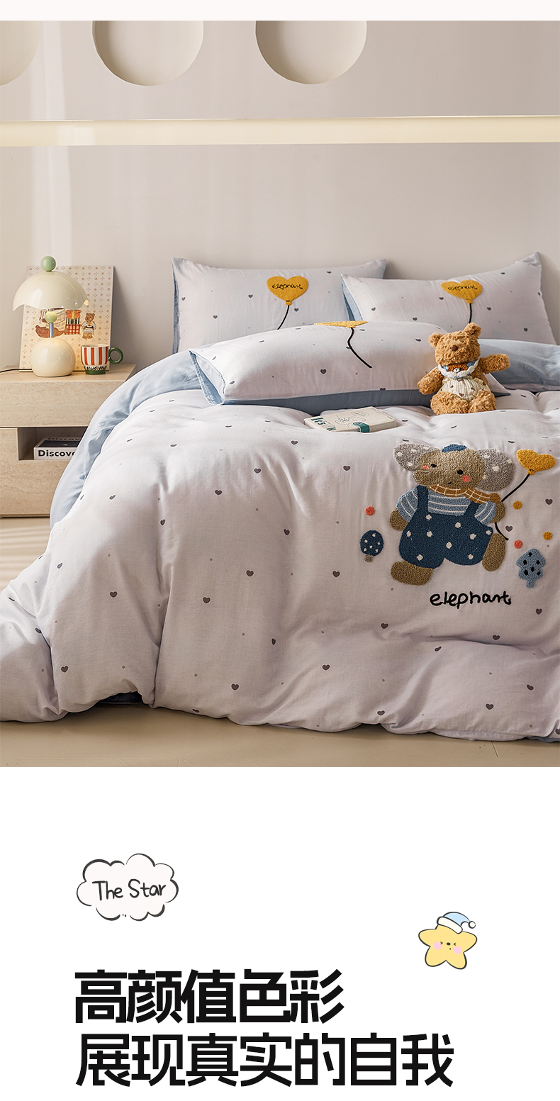 商品名称:宜家坊 2026新款A类全棉双层纱毛巾绣四件套 气球小象
