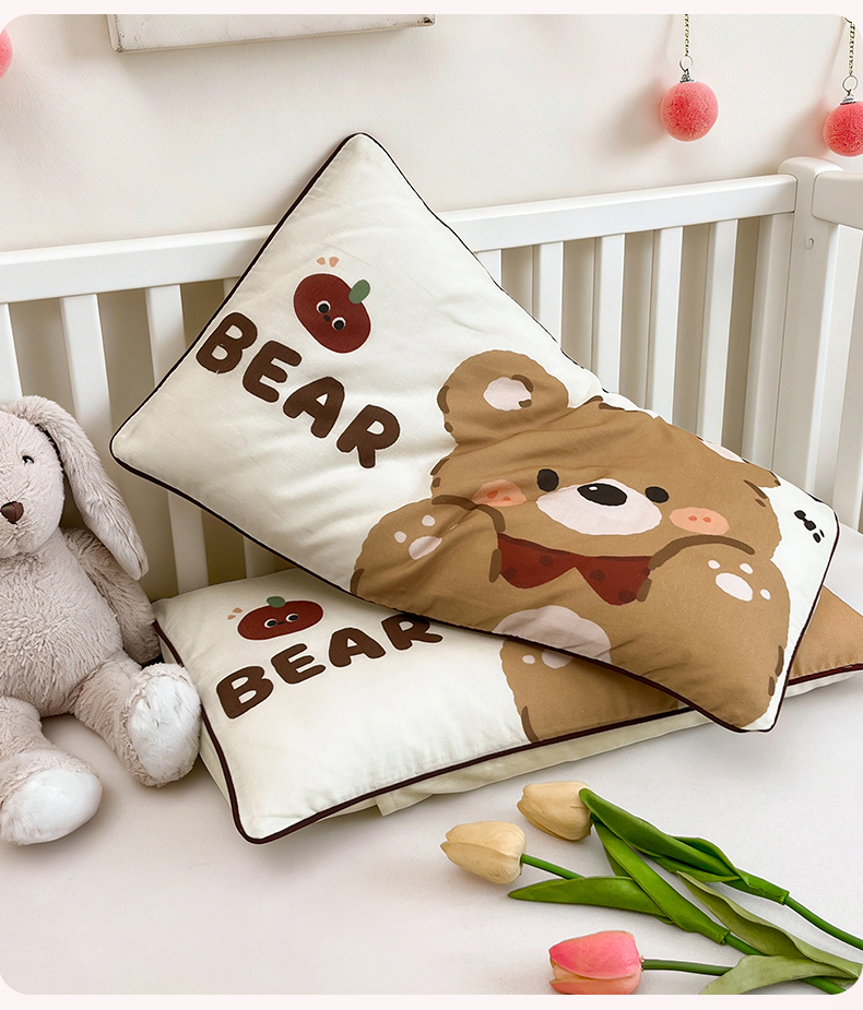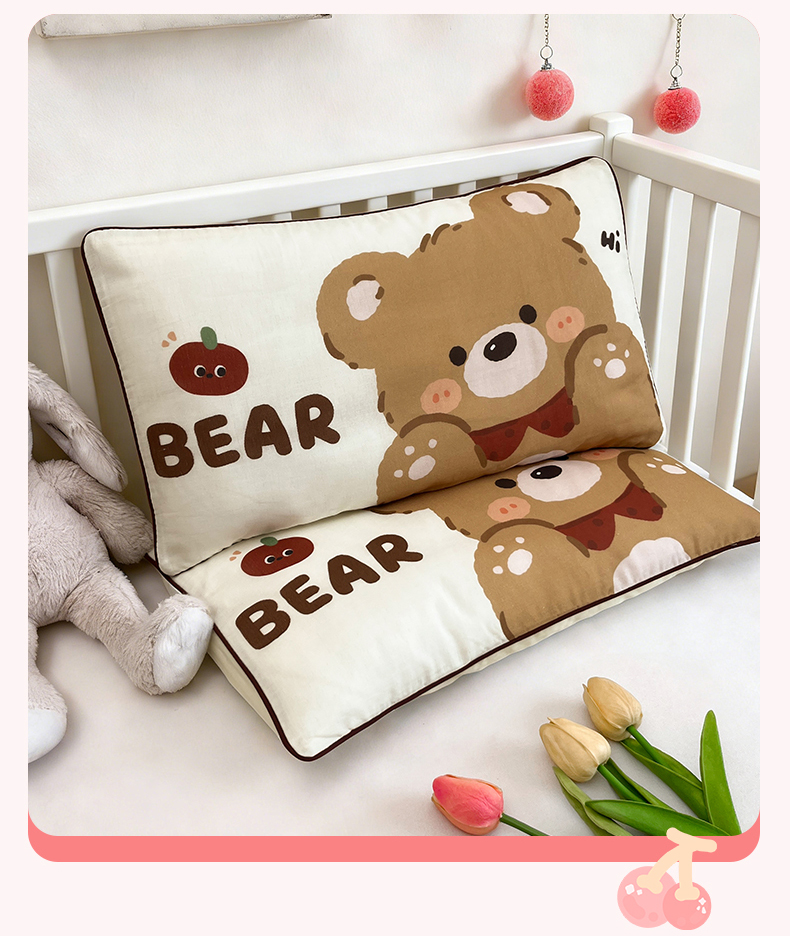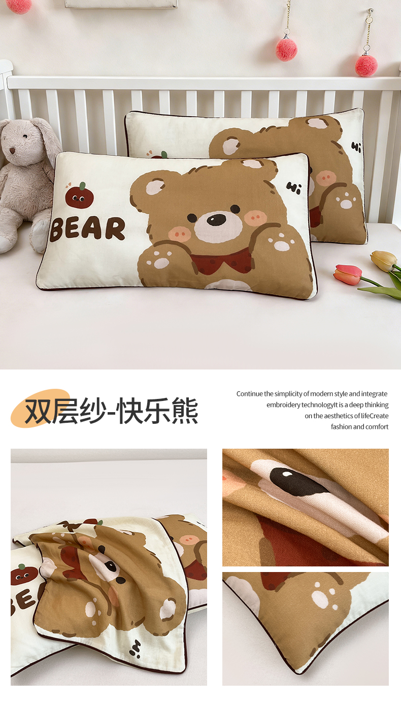 雯豆家纺 2026新款全棉双层纱布枕套儿童卡通枕芯定位纯棉大版枕头套 双层纱-小熊猫