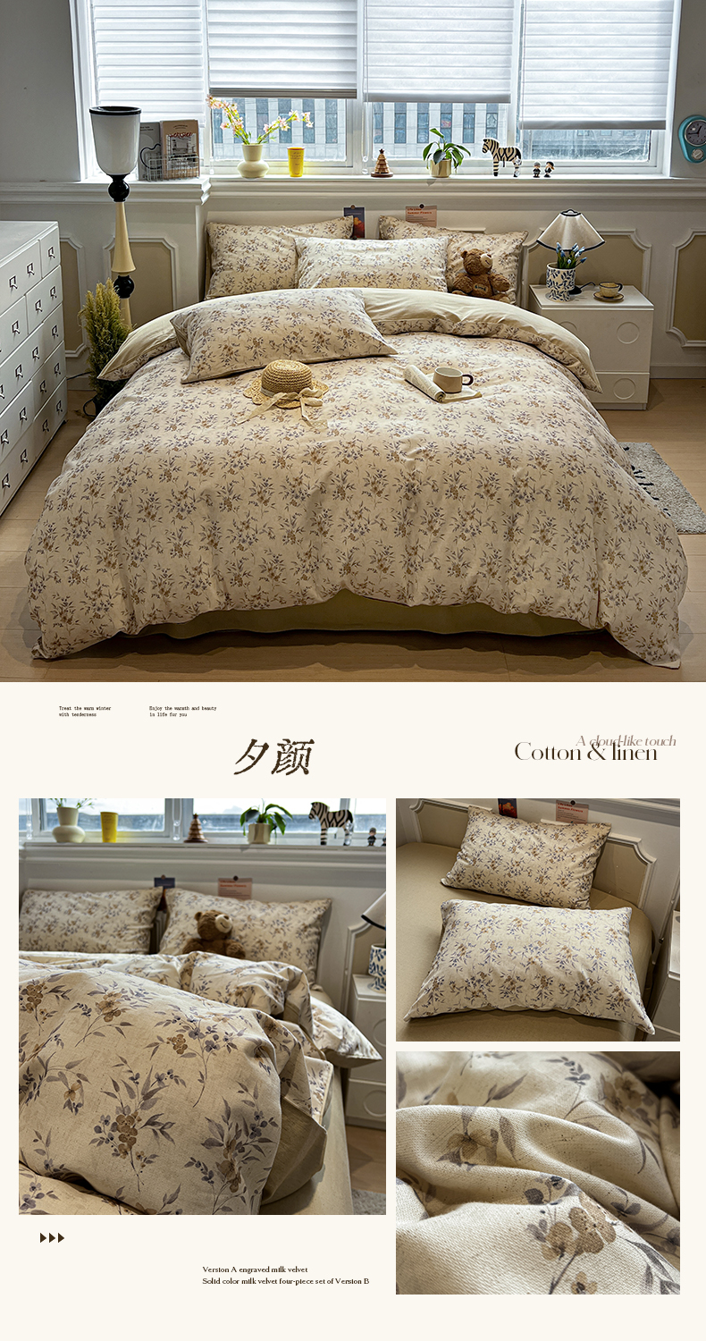 (总)忆生活家纺 2026新款复古田园风棉麻四件套,组合图仅供展示,奶茶兔,初夏-绿,花颜-粉,林夕-绿,绿野,绿茵-绿,墨染,趣味小象,素影,夕颜,悠然-红,知夏-咖