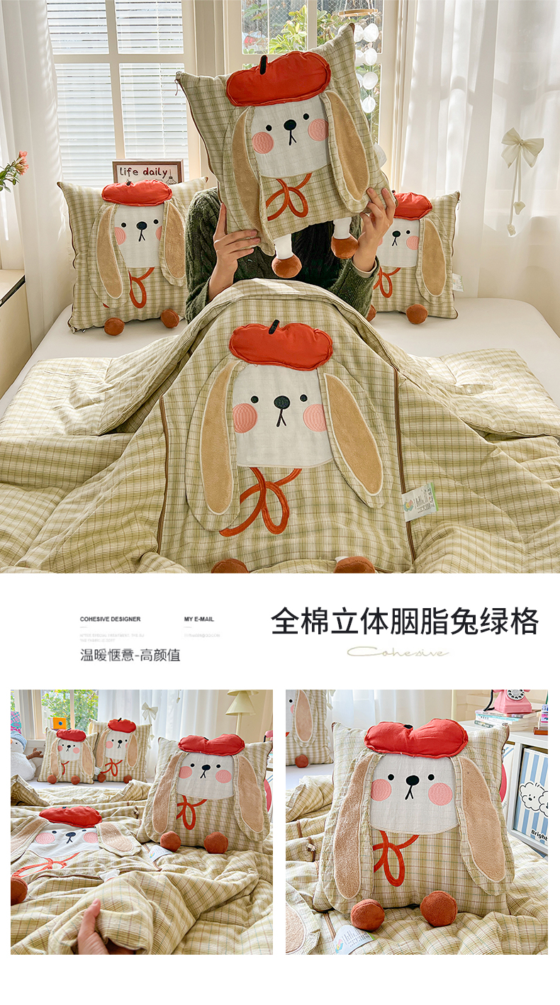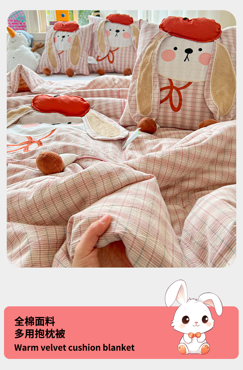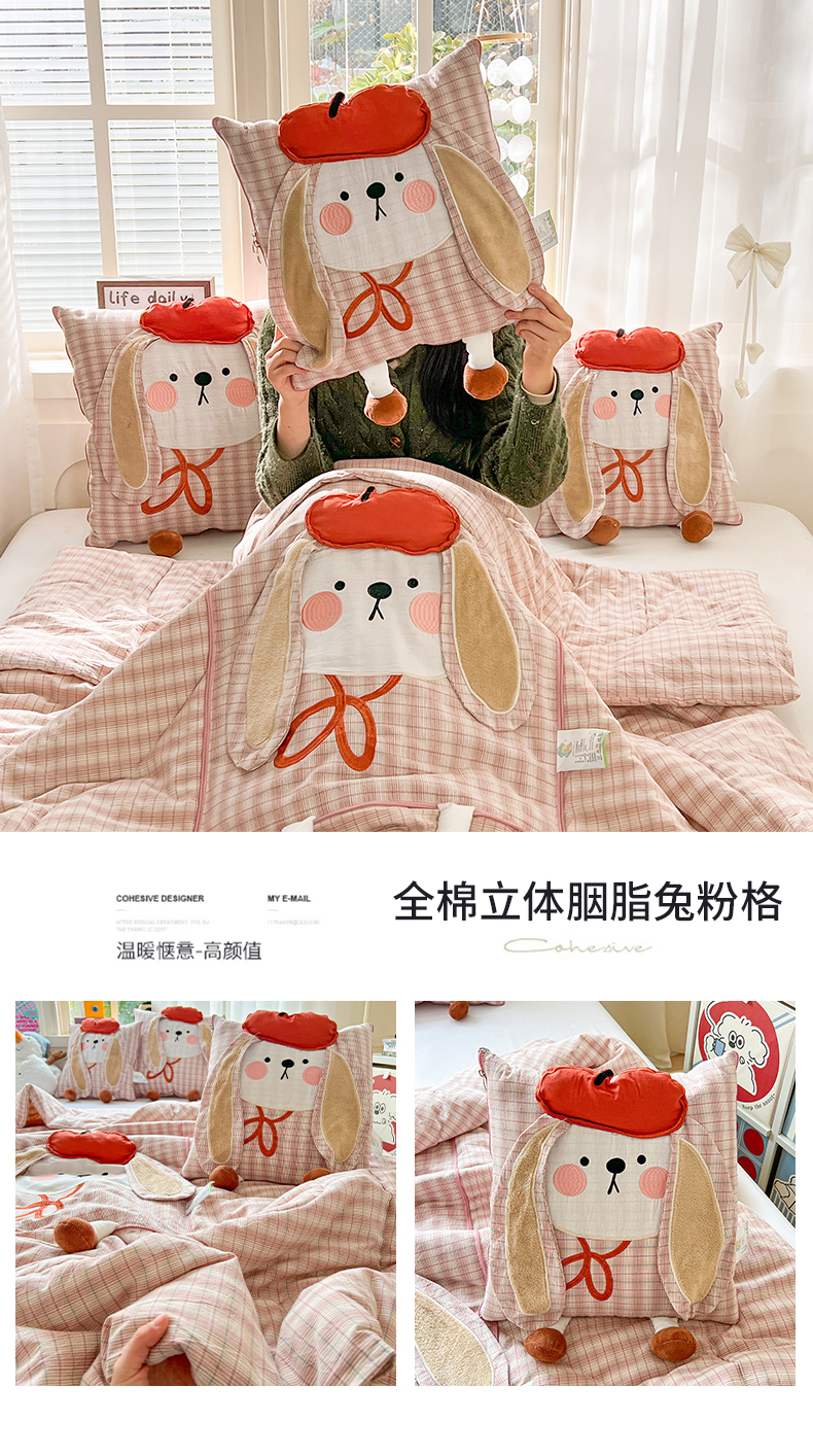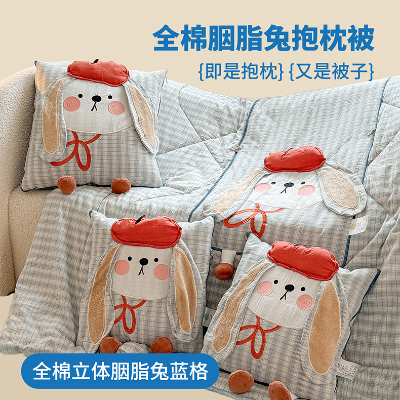 (总)古本家居 2026新款全棉胭脂兔抱枕被系列,全棉立体胭脂兔粉格,全棉立体胭脂兔蓝格,全棉立体胭脂兔绿格