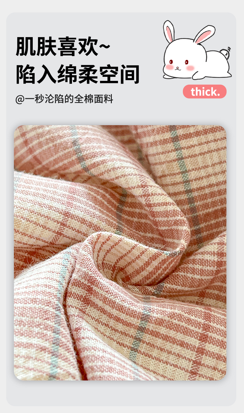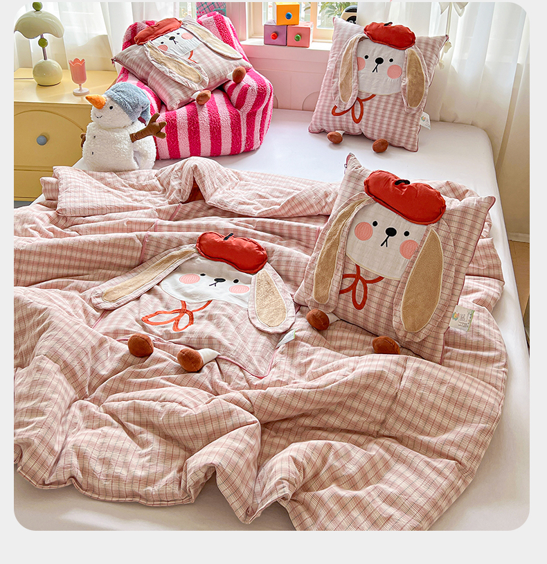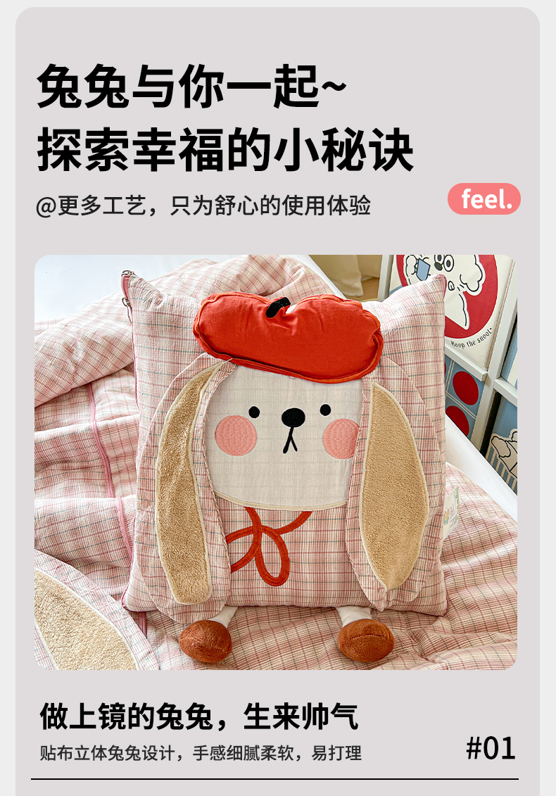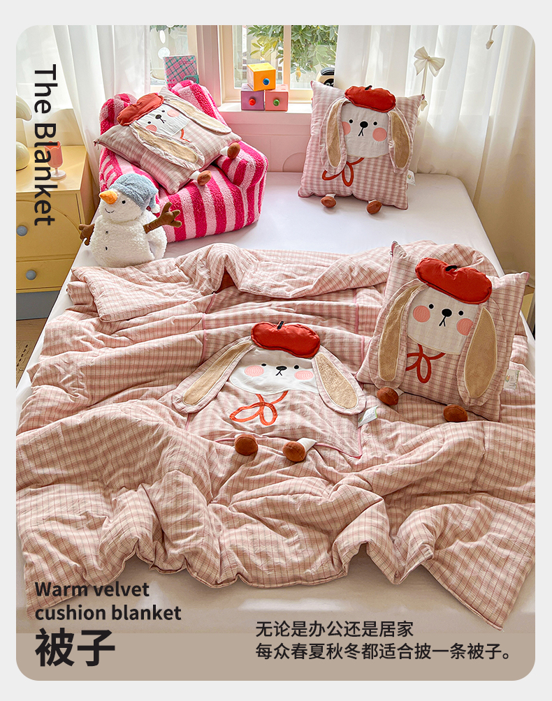 (总)古本家居 2026新款全棉胭脂兔抱枕被系列,全棉立体胭脂兔粉格,全棉立体胭脂兔蓝格,全棉立体胭脂兔绿格
