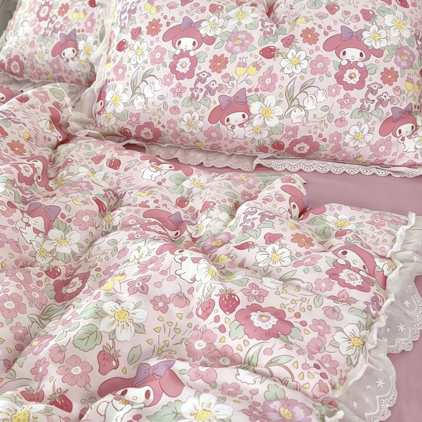 当前位置: 91家纺网 > 商品网购 > 床品套件 > 四件套 > 全棉普通四件套 > 荣轩家居 2026新款三丽鸥正版授权重工韩式蕾丝花边全棉纯棉双层纱四件套(铺床版) 甜梦日记