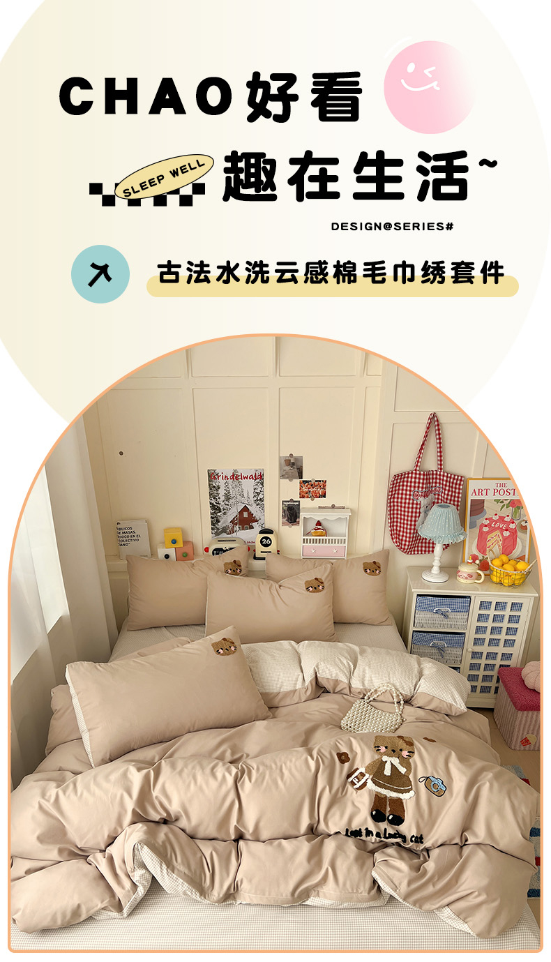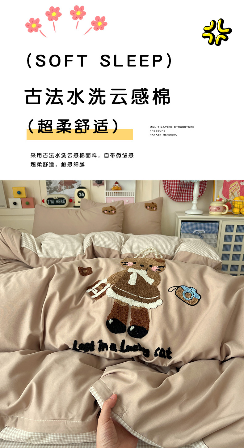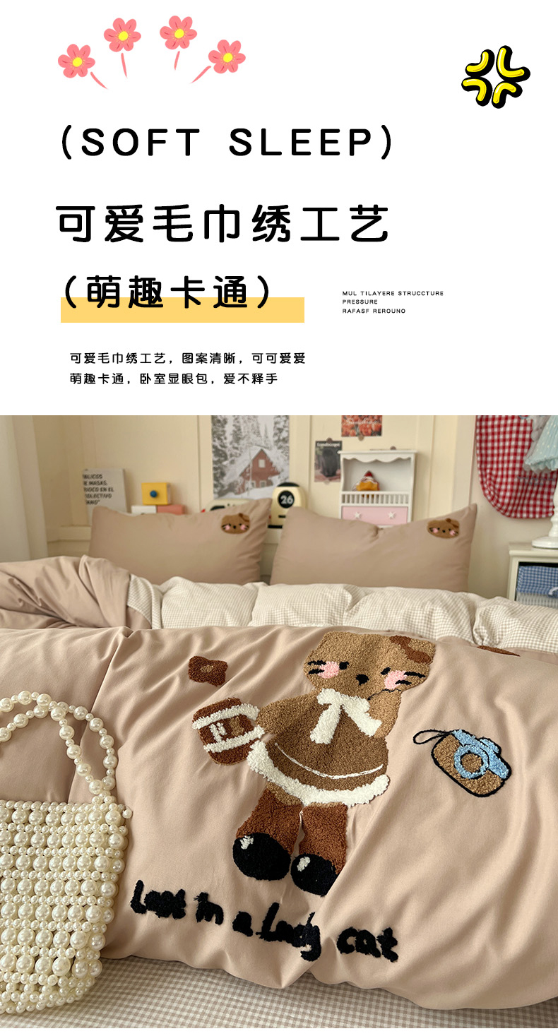 当前位置: 91家纺网 > 商品网购 > 床品套件 > 四件套 > 化纤普通四件套 > 鑫佳居 2026新款古法水洗云感棉毛巾绣四件套 奶茶KT猫