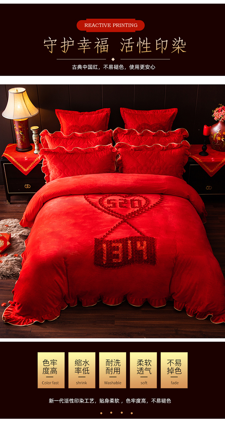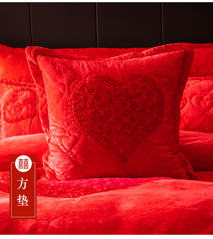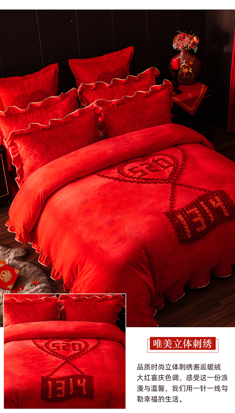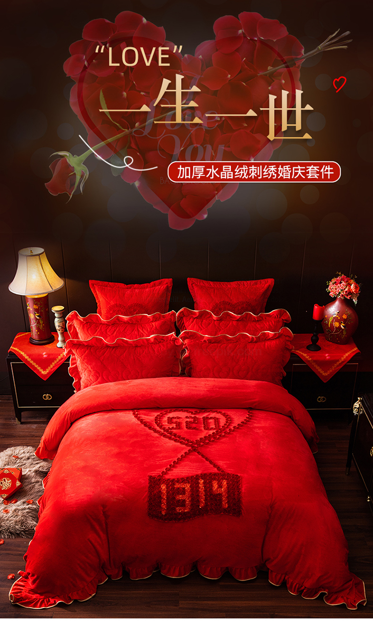 当前位置: 91家纺网 > 商品网购 > 床品套件 > 四件套 > 婚庆四件套 > 宜凡家纺 2019加厚水晶绒刺绣婚庆套件 一生一世