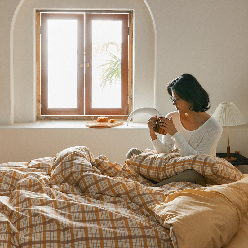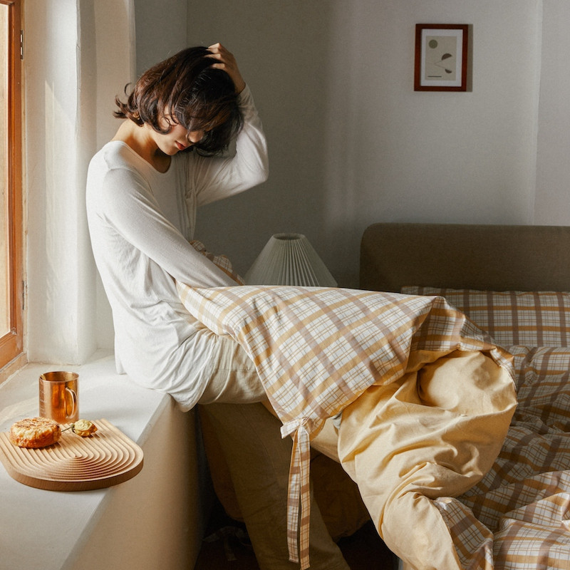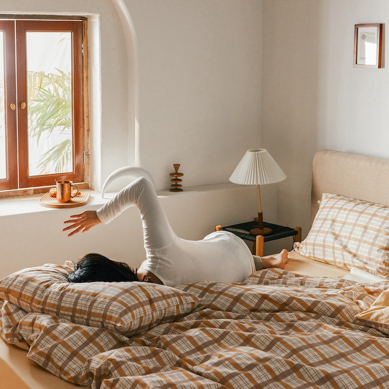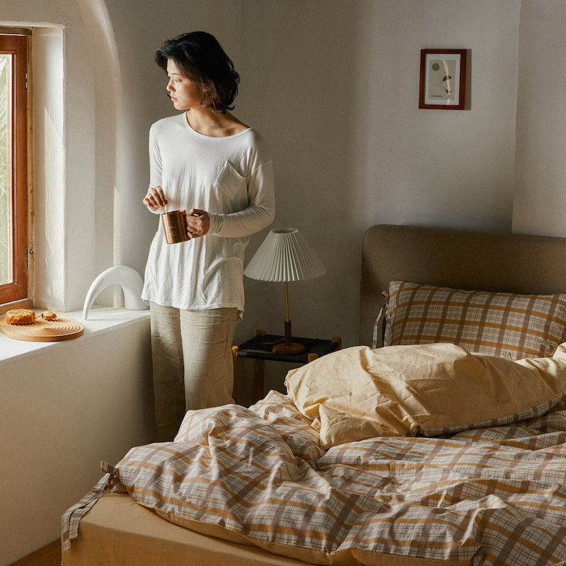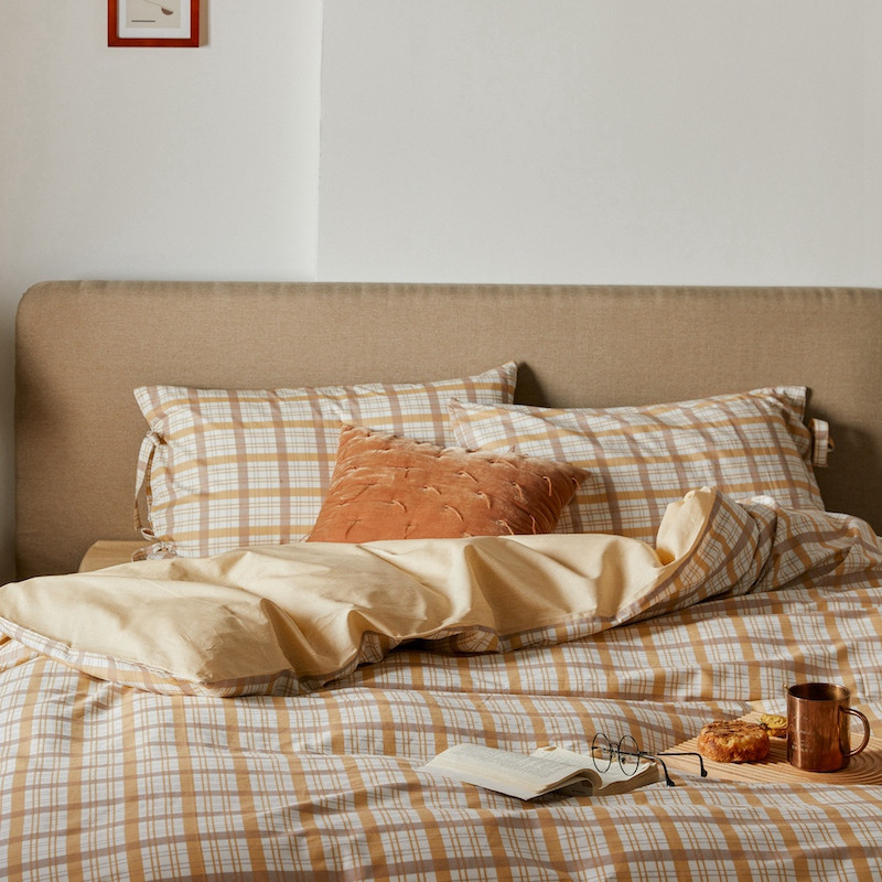 顾里 2020新款全棉系带复古格纹四件套 奶茶格