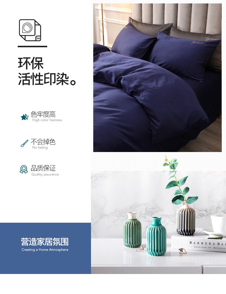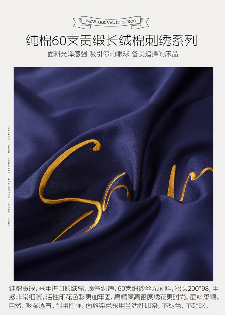 商品名称:2021新款纯色拼色纯棉全棉60S贡缎长绒棉绣花四件套 丈青